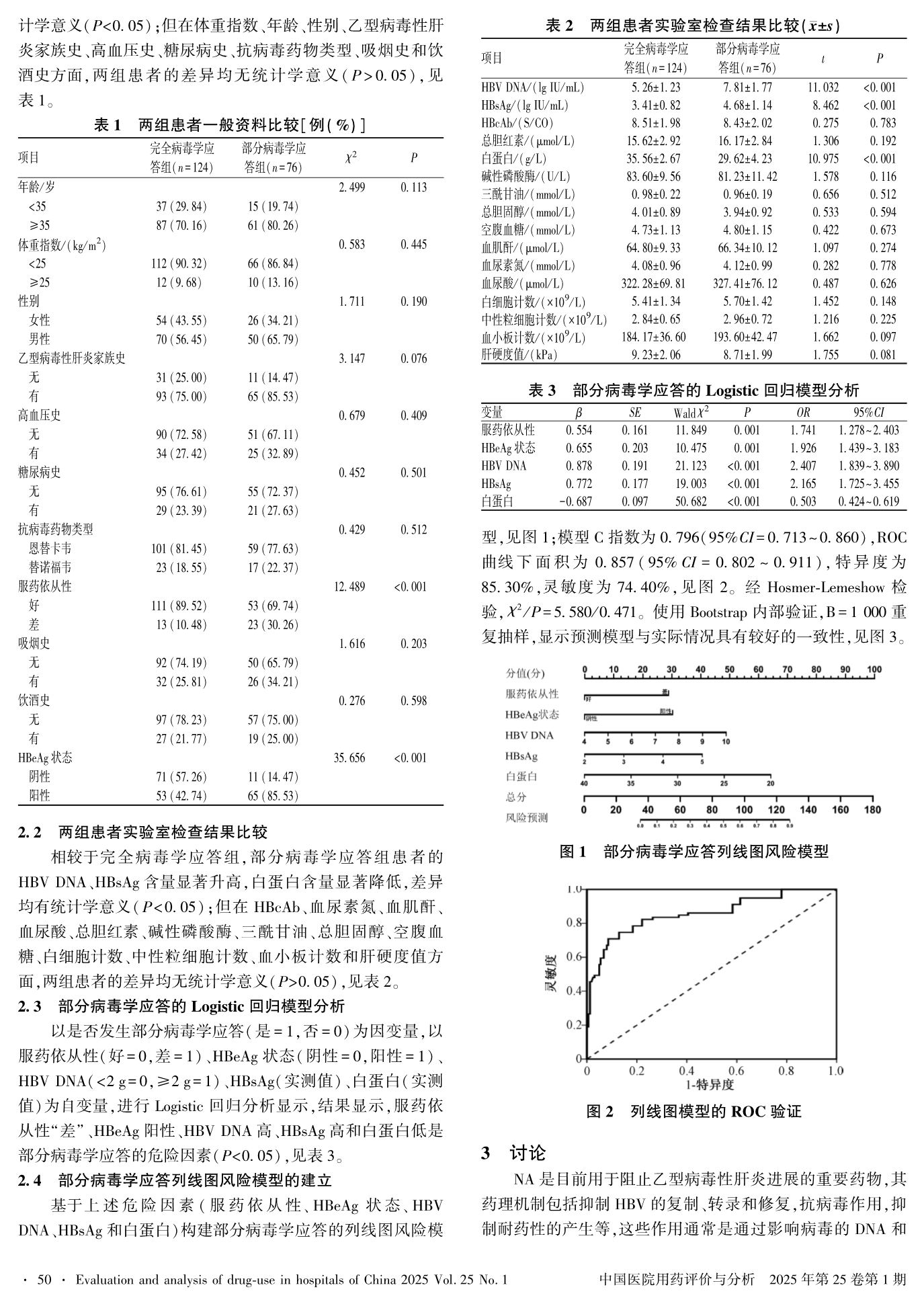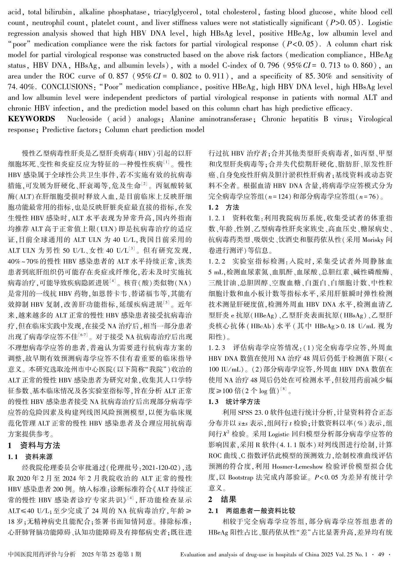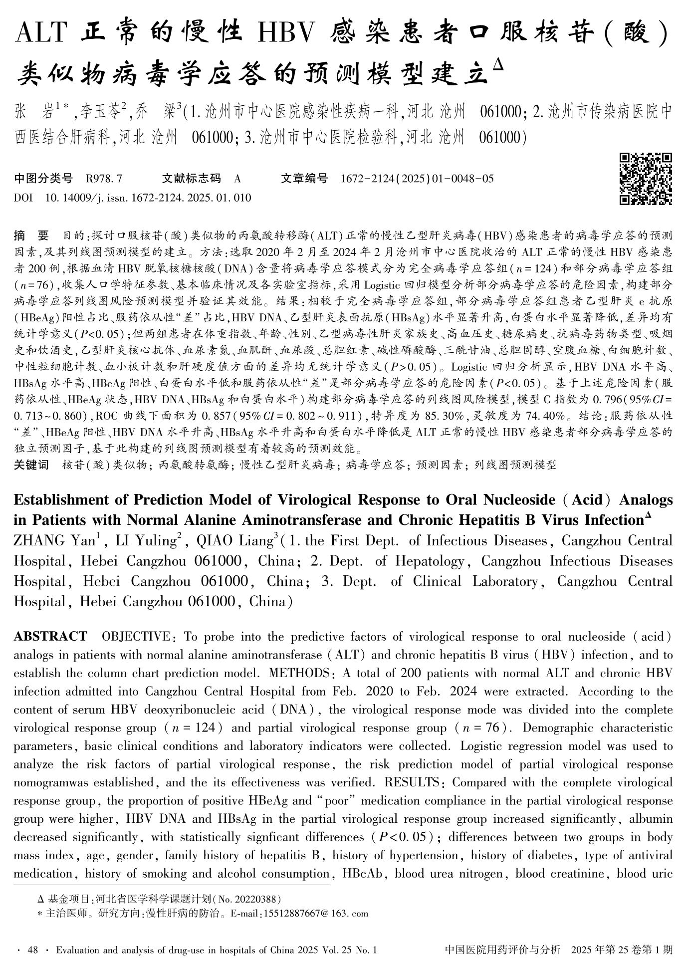ALT正常的慢性HBV感染患者口服核苷(酸)类似物病毒学应答的预测模型建立