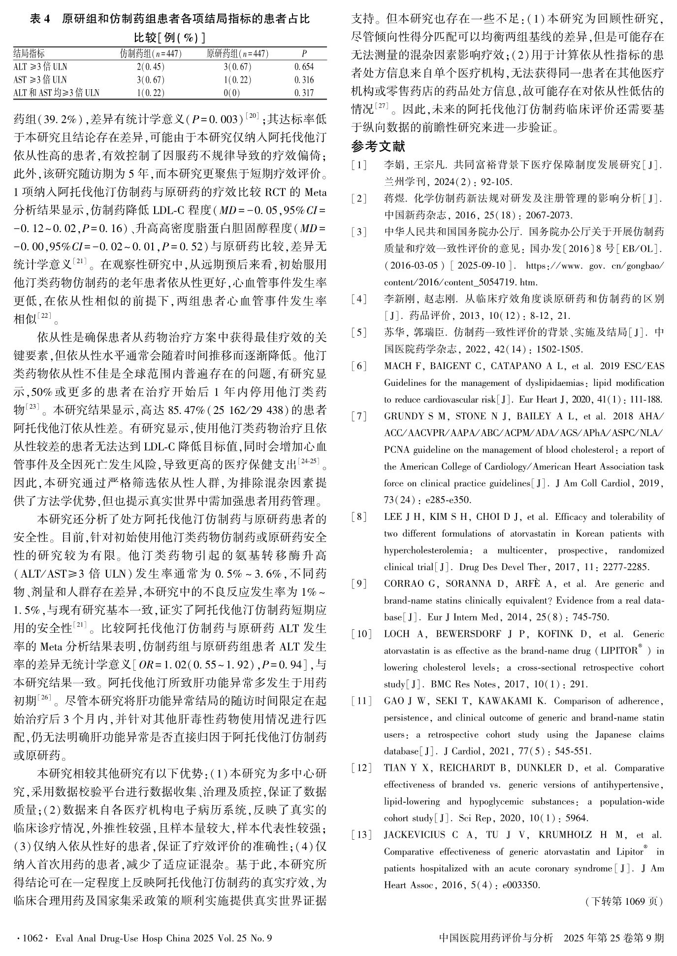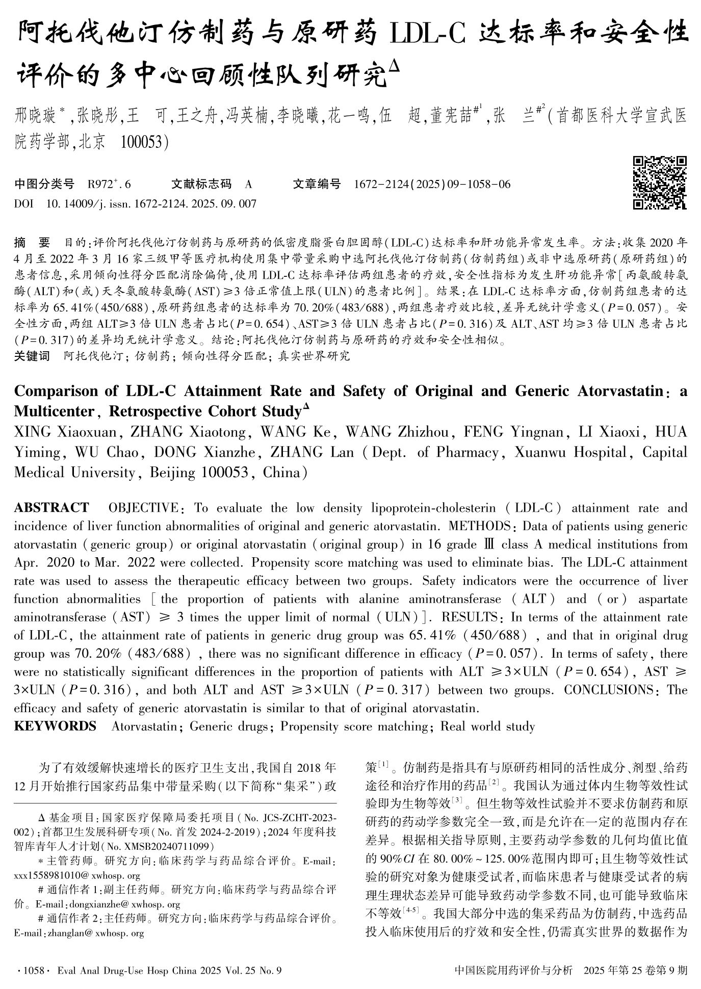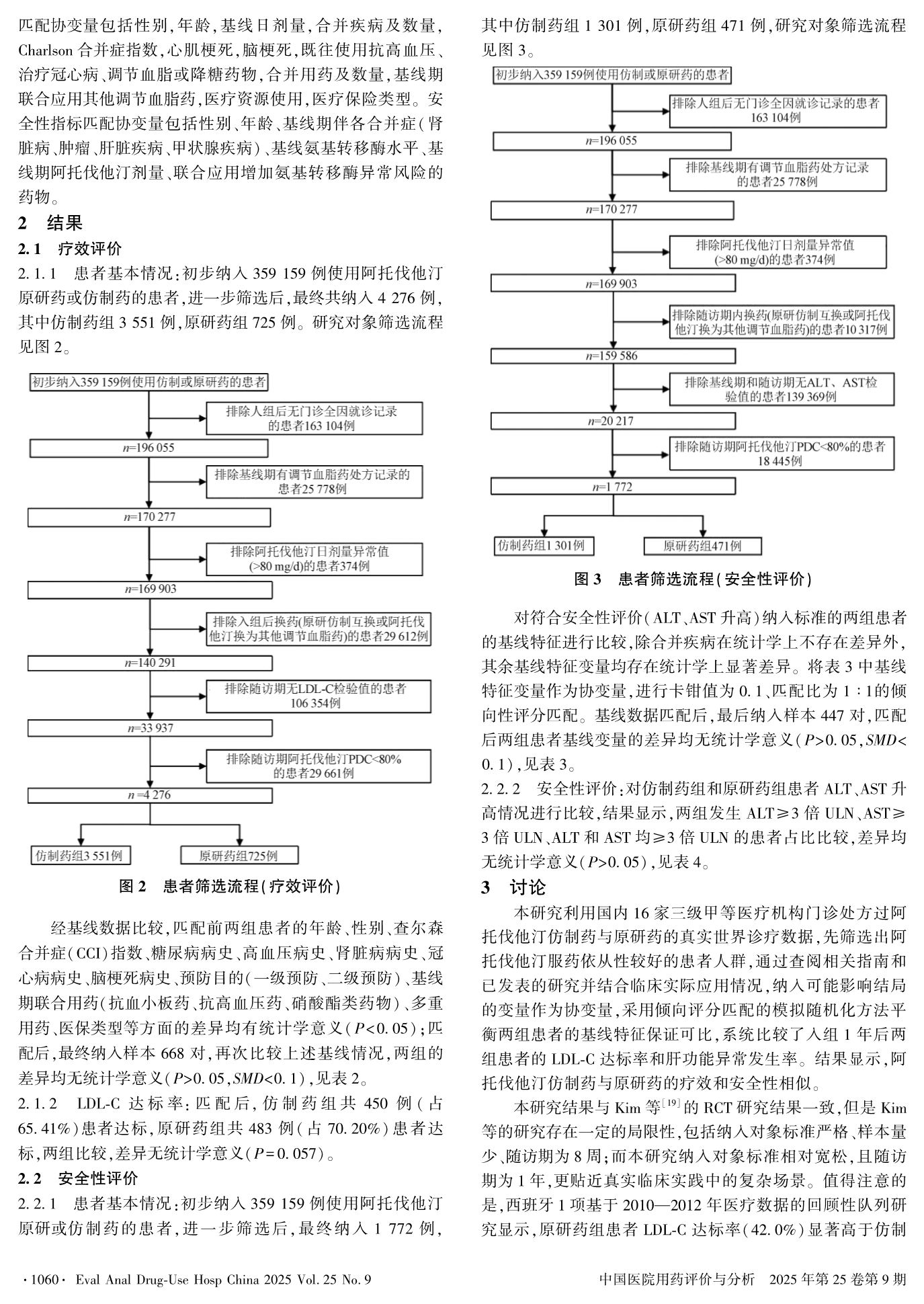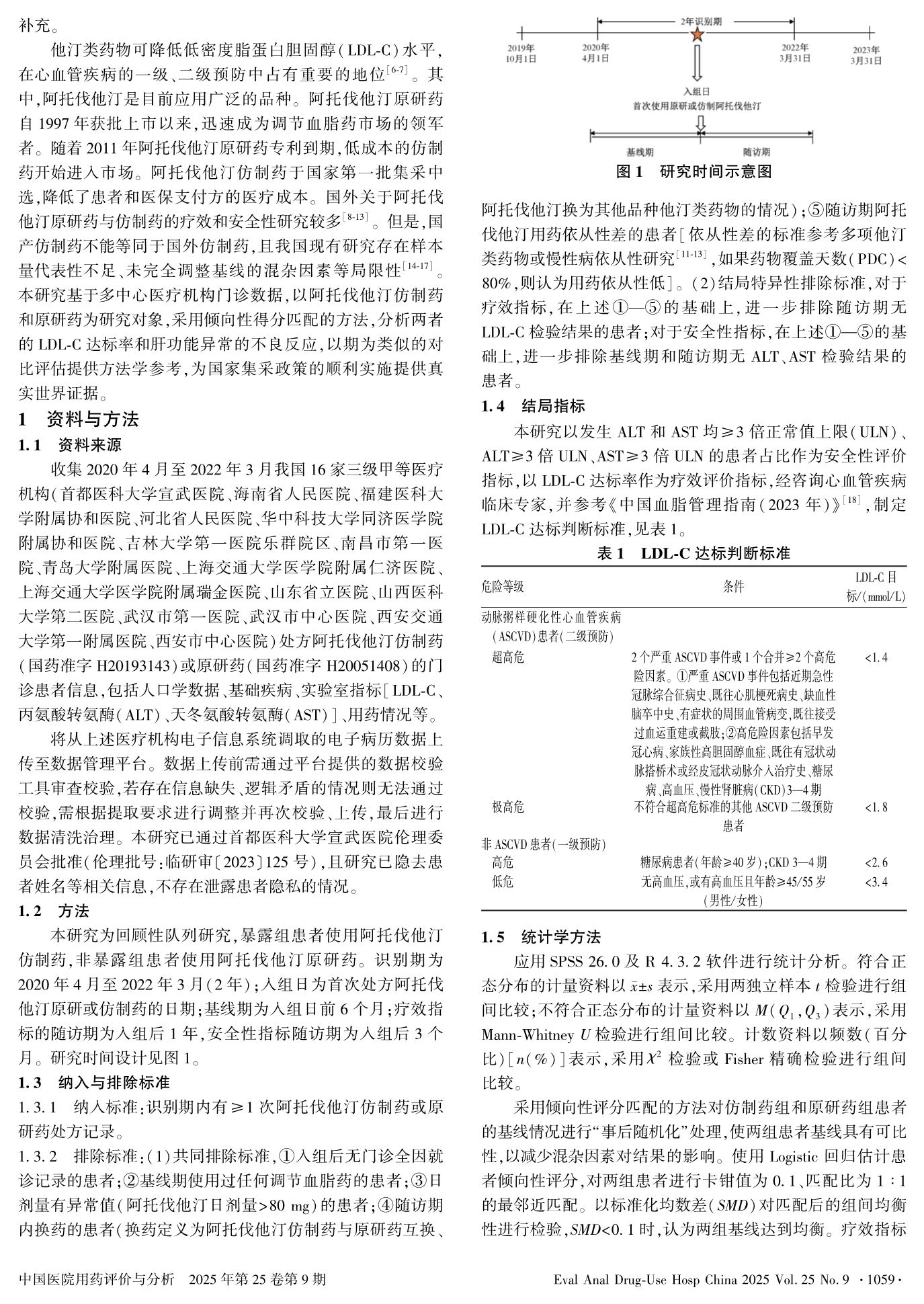 阿托伐他汀仿制药与原研药LDL-C达标率和安全性评价的多中心回顾性队列研究