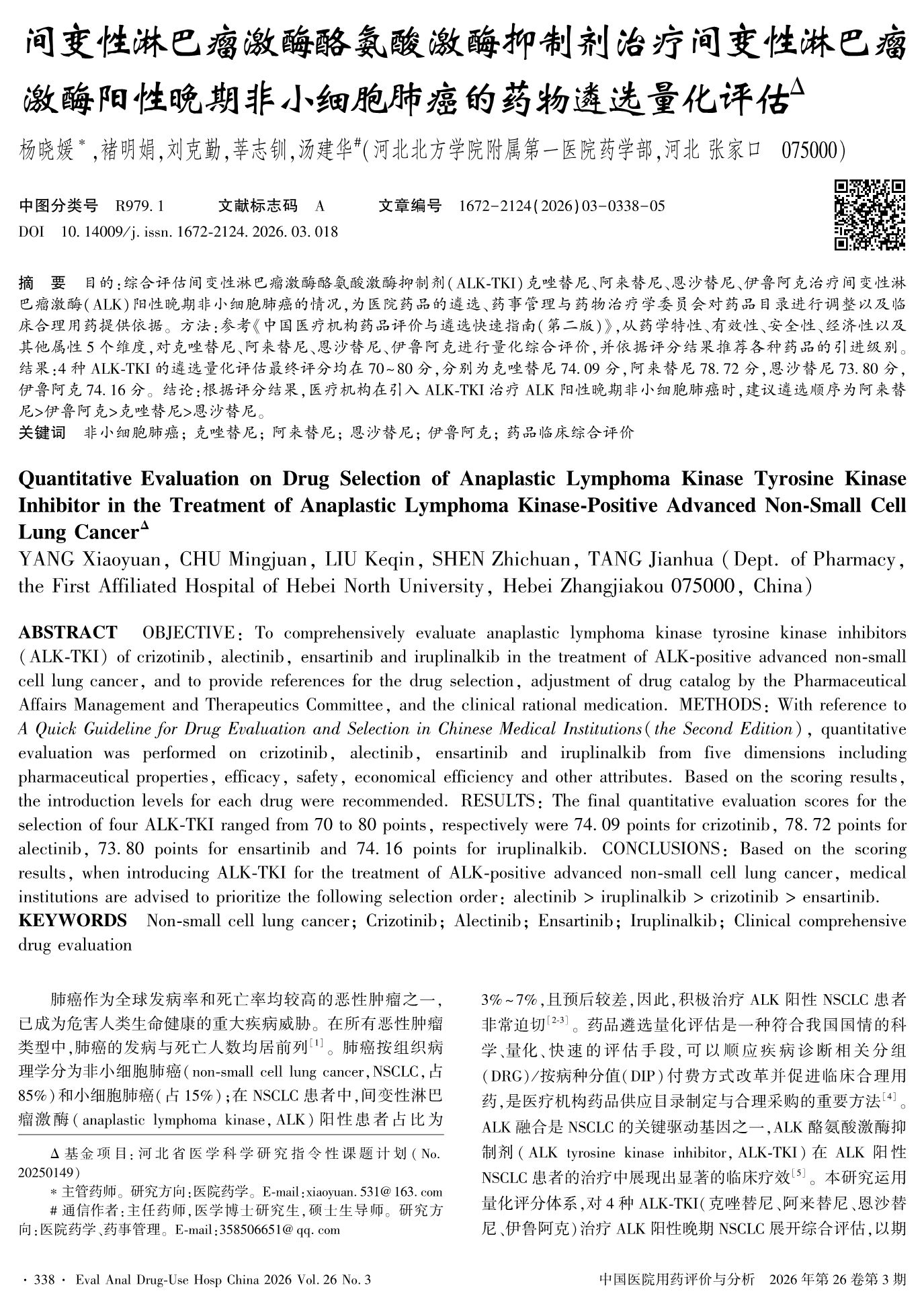 间变性淋巴瘤激酶酪氨酸激酶抑制剂治疗间变性淋巴瘤激酶阳性晚期非小细胞肺癌的药物遴选量化评估