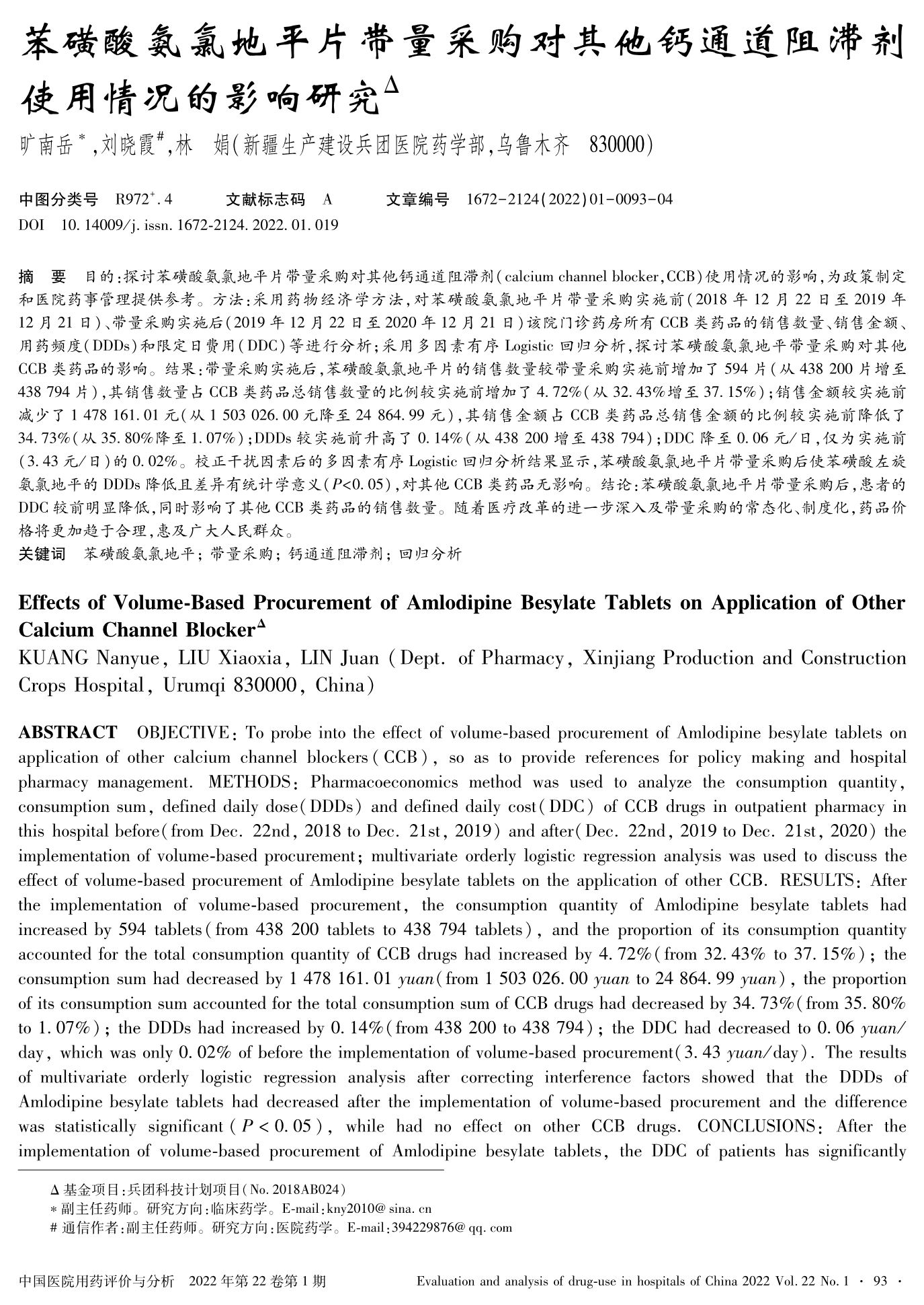 苯磺酸氨氯地平片带量采购对其他钙通道阻滞剂使用情况的影响研究