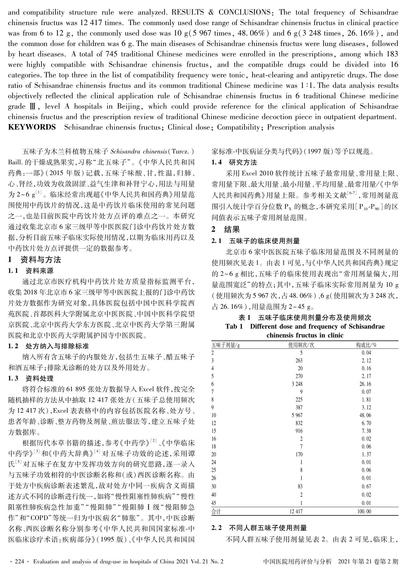 基于北京市6家三级甲等中医医院门诊处方数据分析五味子的临床剂量及应用情况