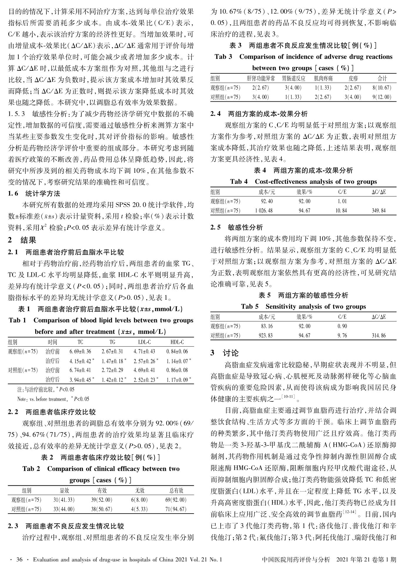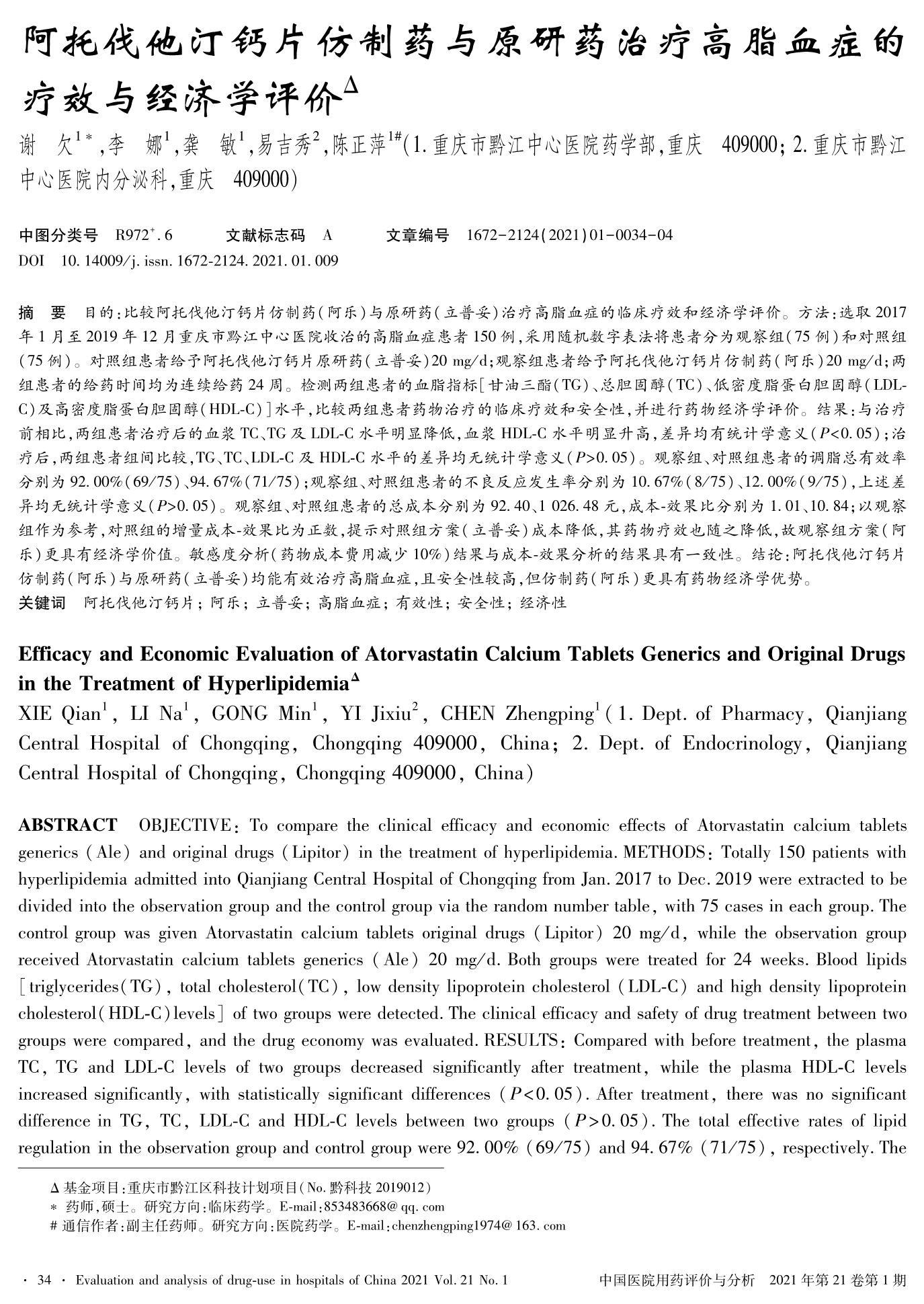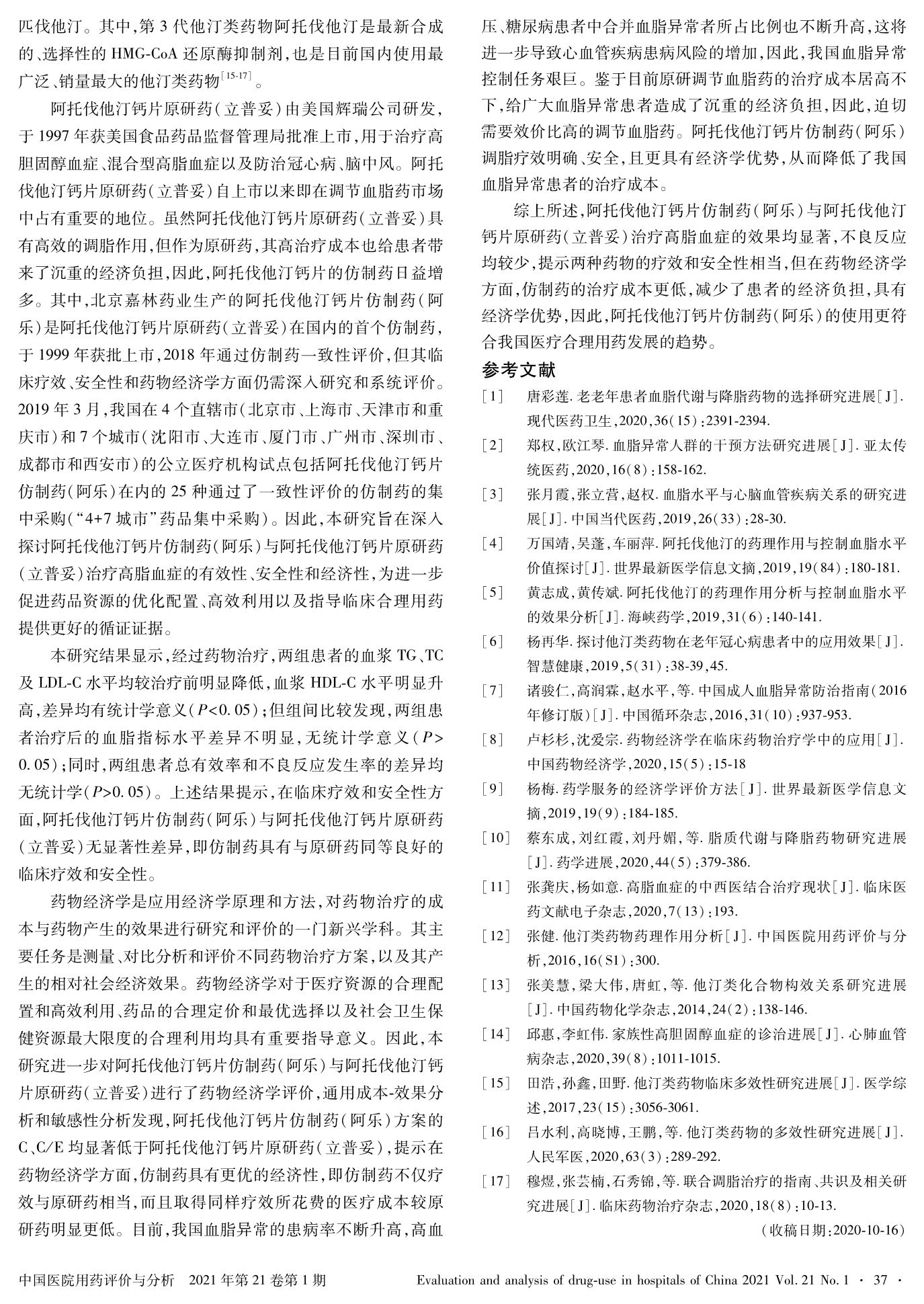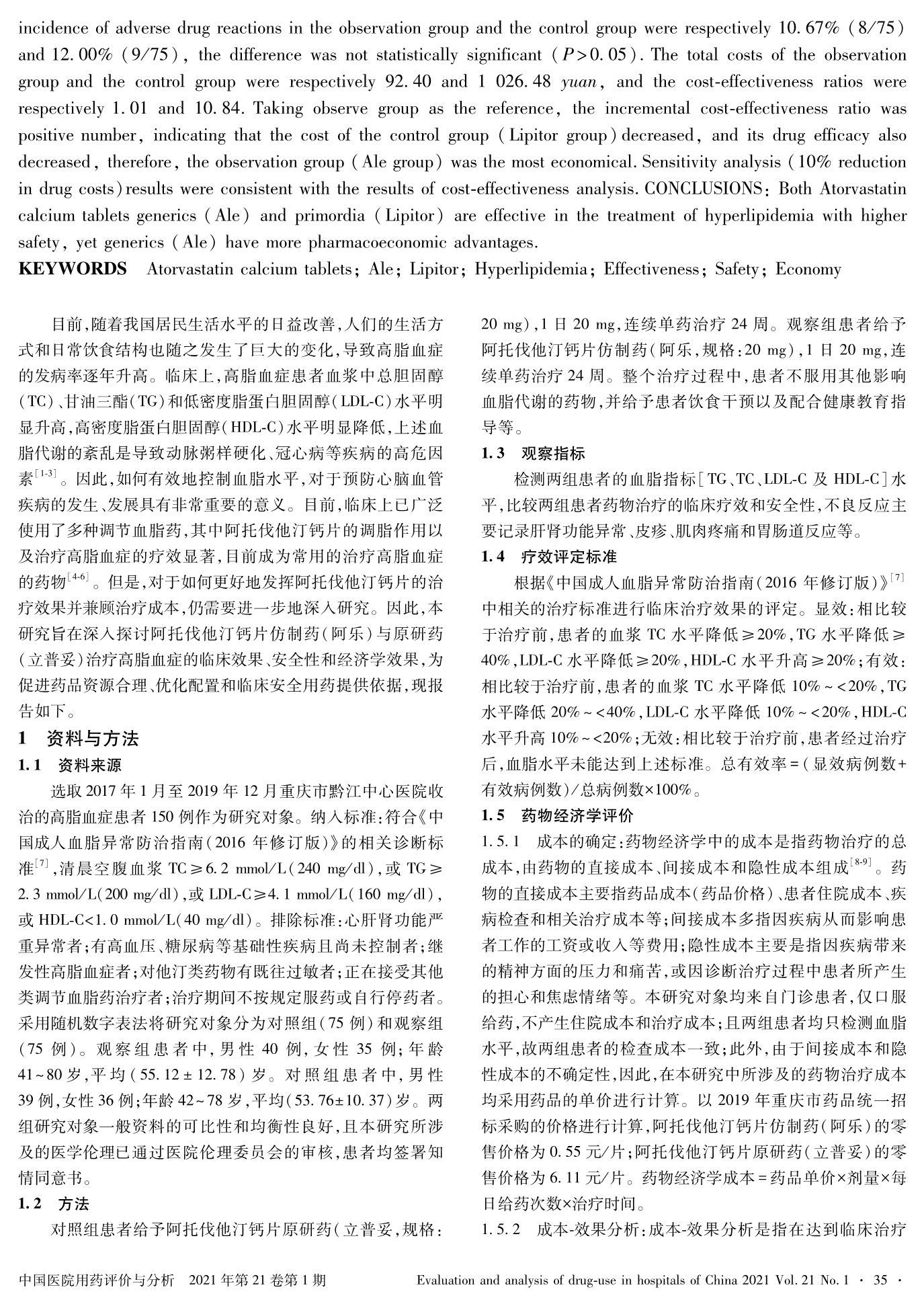 阿托伐他汀钙片仿制药与原研药治疗高脂血症的疗效与经济学评价