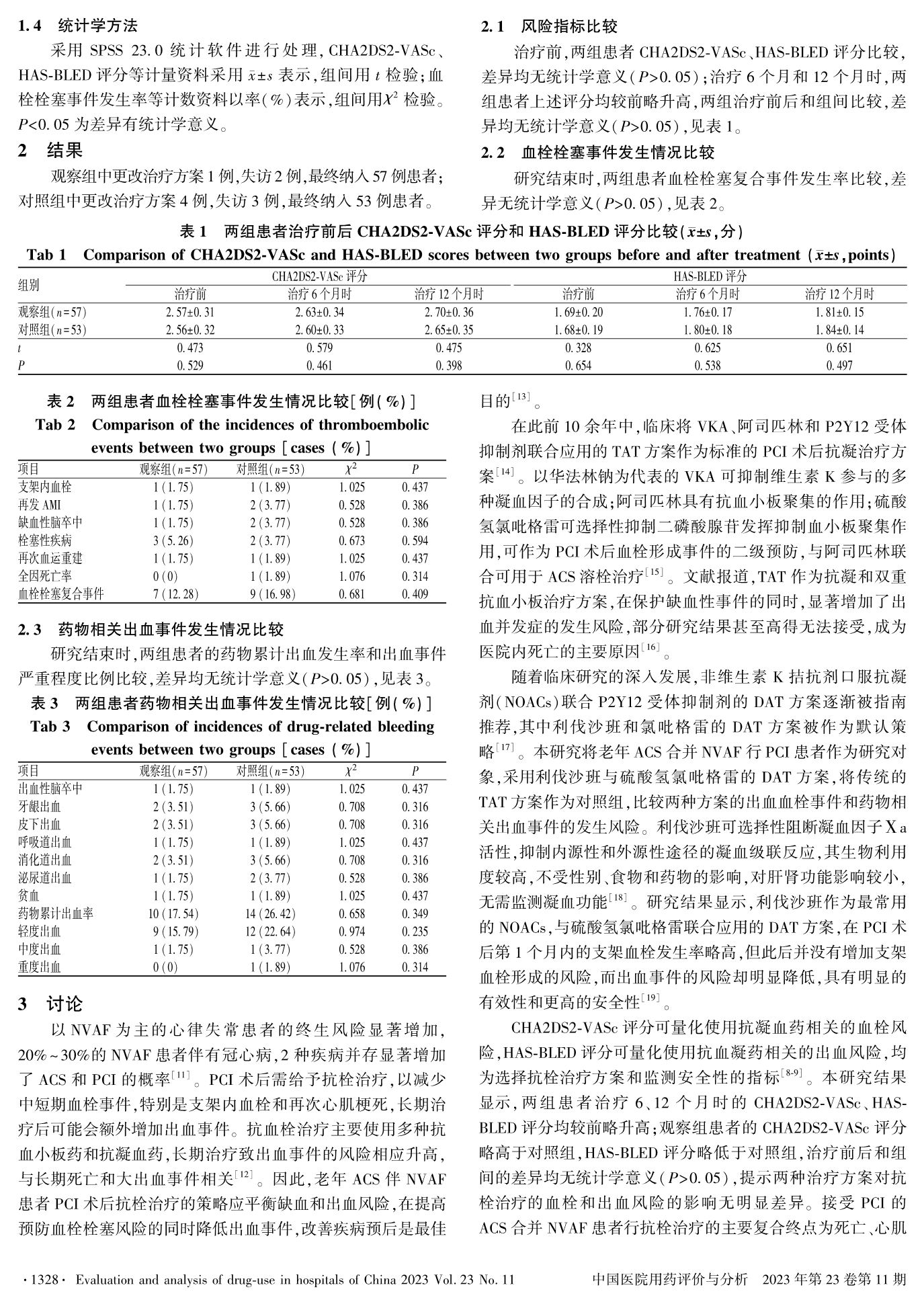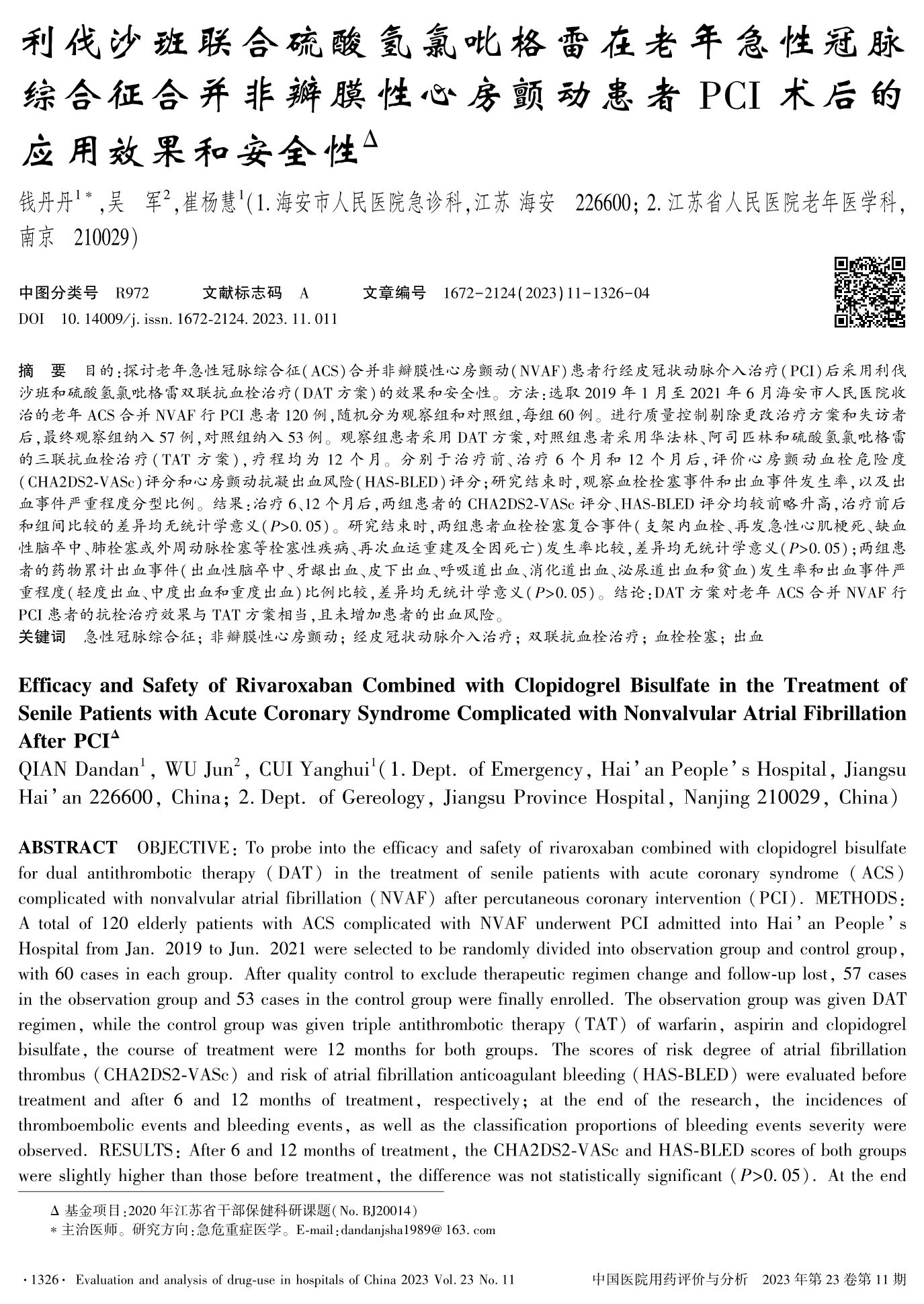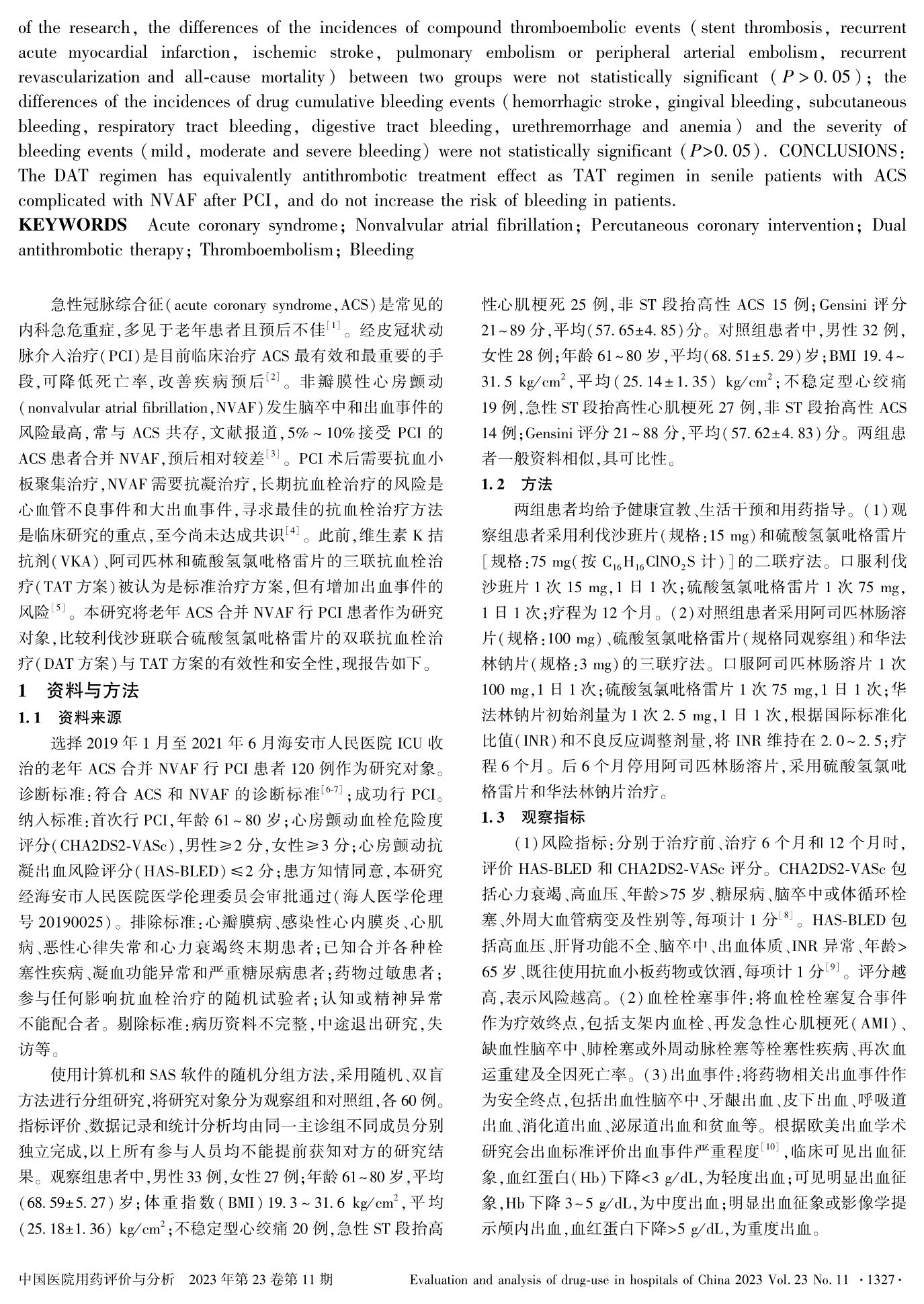 利伐沙班联合硫酸氢氯吡格雷在老年急性冠脉综合征合并非瓣膜性心房颤动患者PCI术后的应用效果和安全性