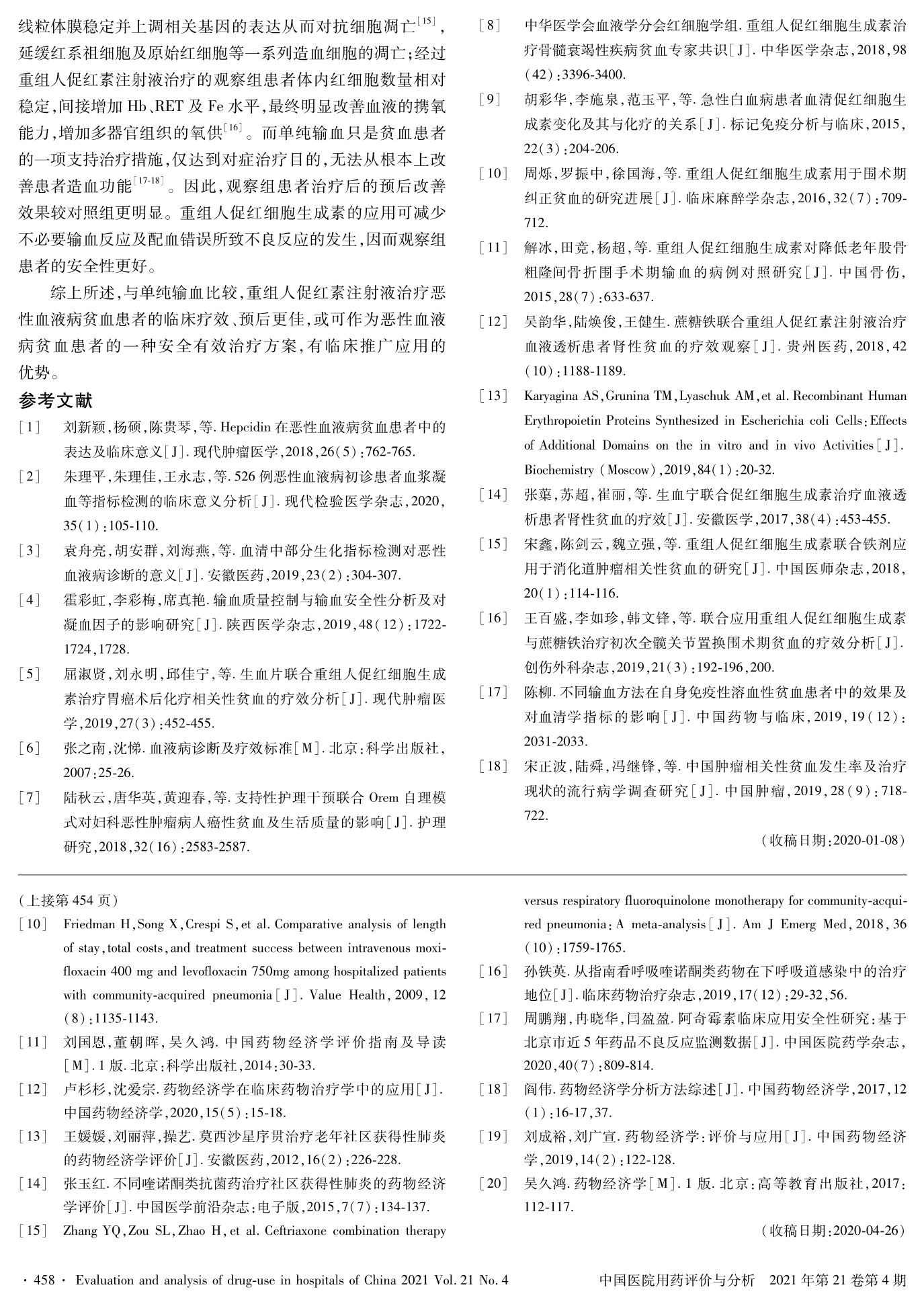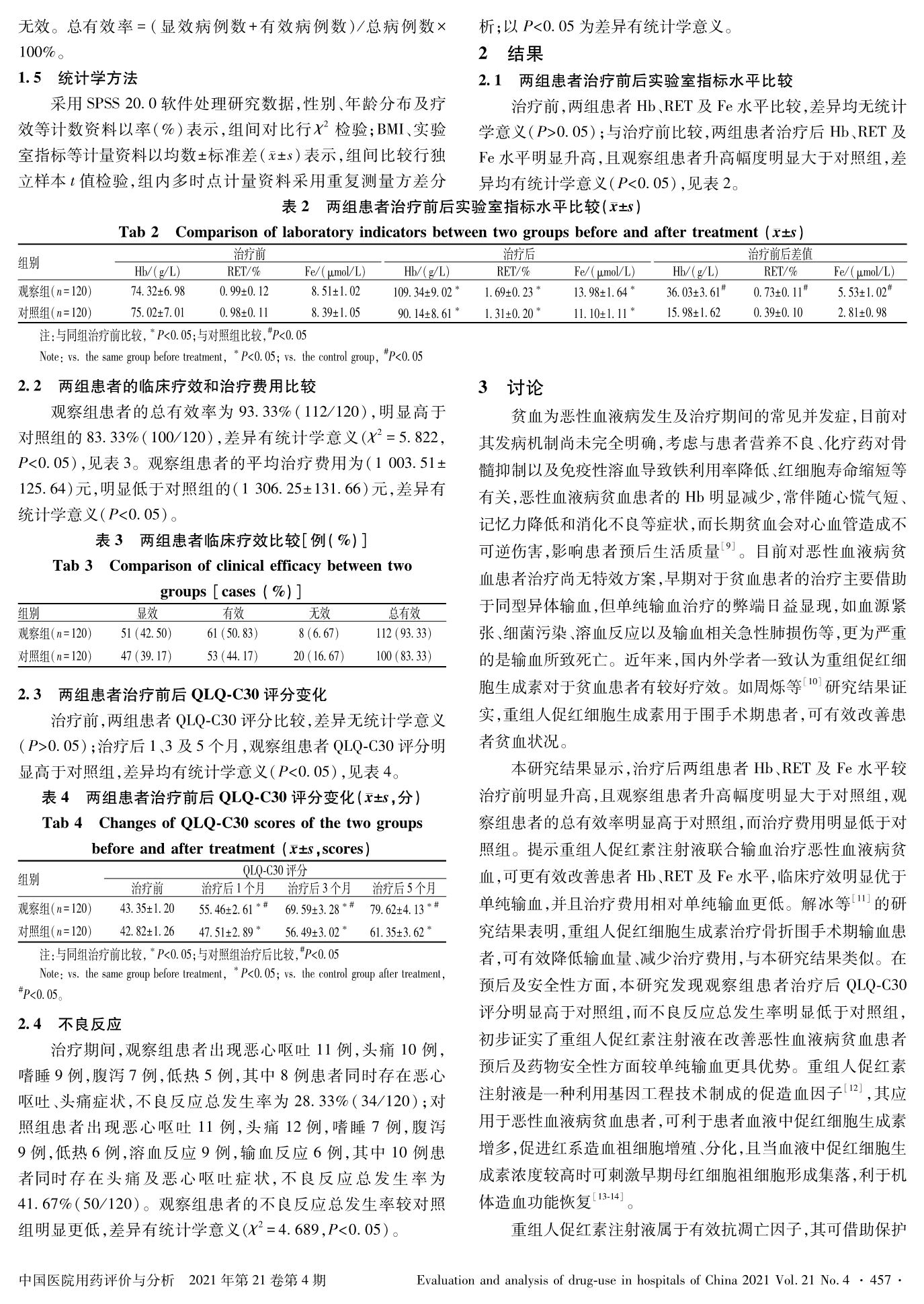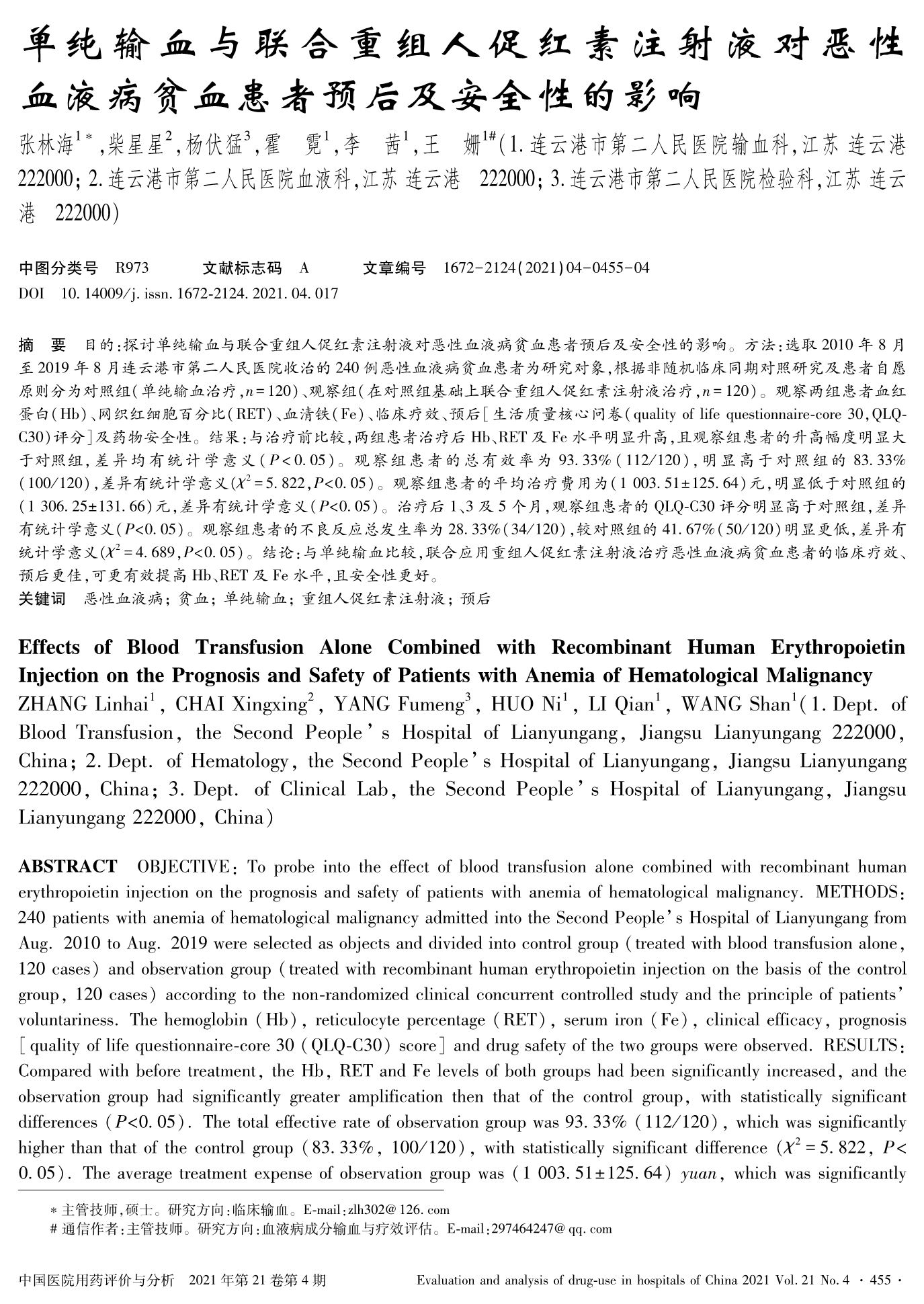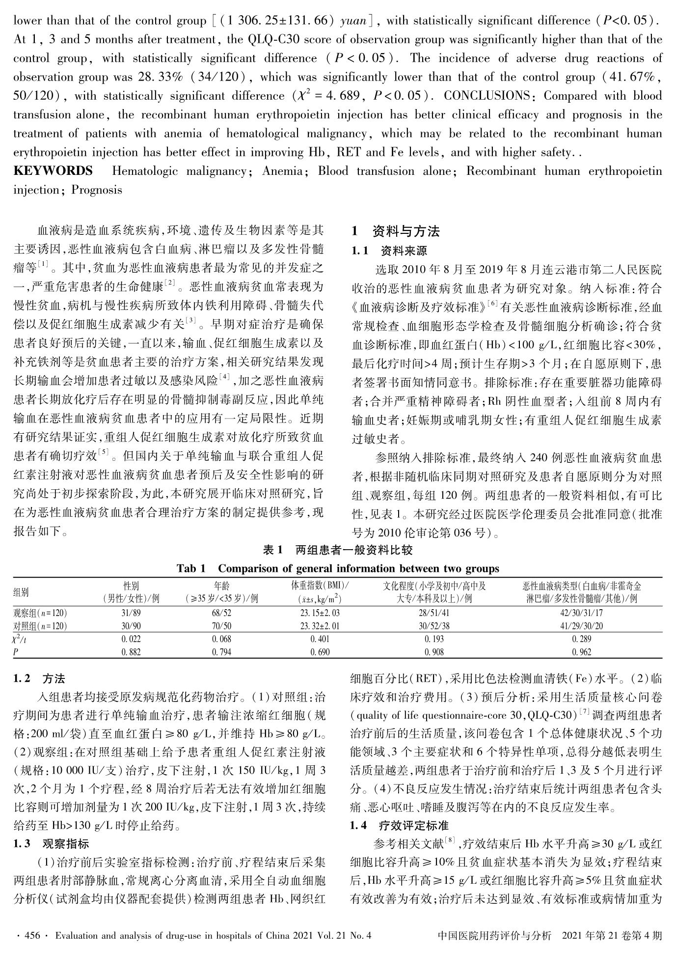 单纯输血与联合重组人促红素注射液对恶性血液病贫血患者预后及安全性的影响