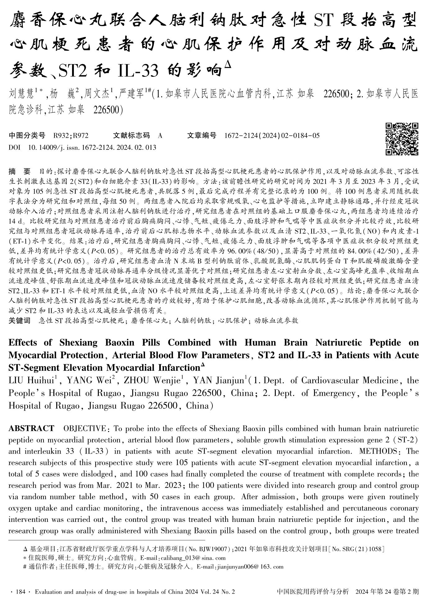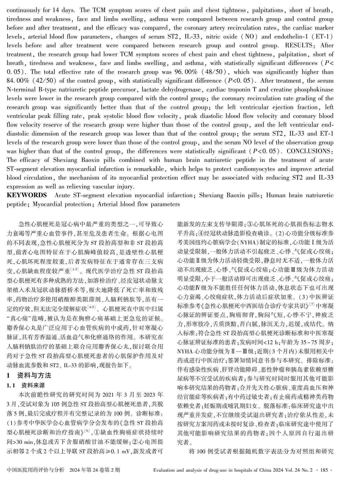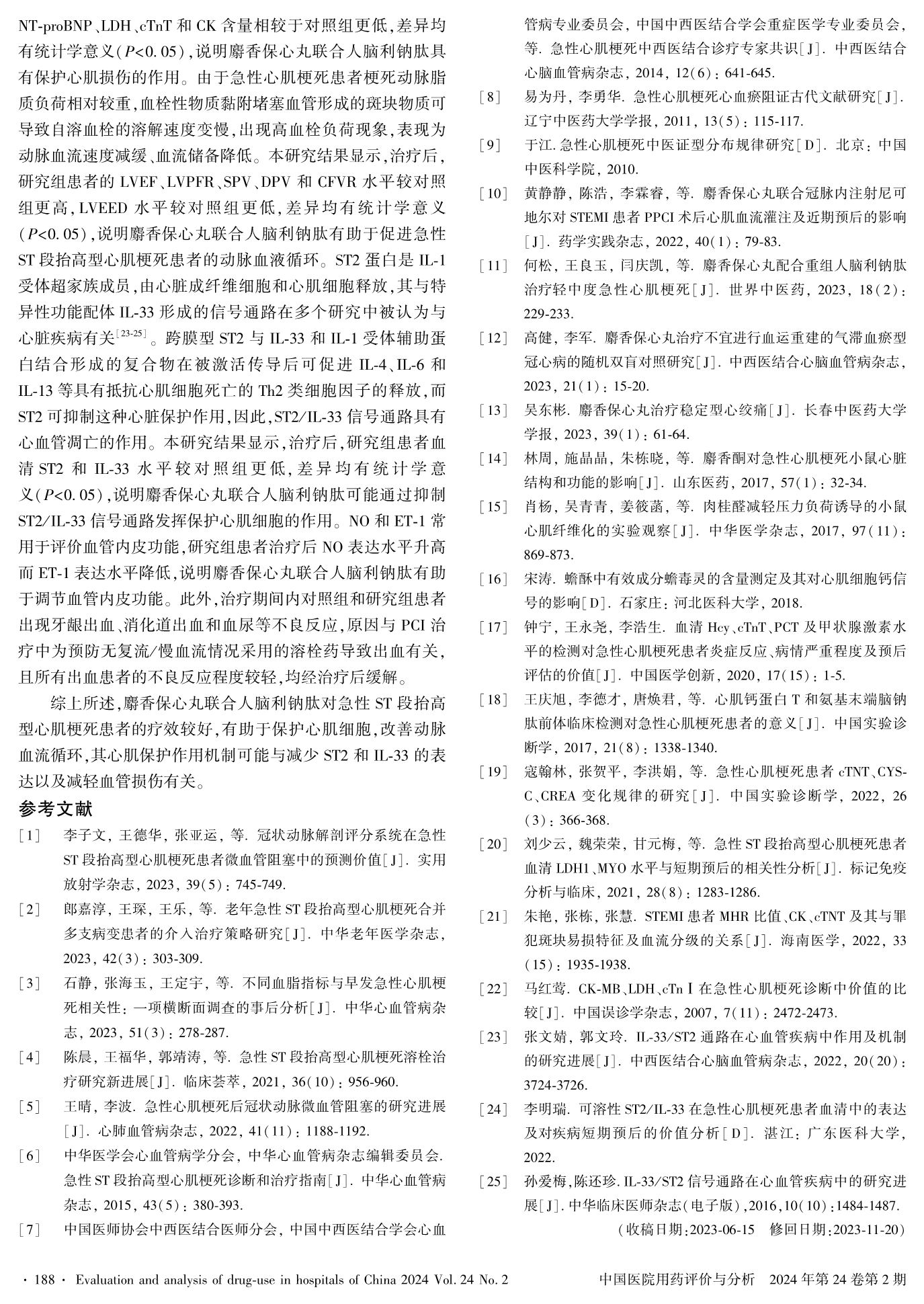 麝香保心丸联合人脑利钠肽对急性ST段抬高型心肌梗死患者的心肌保护作用及对动脉血流参数、ST2和IL-33的影响