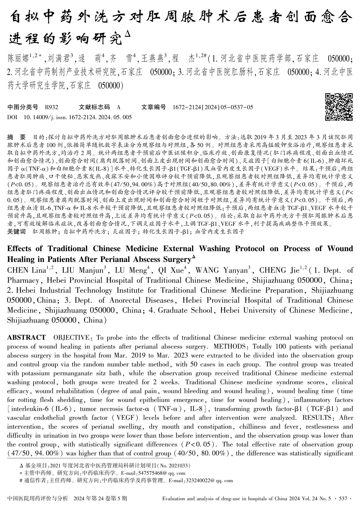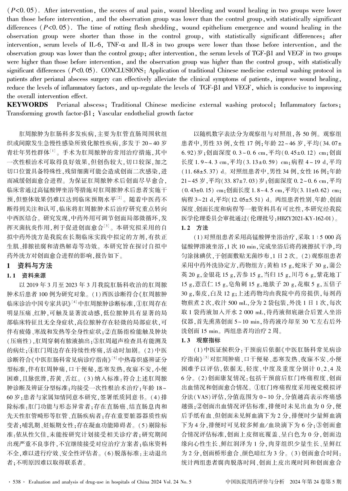 Effects of Traditional Chinese Medicine External Washing Protocol on Process of Wound Healing in Patients After Perianal Abscess Surgery………………………………………………………… CHEN Lina,LIU Manjun, LU Meng, QI Xue, WANG Yanyan, CHENG Jie