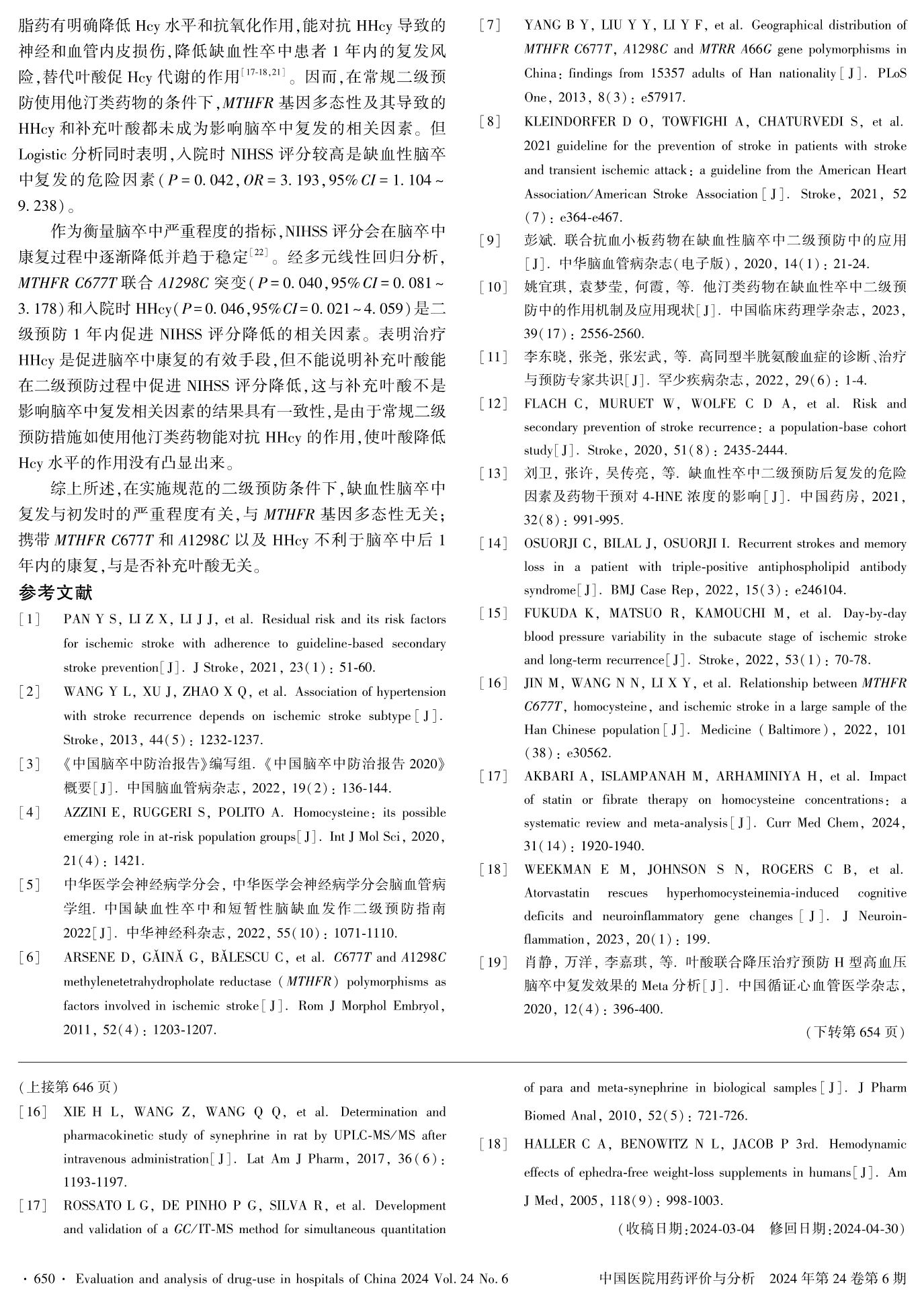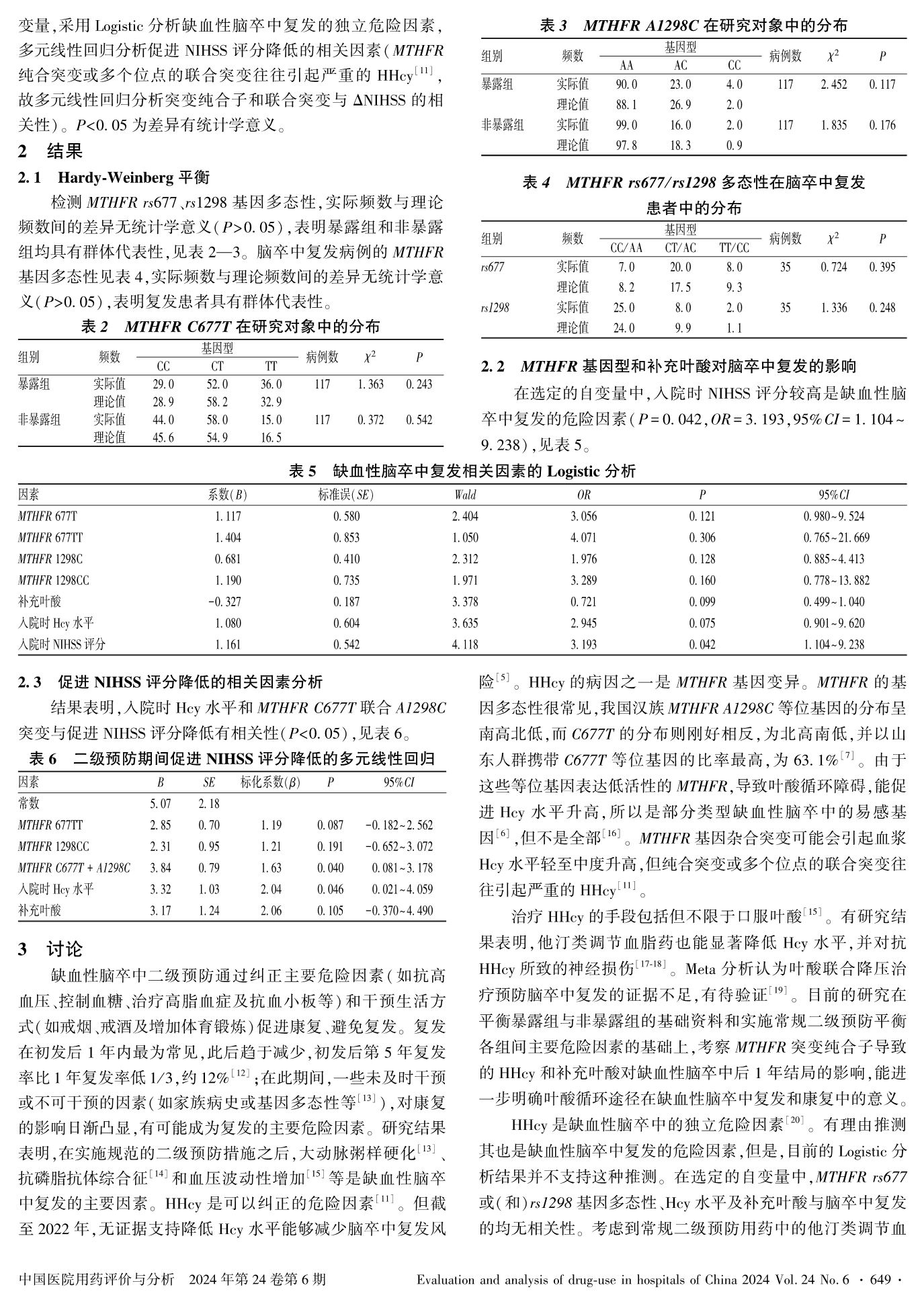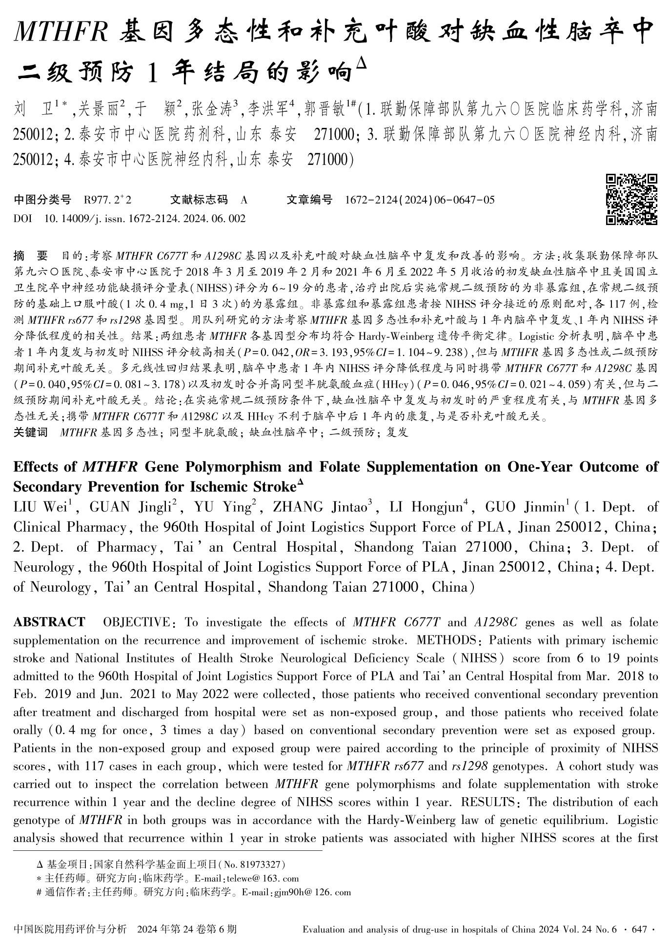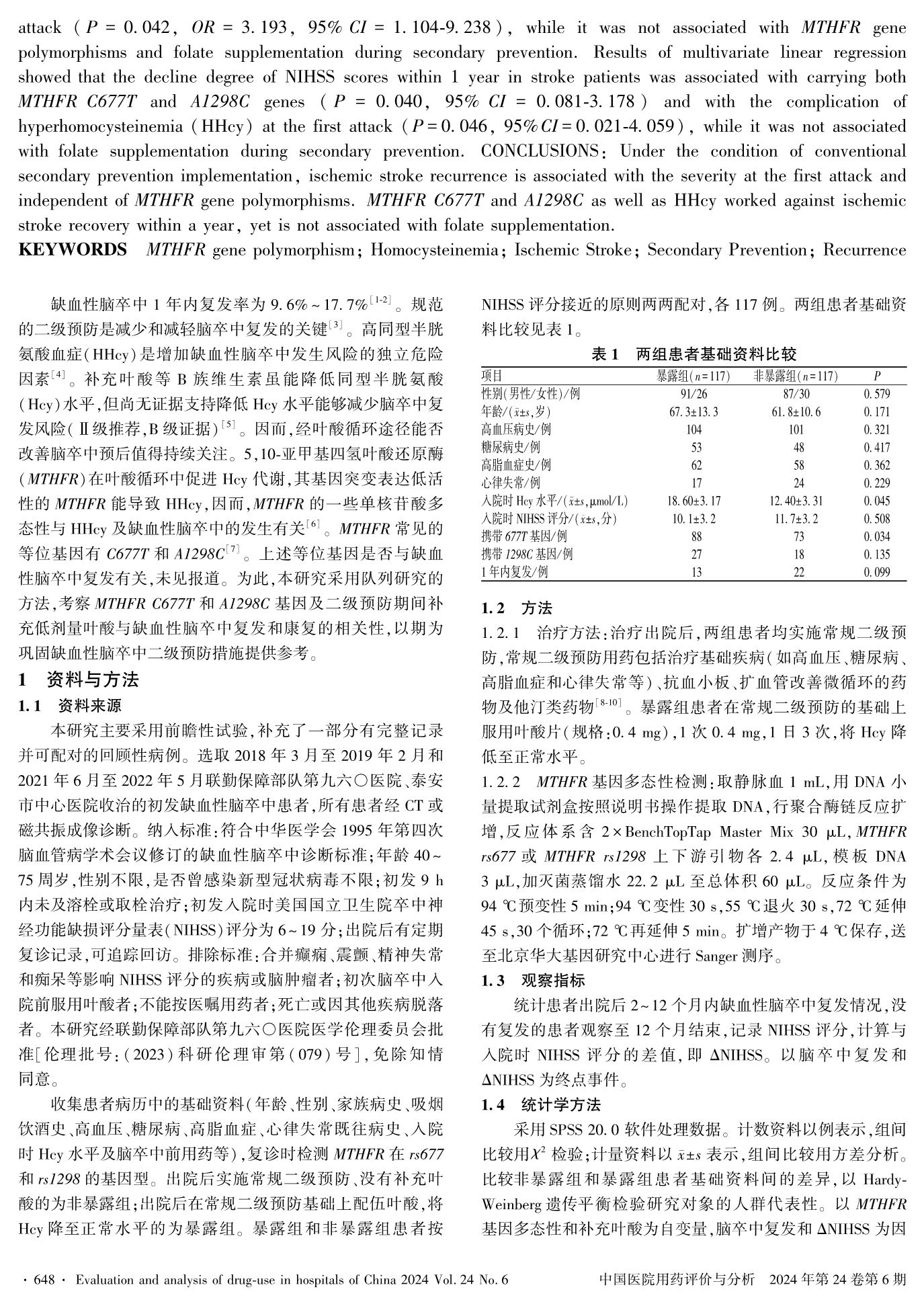 MTHFR基因多态性和补充叶酸对缺血性脑卒中二级预防1年结局的影响