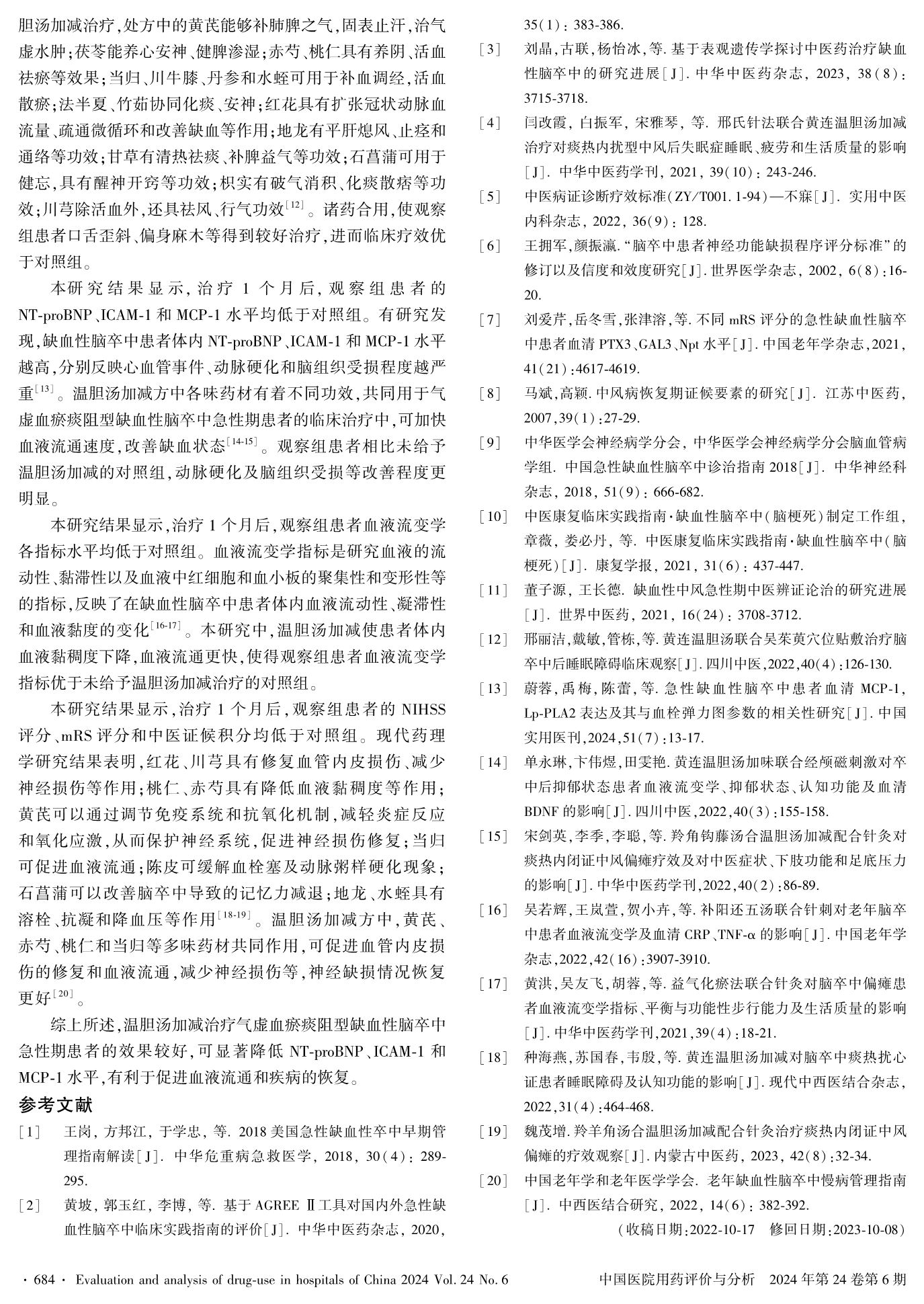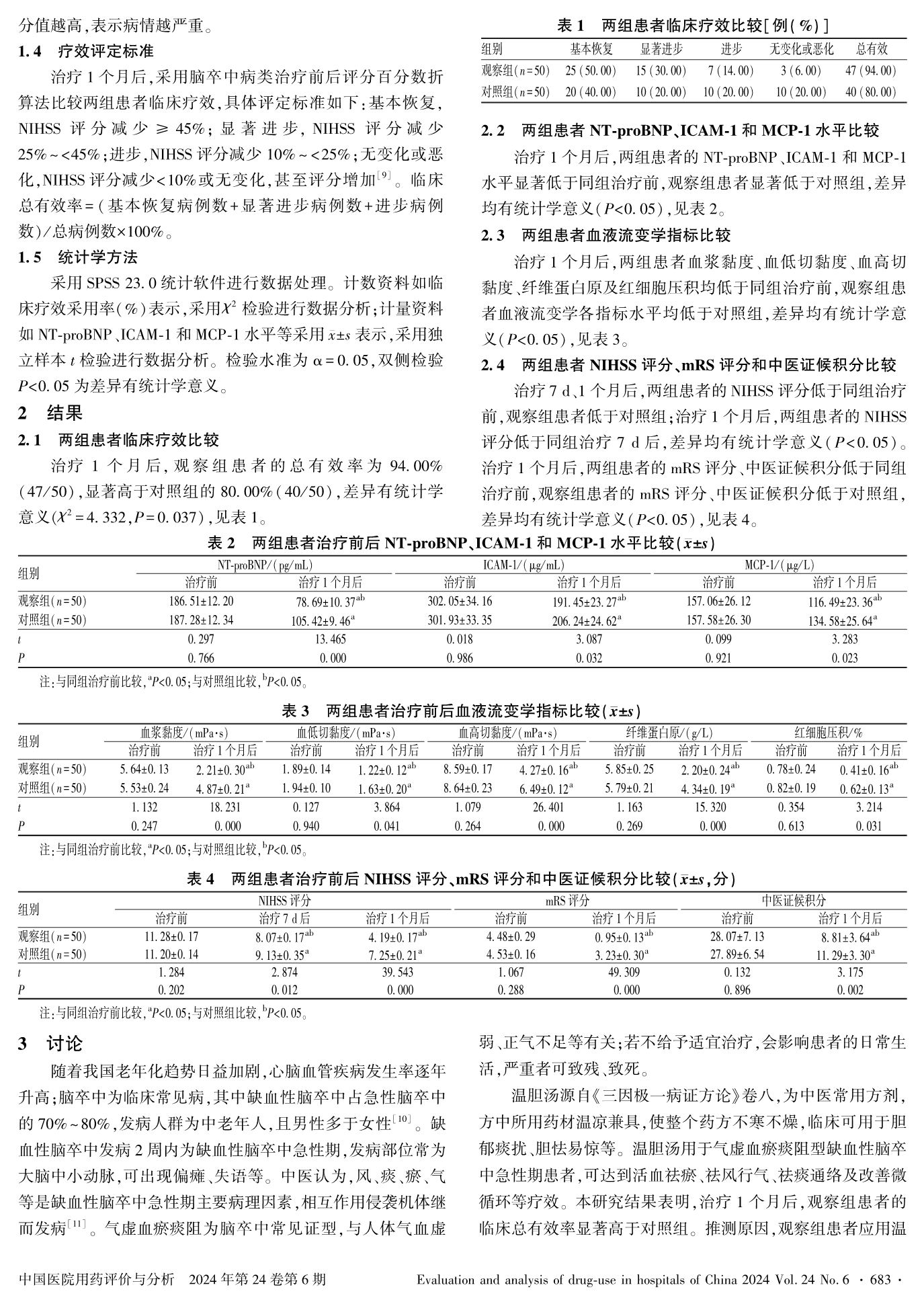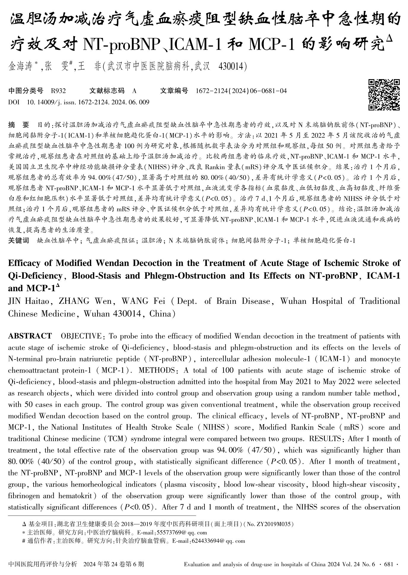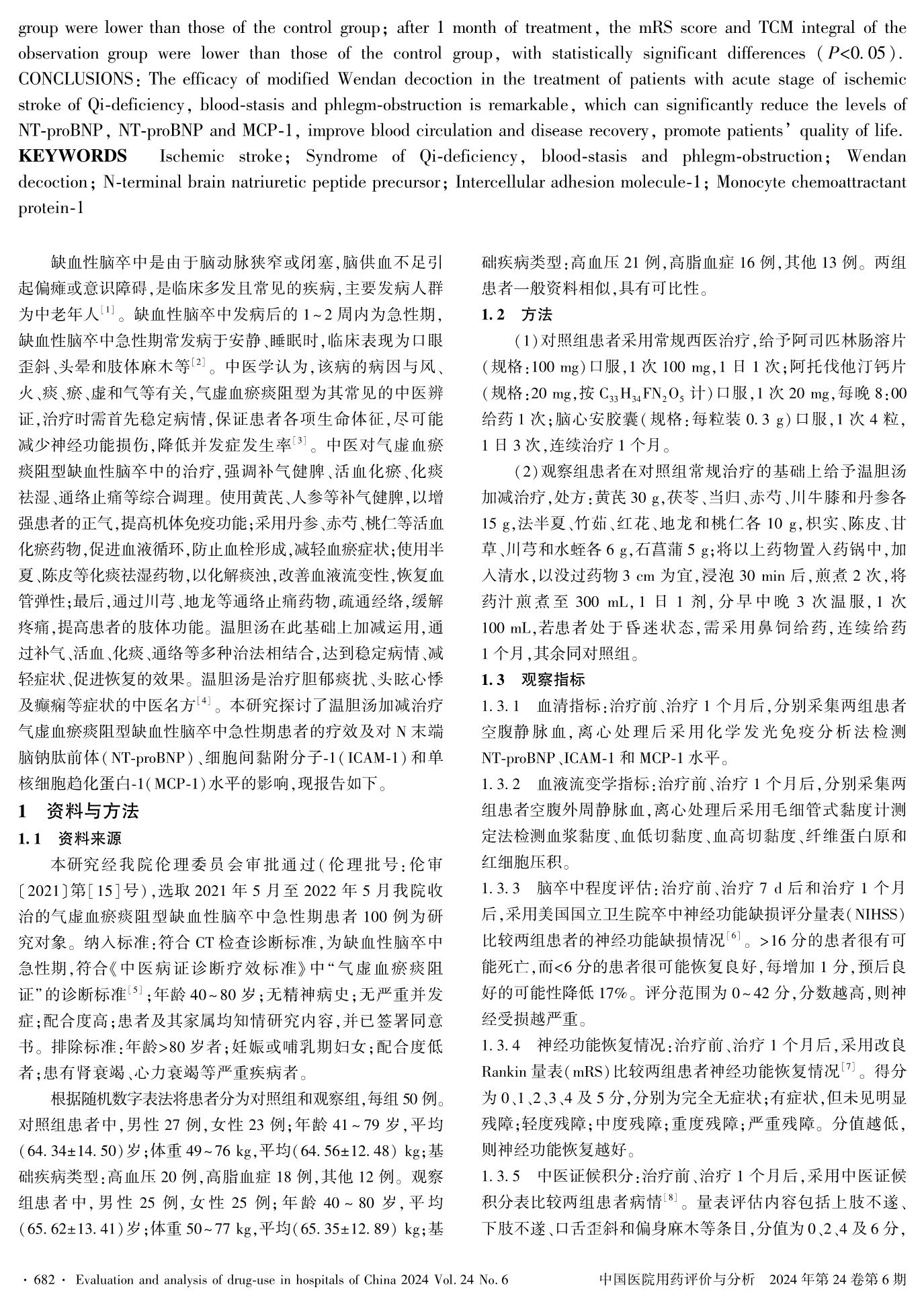 温胆汤加减治疗气虚血瘀痰阻型缺血性脑卒中急性期的疗效及对NT-proBNP、ICAM-1和MCP-1的影响研究