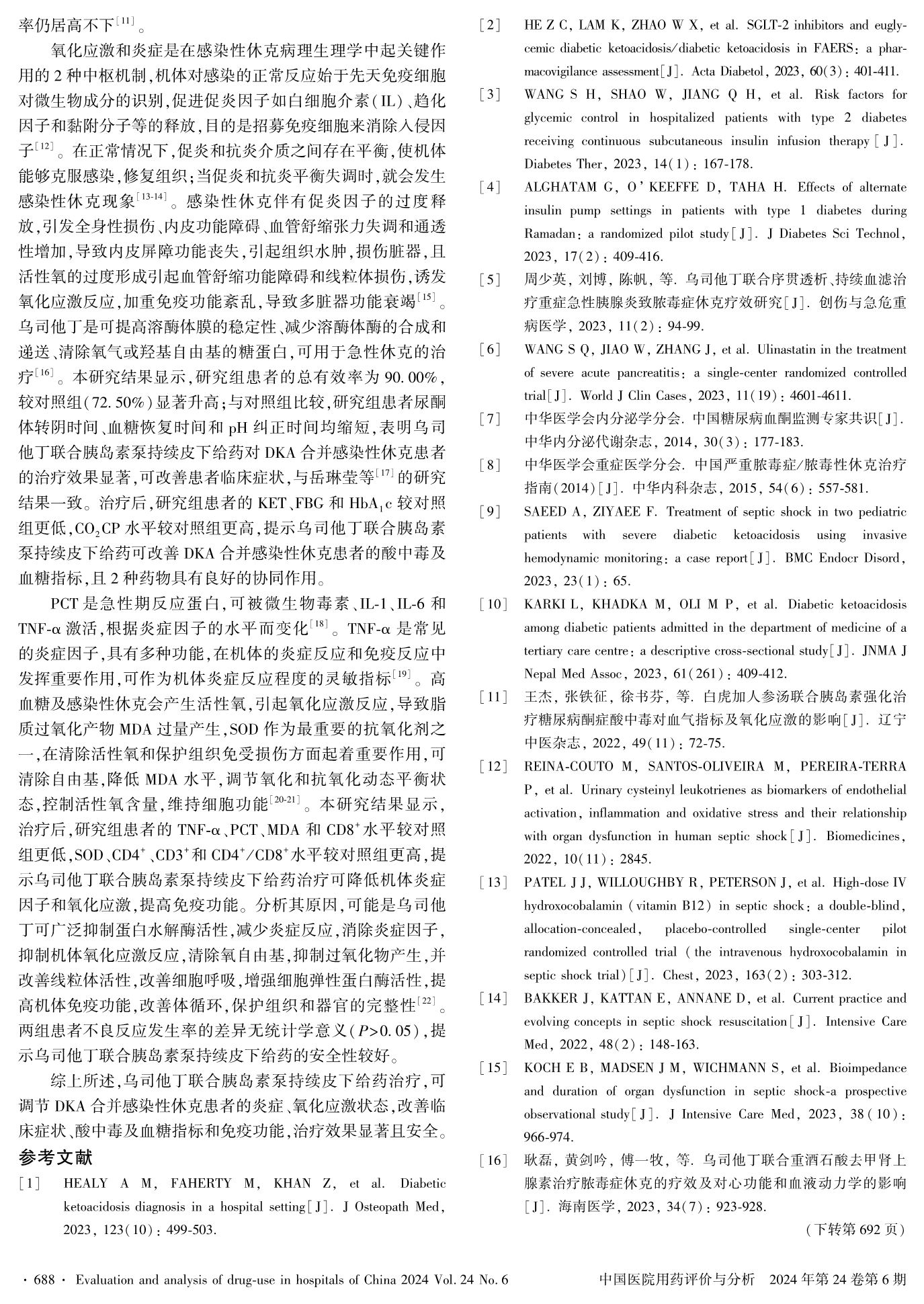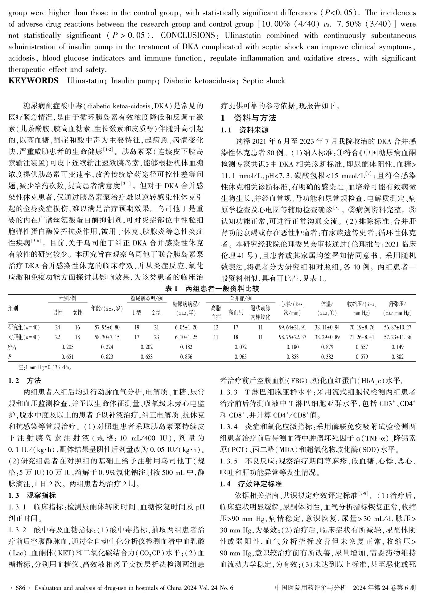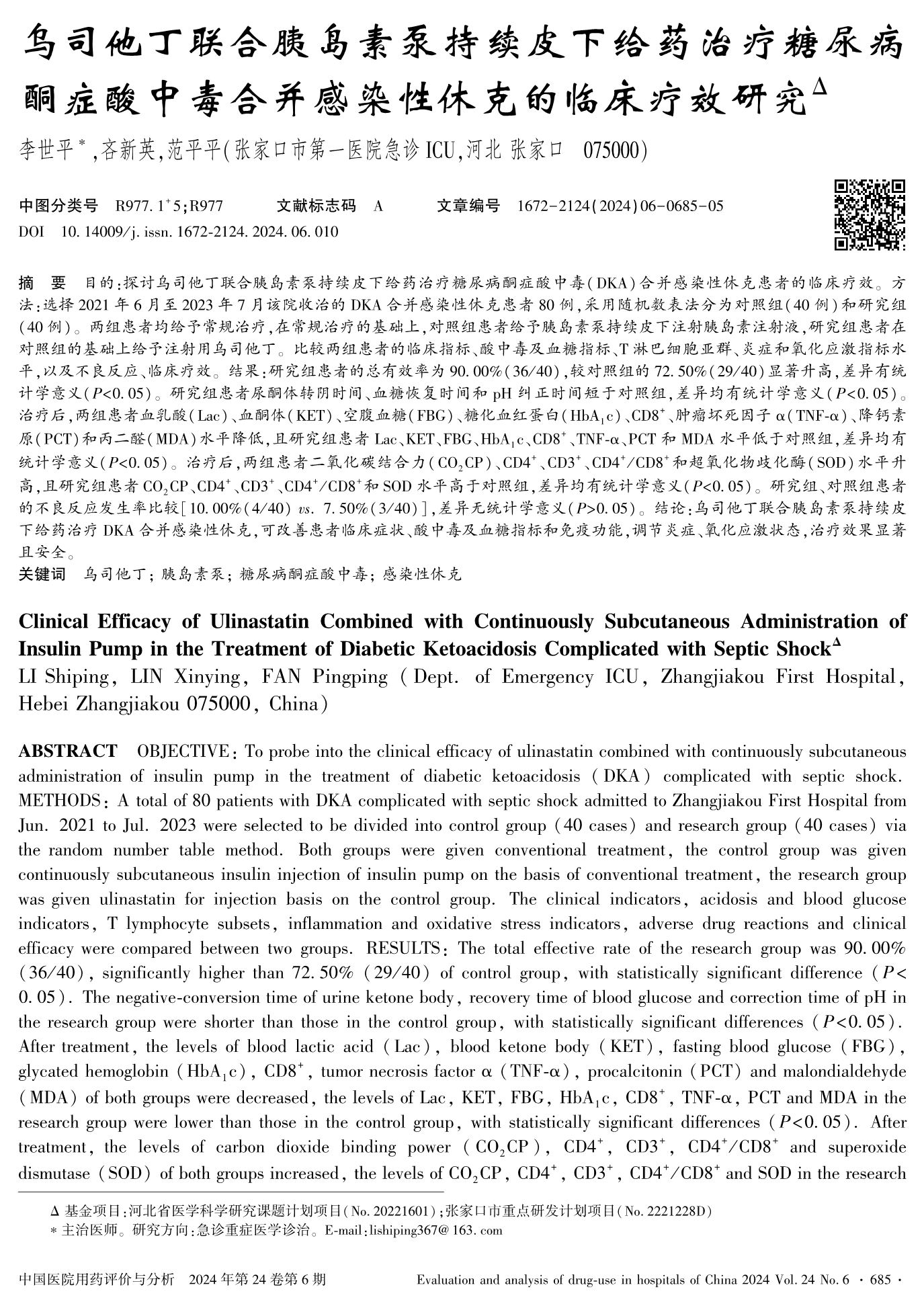 乌司他丁联合胰岛素泵持续皮下给药治疗糖尿病酮症酸中毒合并感染性休克的临床疗效研究
