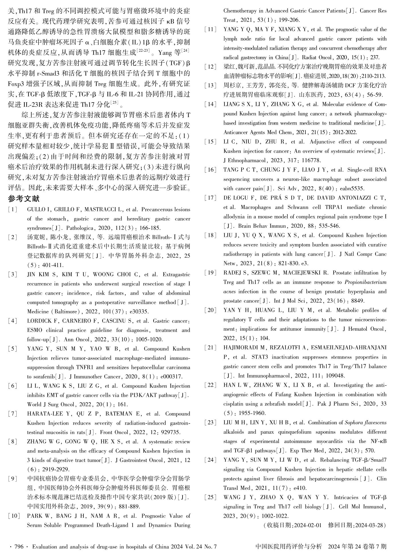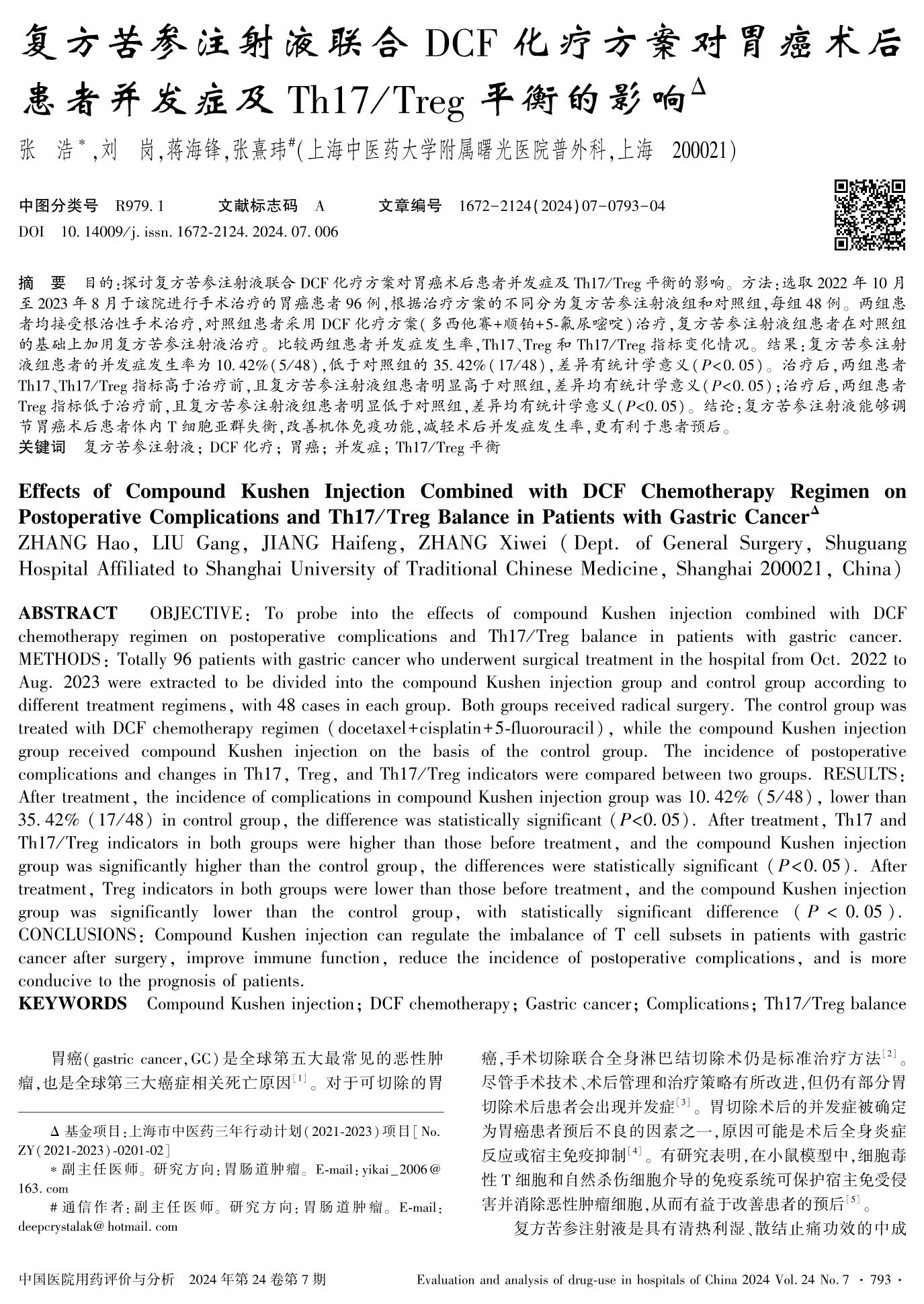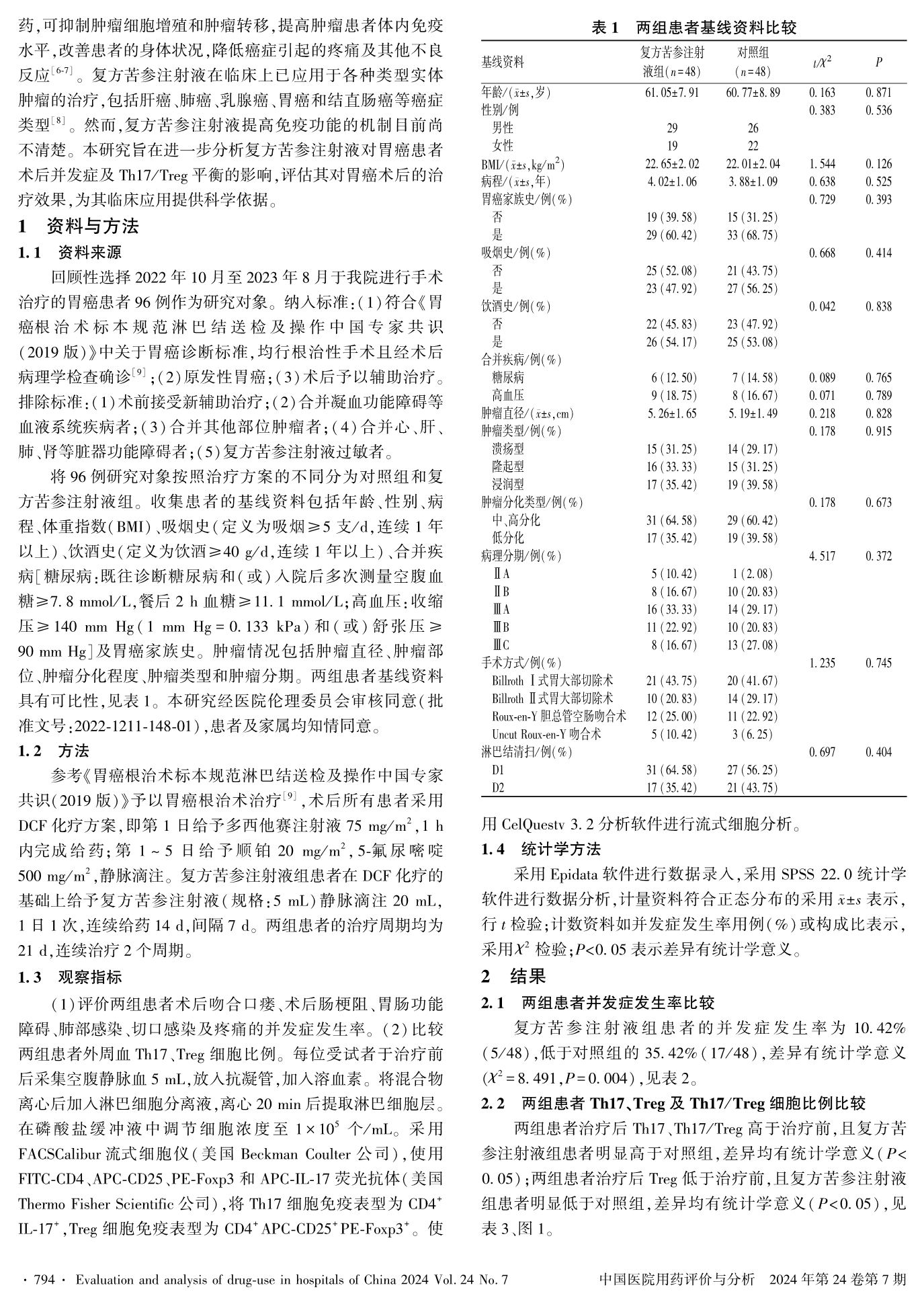 复方苦参注射液联合DCF化疗方案对胃癌术后患者并发症及Th17/Treg平衡的影响