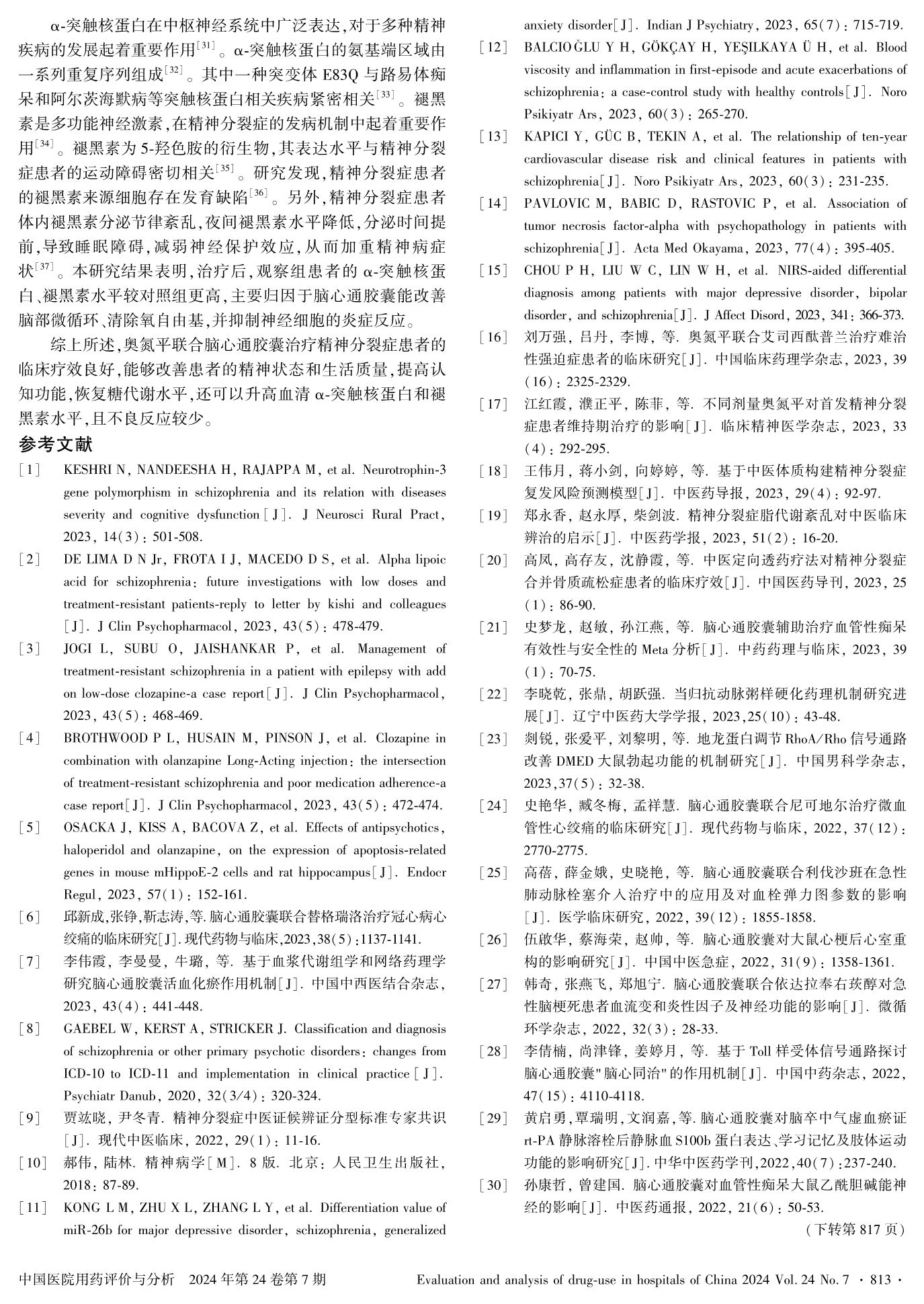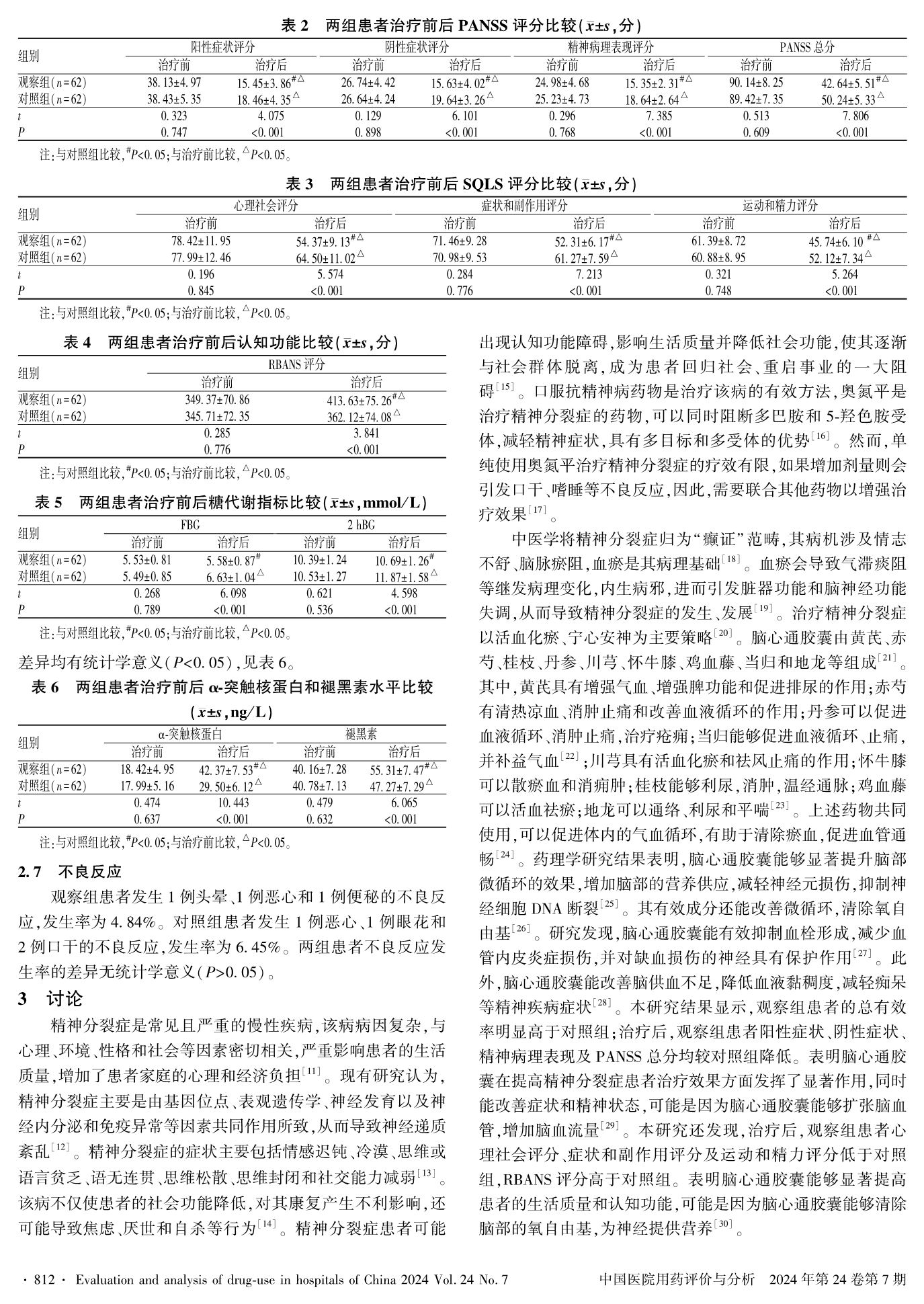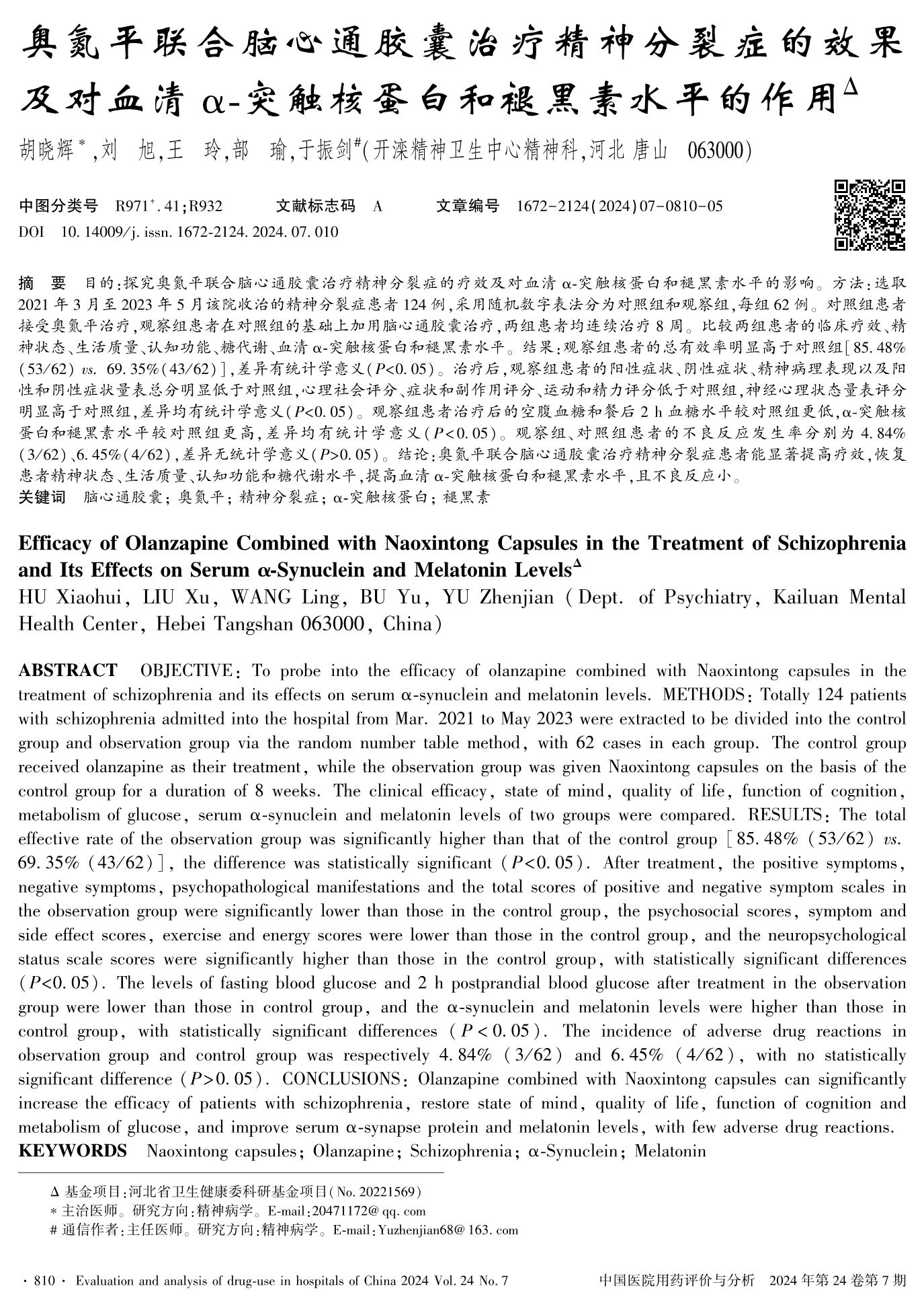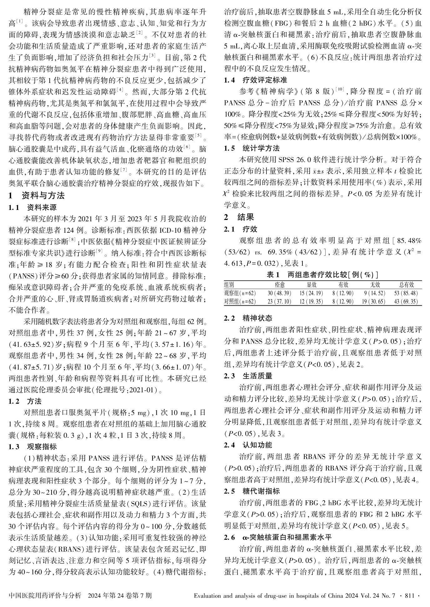 奥氮平联合脑心通胶囊治疗精神分裂症的效果及对血清α-突触核蛋白和褪黑素水平的作用