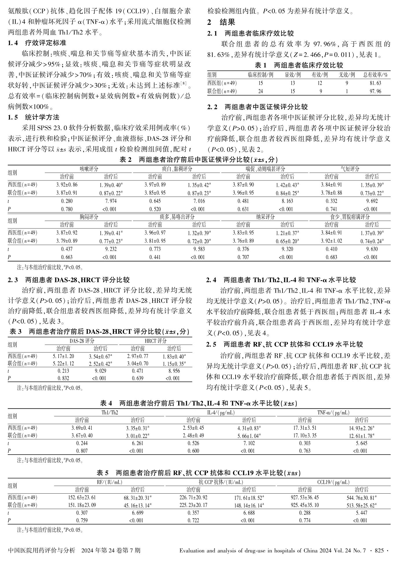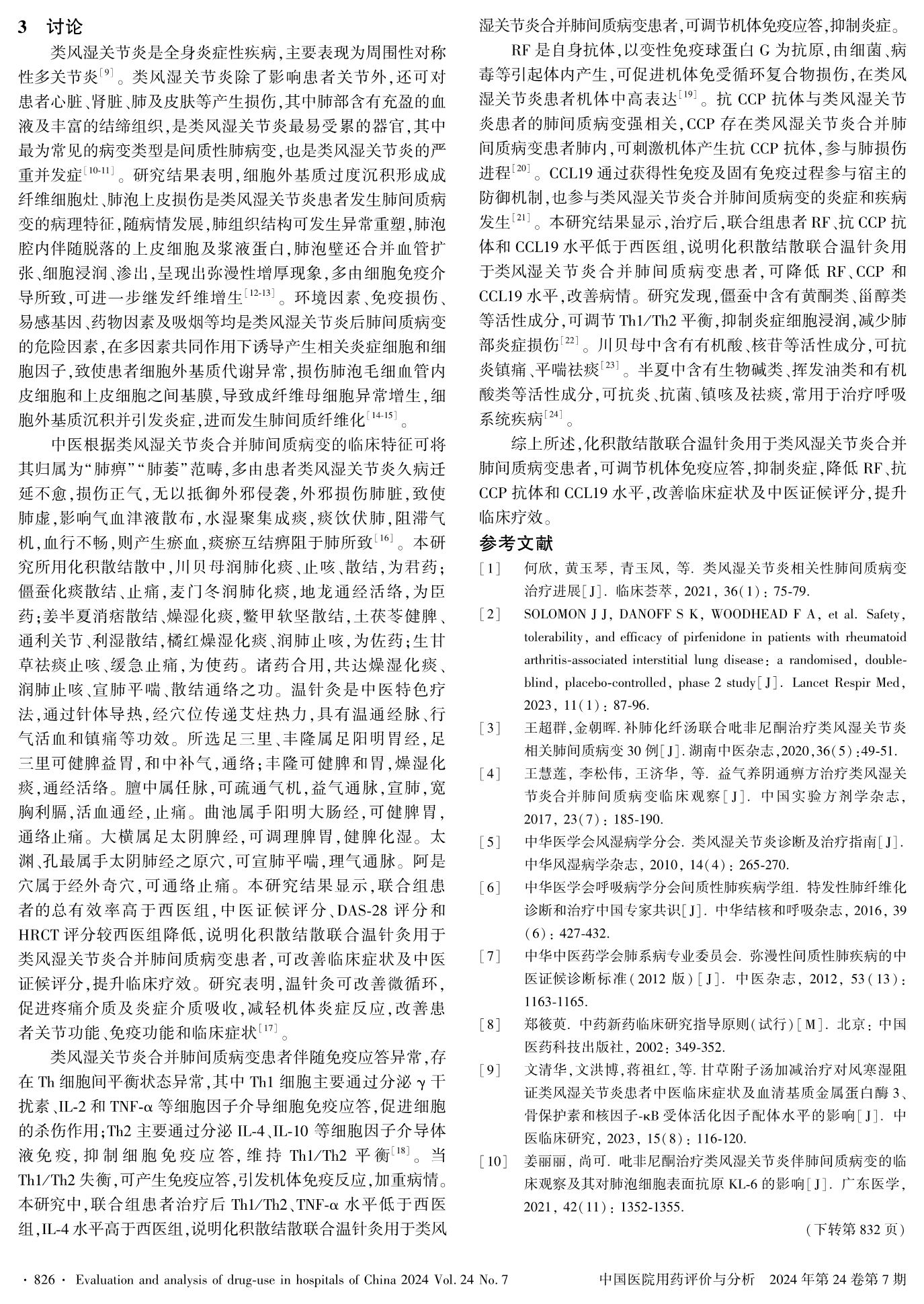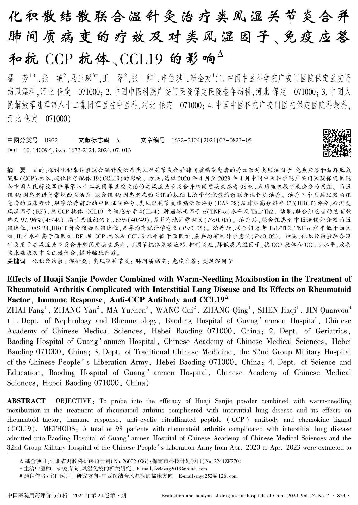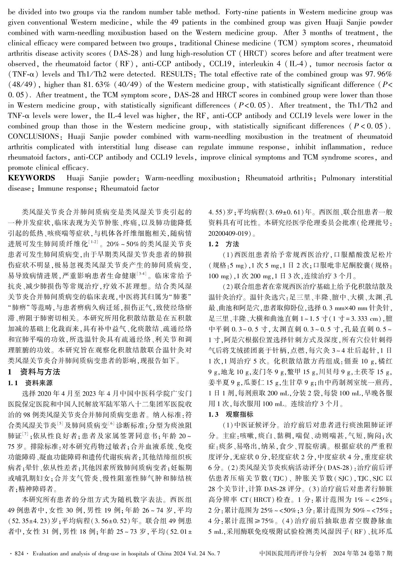 化积散结散联合温针灸治疗类风湿关节炎合并肺间质病变的疗效及对类风湿因子、免疫应答和抗CCP抗体、CCL19的影响