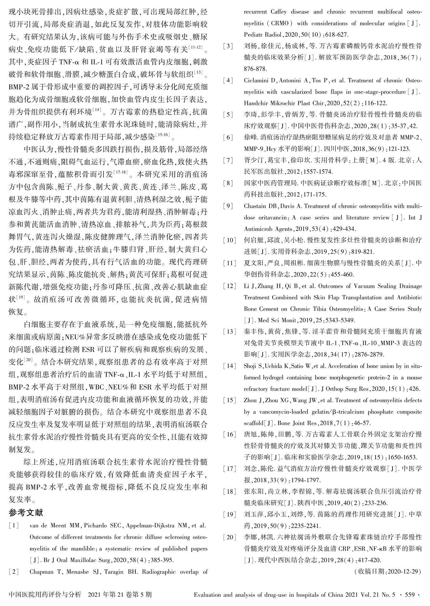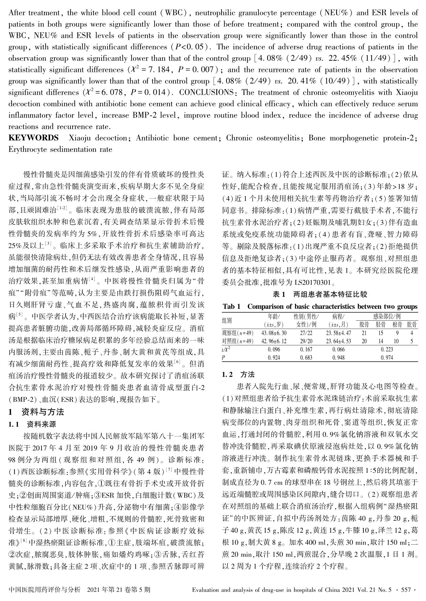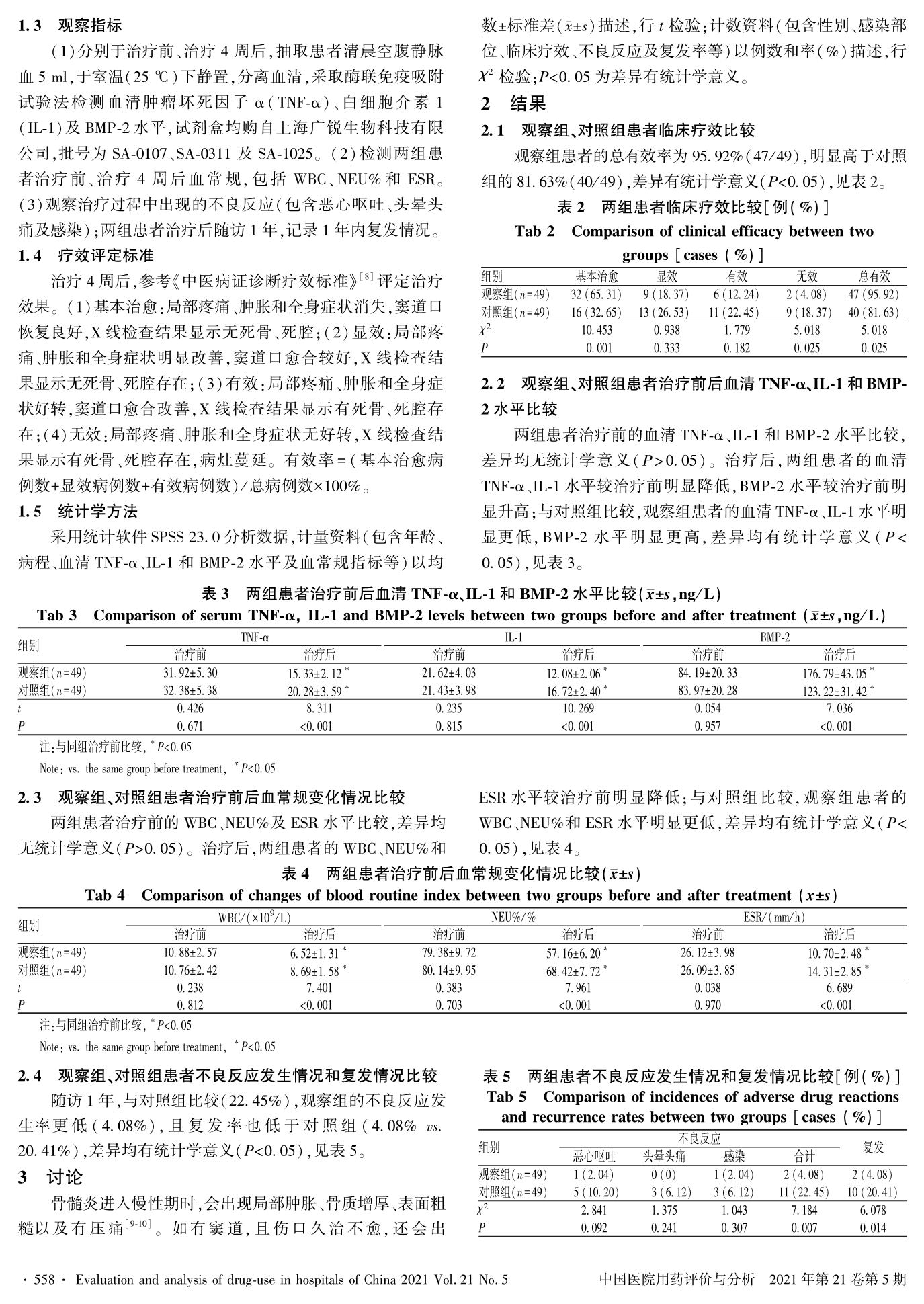 消疽汤联合抗生素骨水泥治疗慢性骨髓炎的临床疗效及对血清骨成型蛋白-2、血沉表达的影响