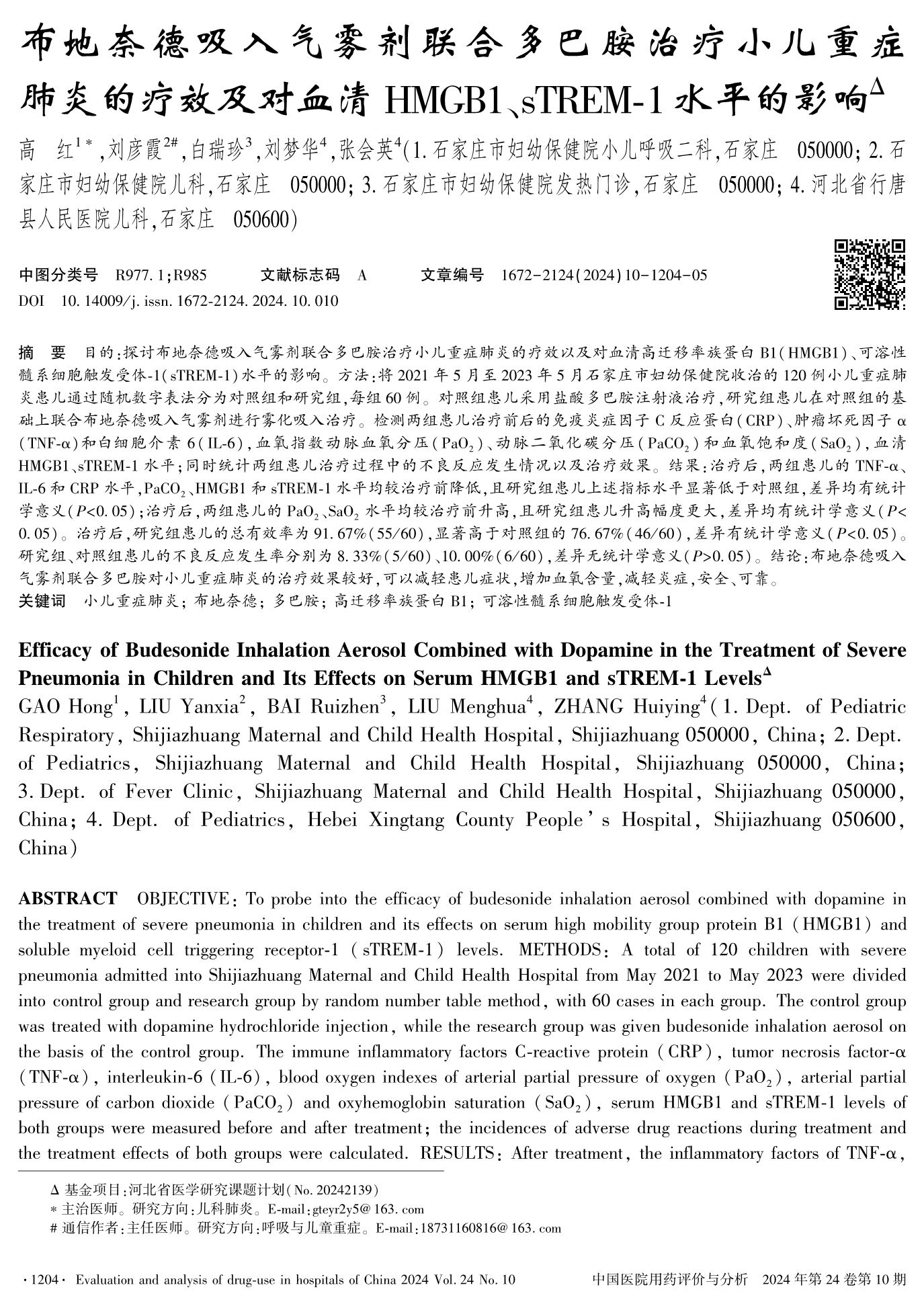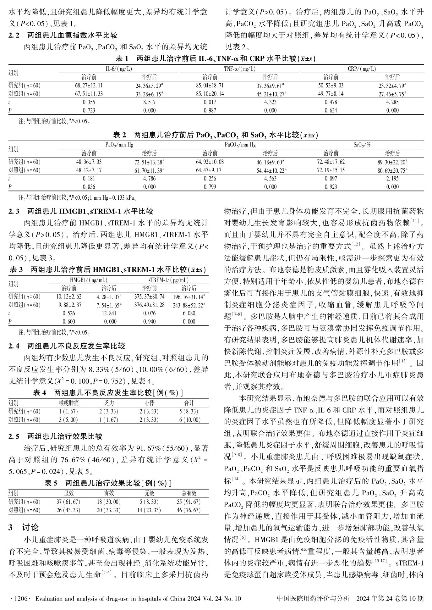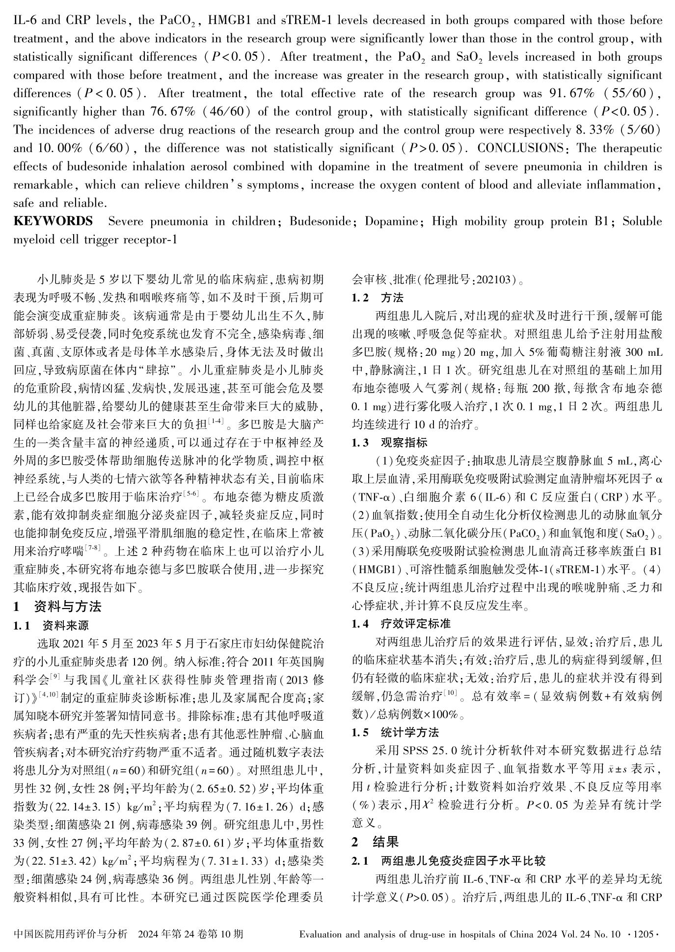 布地奈德吸入气雾剂联合多巴胺治疗小儿重症肺炎的疗效及对血清HMGB1、sTREM-1水平的影响