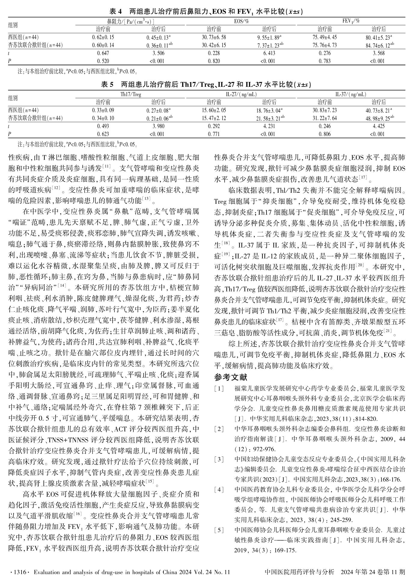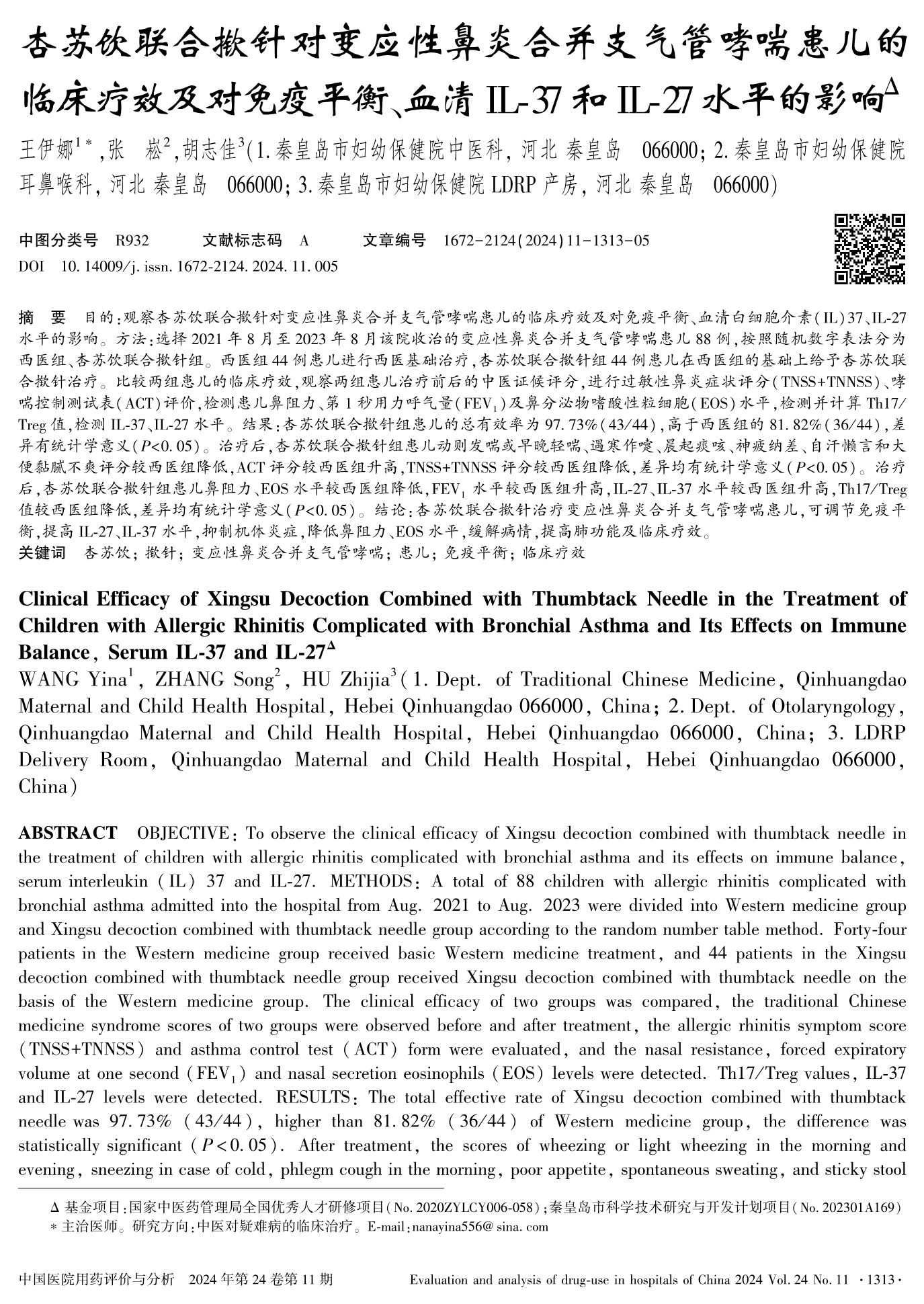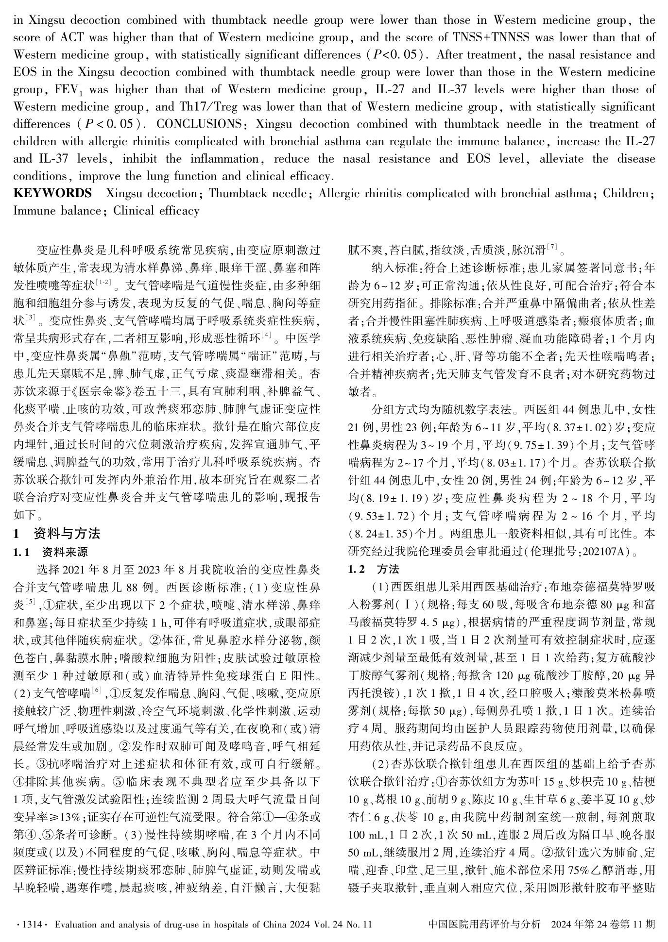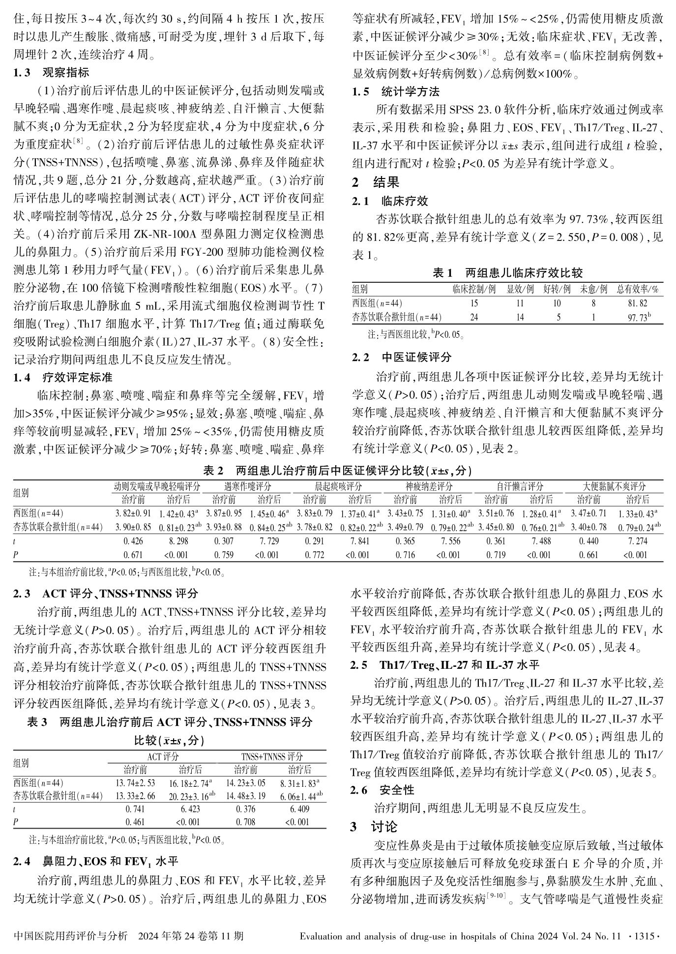 杏苏饮联合揿针对变应性鼻炎合并支气管哮喘患儿的临床疗效及对免疫平衡、血清IL-37和IL-27水平的影响