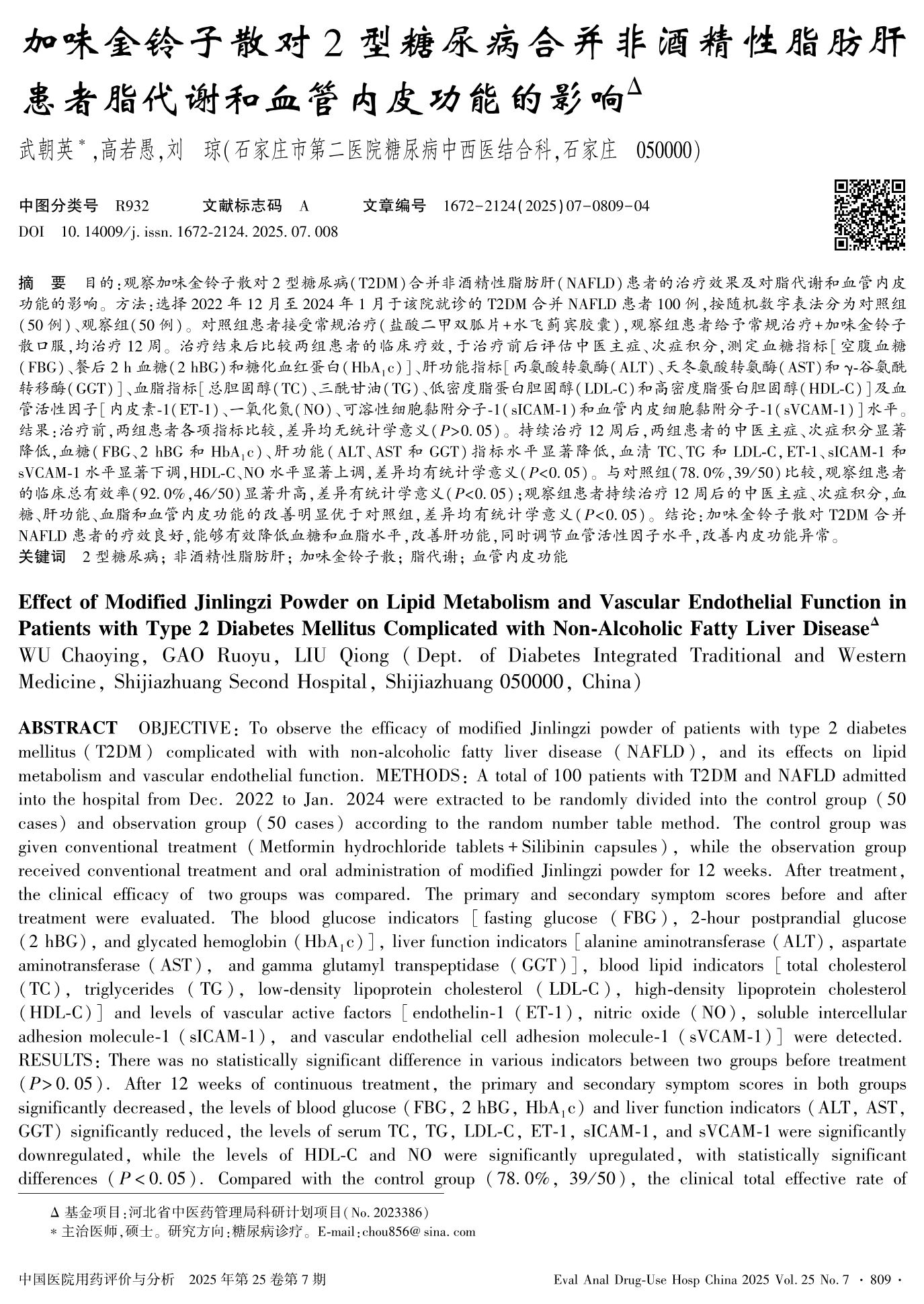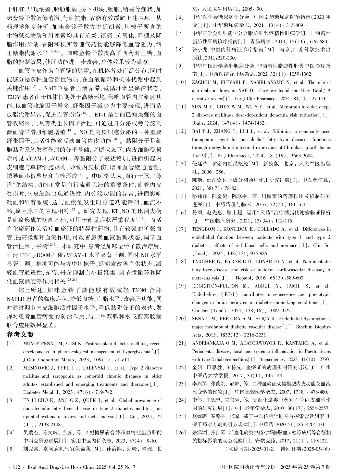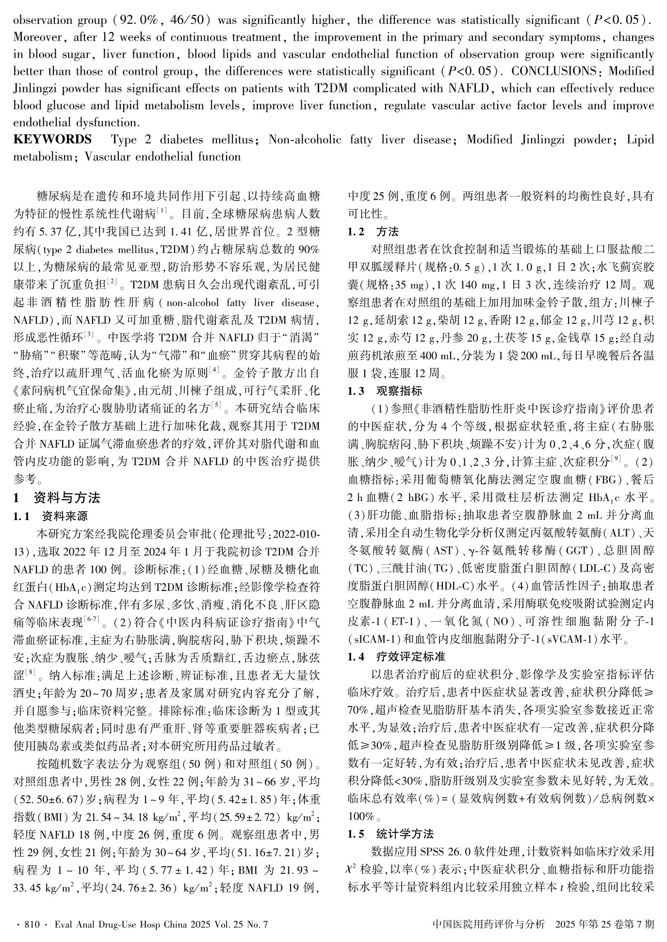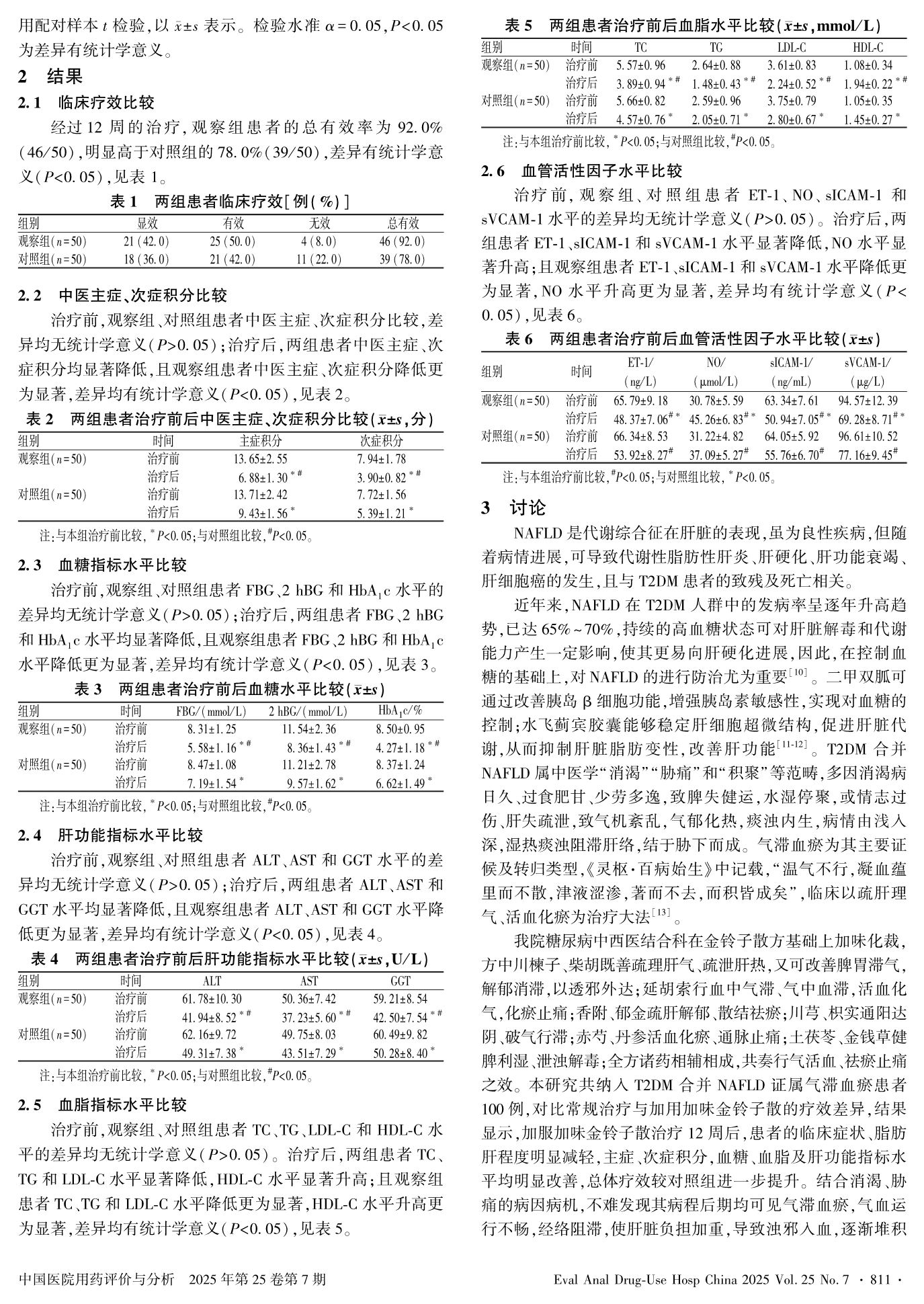 加味金铃子散对2型糖尿病合并非酒精性脂肪肝患者脂代谢和血管内皮功能的影响