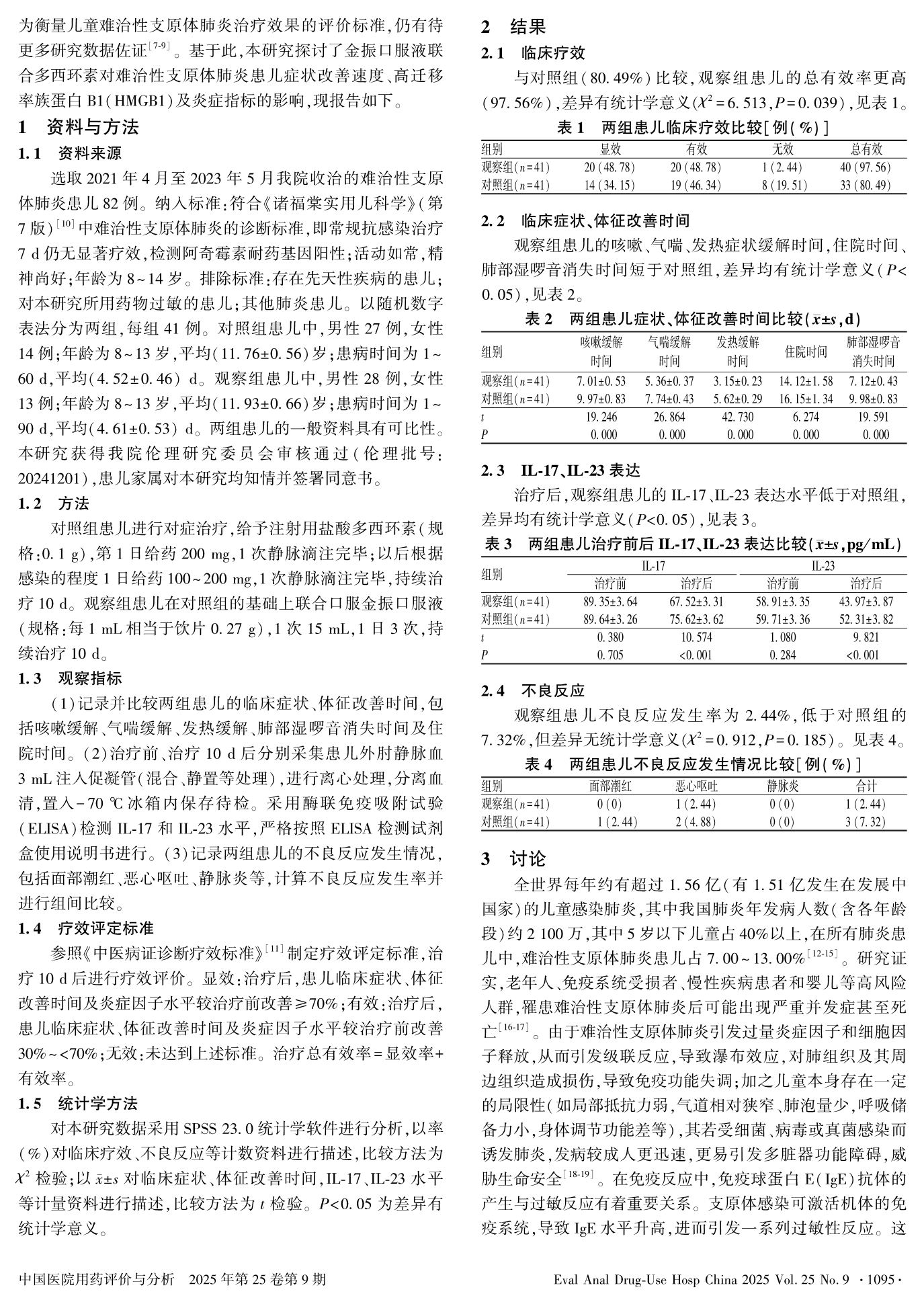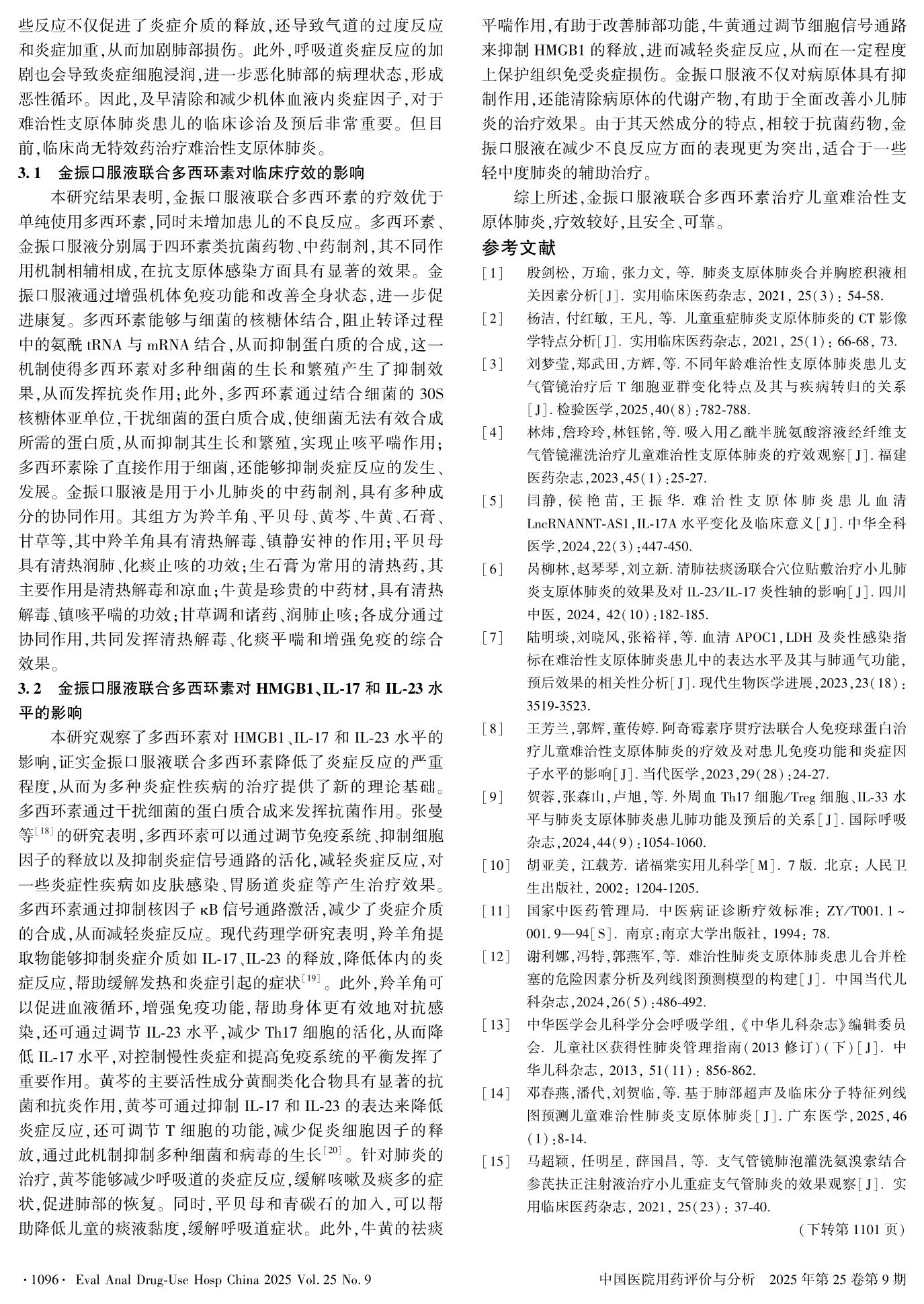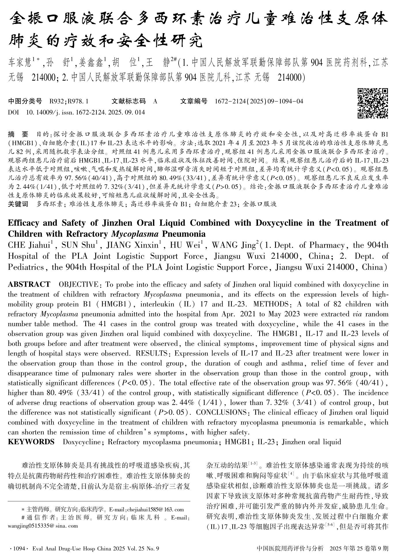 Efficacy and Safety of Jinzhen Oral Liquid Combined with Doxycycline in the Treatment of Children with Refractory Mycoplasma Pneumonia