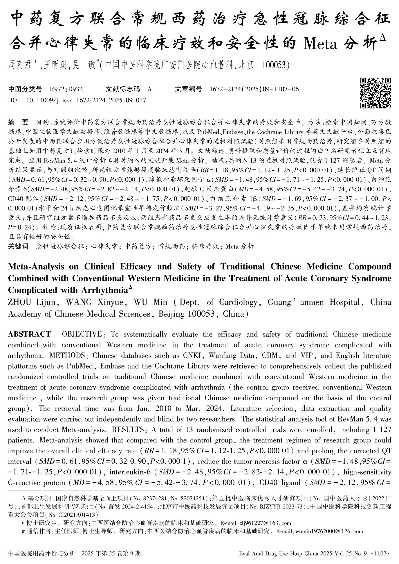 中药复方联合常规西药治疗急性冠脉综合征合并心律失常的临床疗效和安全性的Meta分析