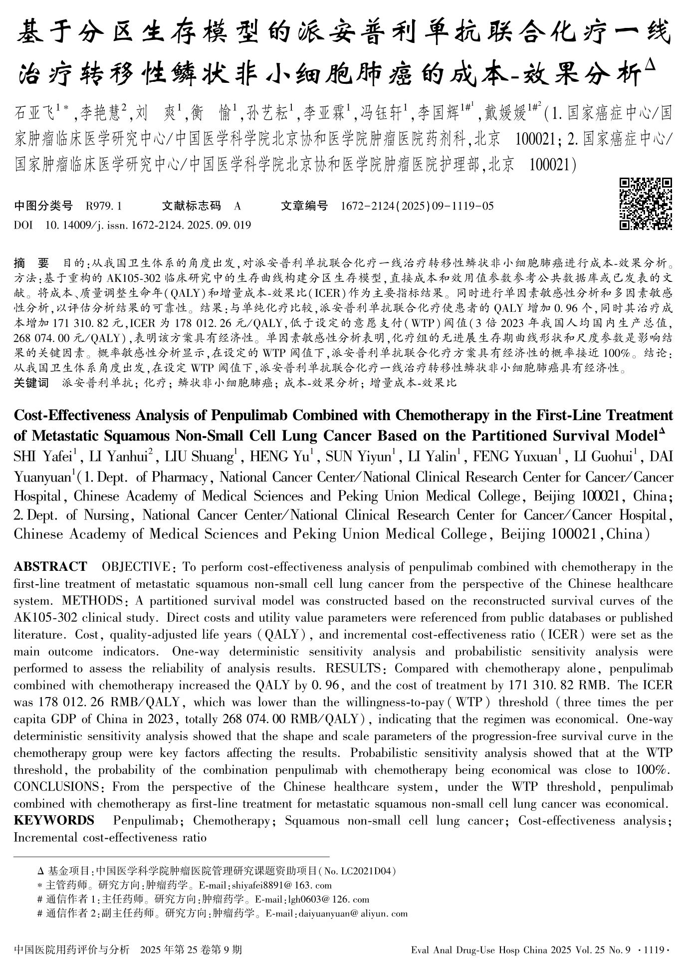 基于分区生存模型的派安普利单抗联合化疗一线治疗转移性鳞状非小细胞肺癌的成本-效果分析