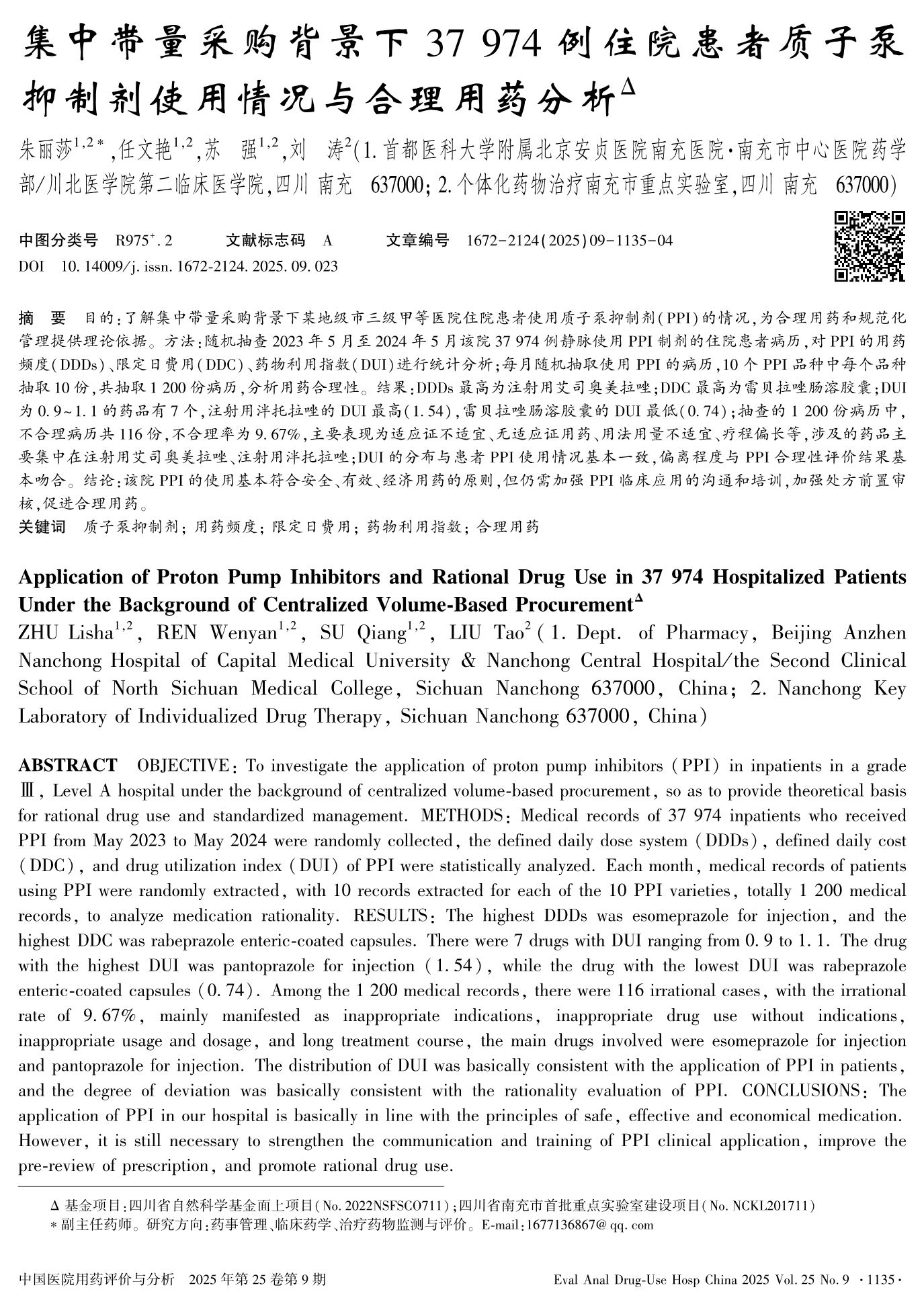 集中带量采购背景下37974例住院患者质子泵抑制剂使用情况与合理用药分析