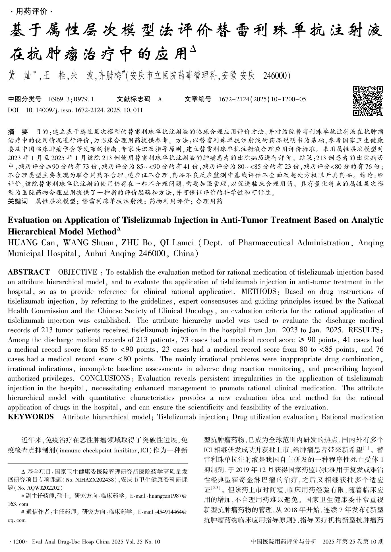 基于属性层次模型法评价替雷利珠单抗注射液在抗肿瘤治疗中的应用
