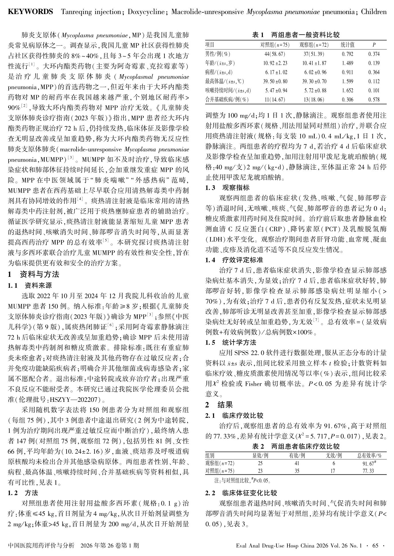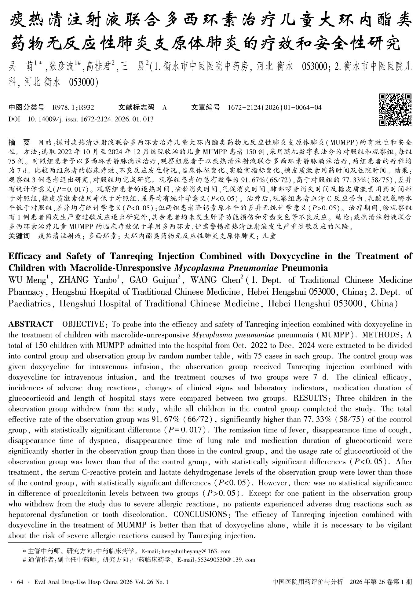 痰热清注射液联合多西环素治疗儿童大环内酯类药物无反应性肺炎支原体肺炎的疗效和安全性研究