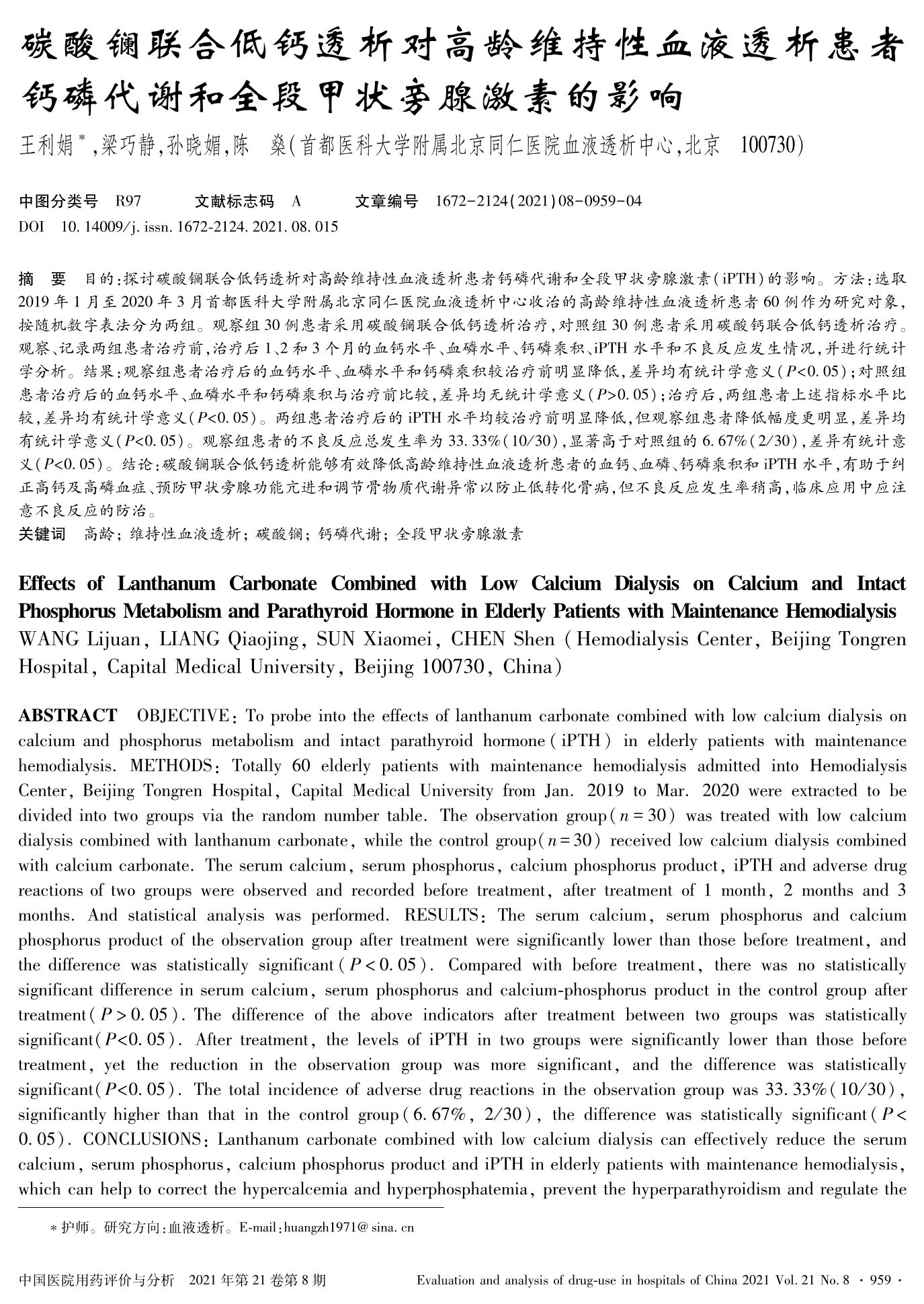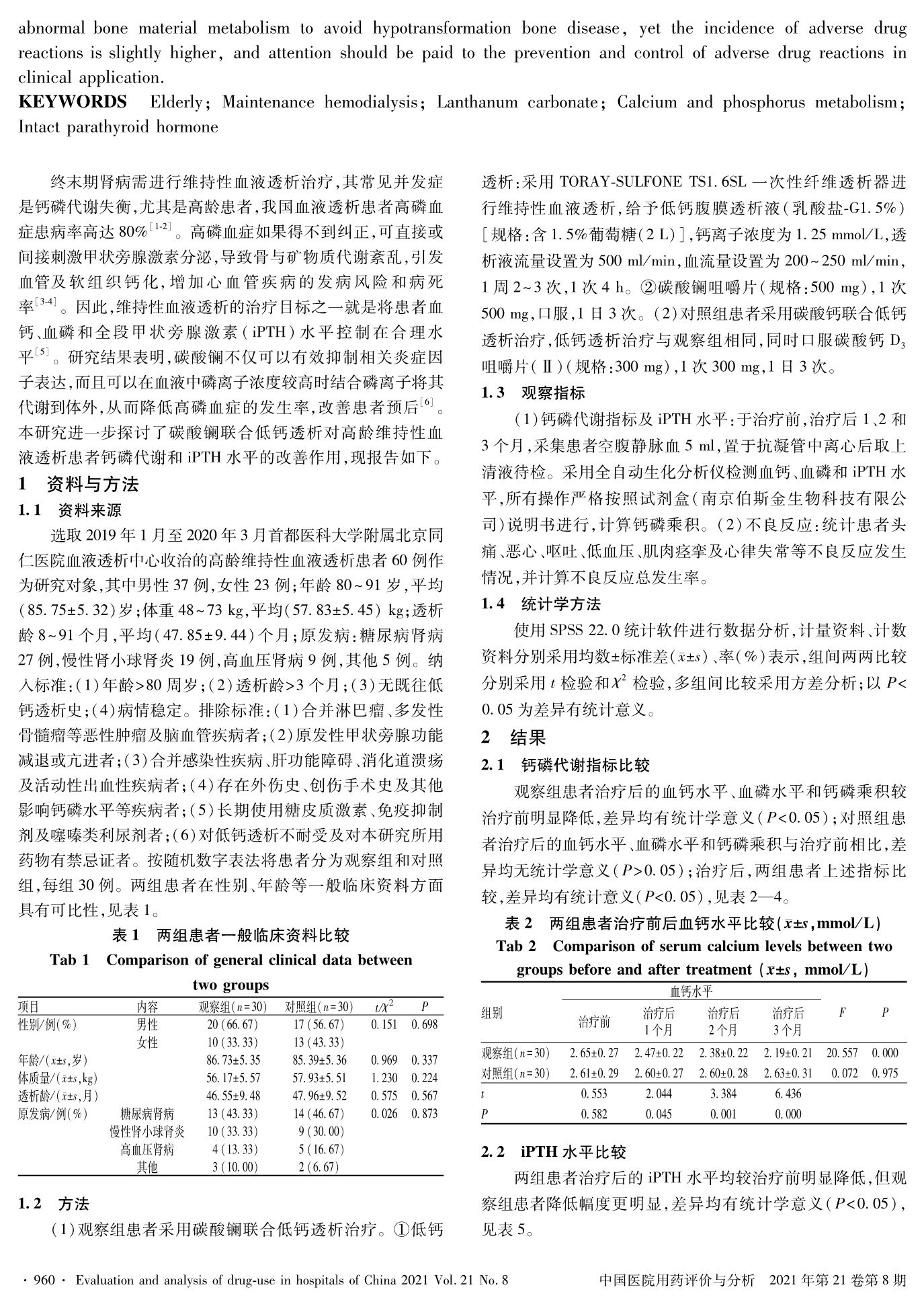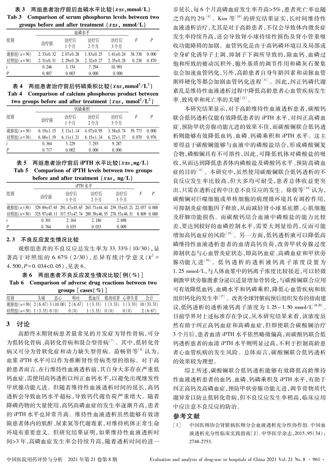 碳酸镧联合低钙透析对高龄维持性血液透析患者钙磷代谢和全段甲状旁腺激素的影响