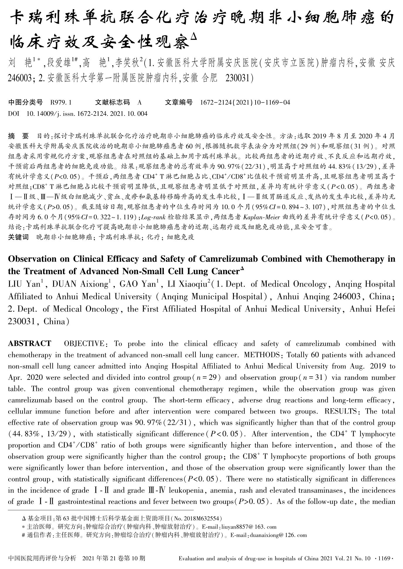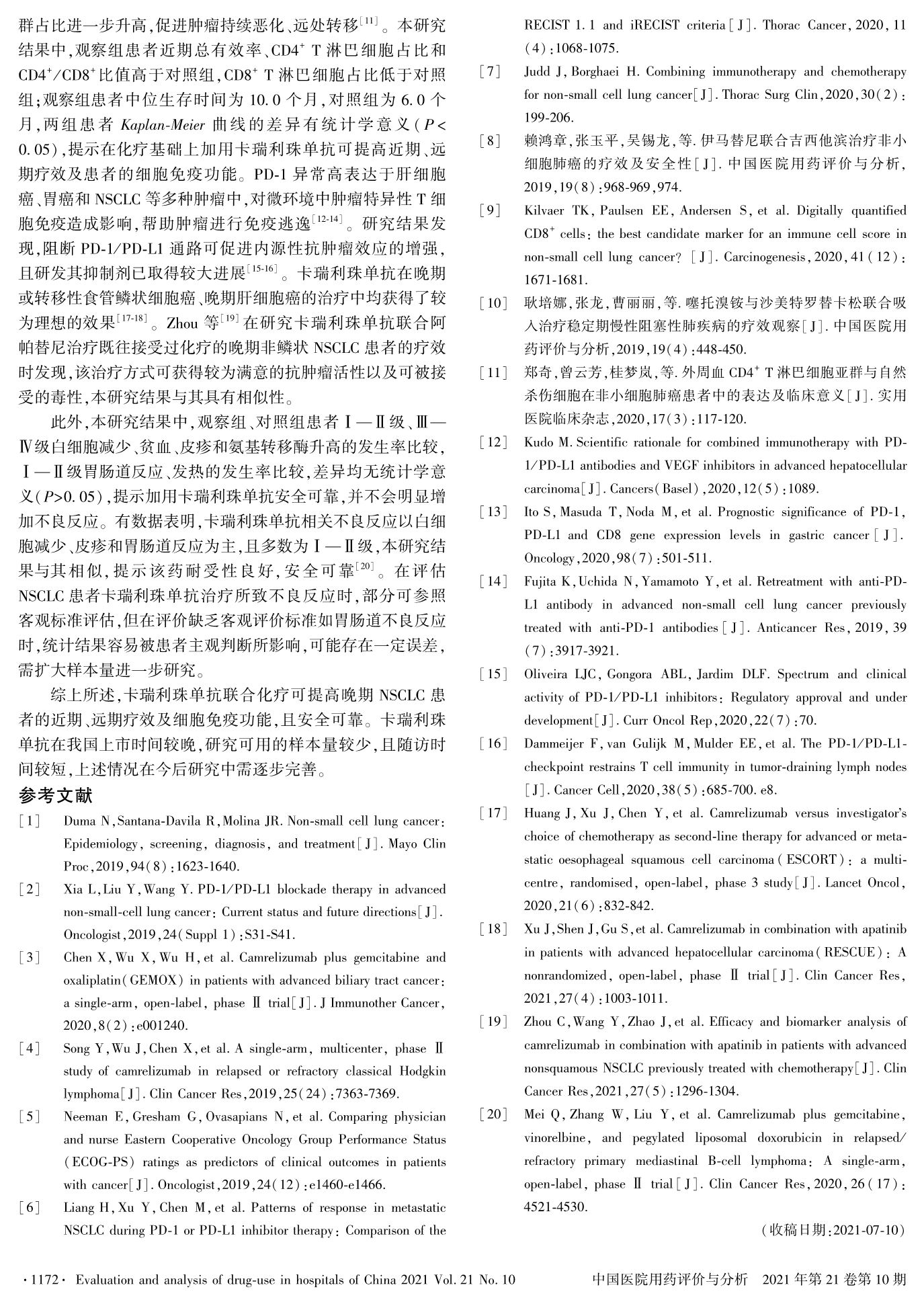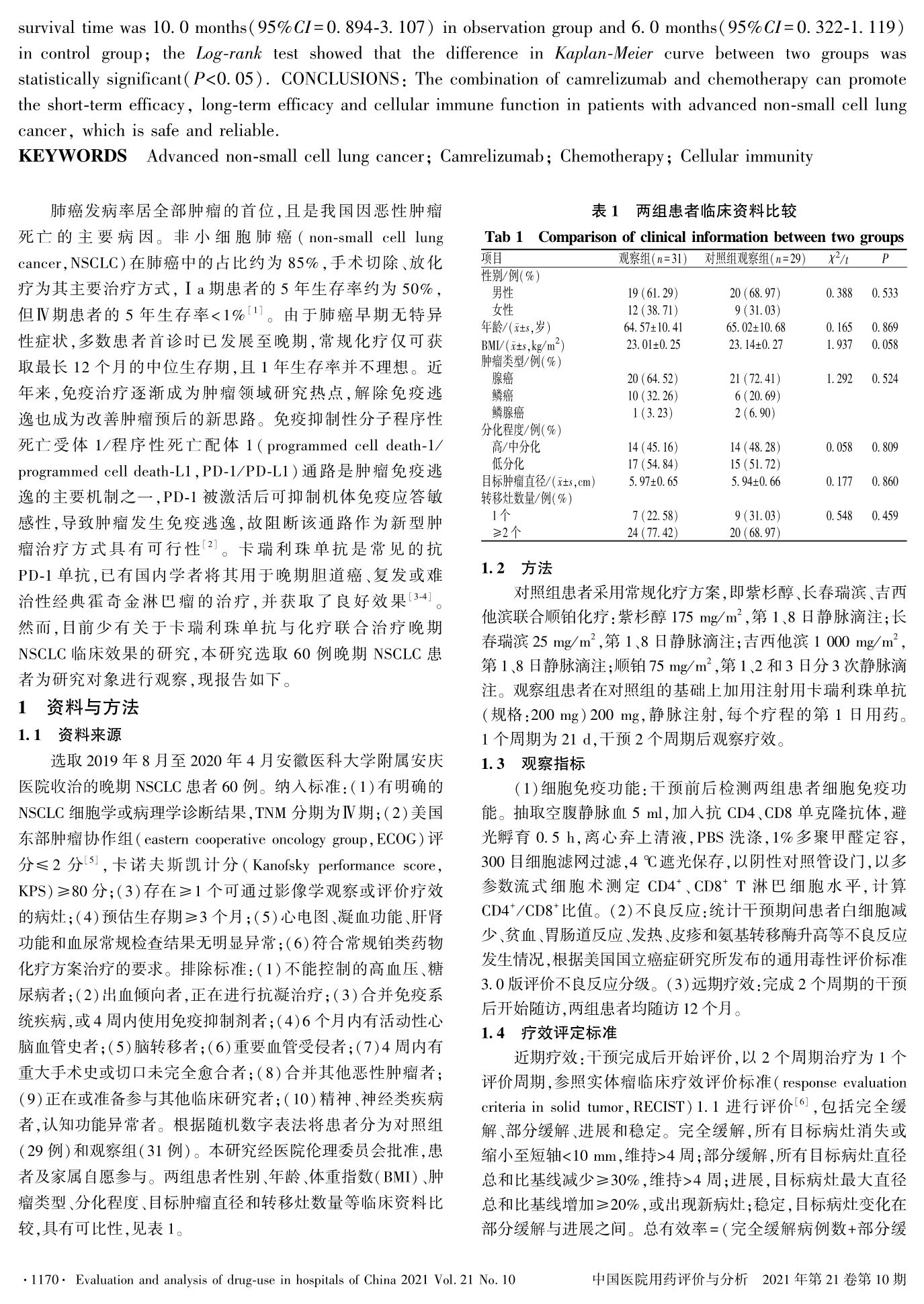 卡瑞利珠单抗联合化疗治疗晚期非小细胞肺癌的临床疗效及安全性观察