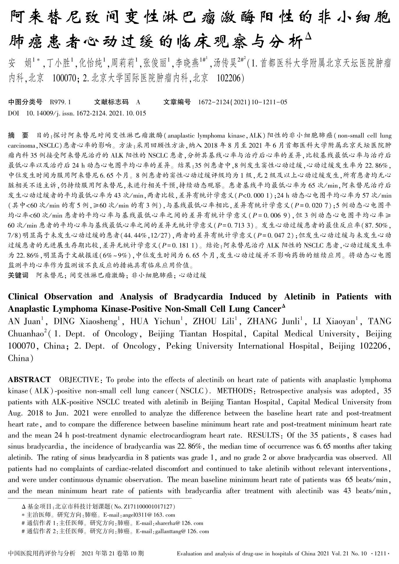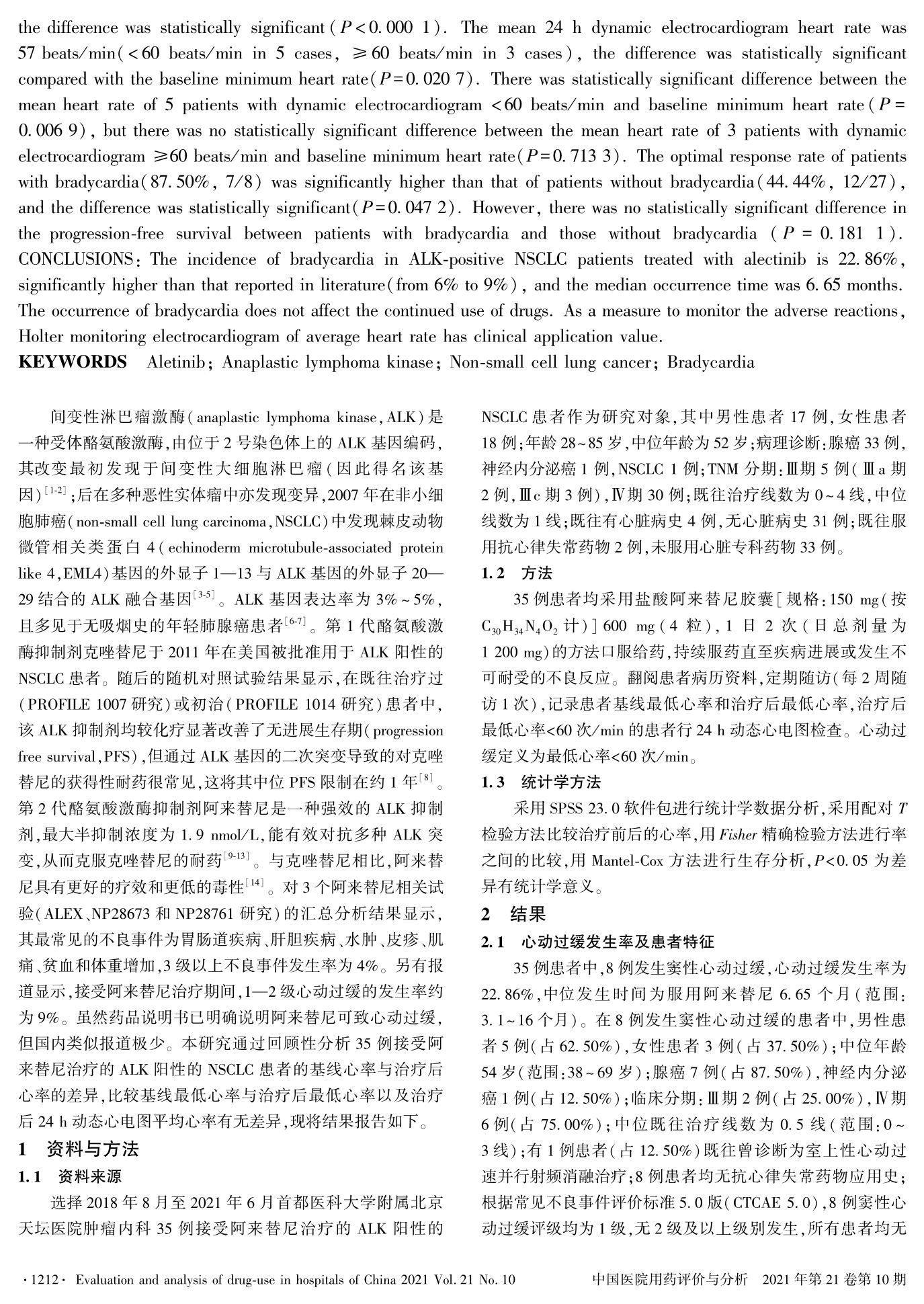 阿来替尼致间变性淋巴瘤激酶阳性的非小细胞肺癌患者心动过缓的临床观察与分析