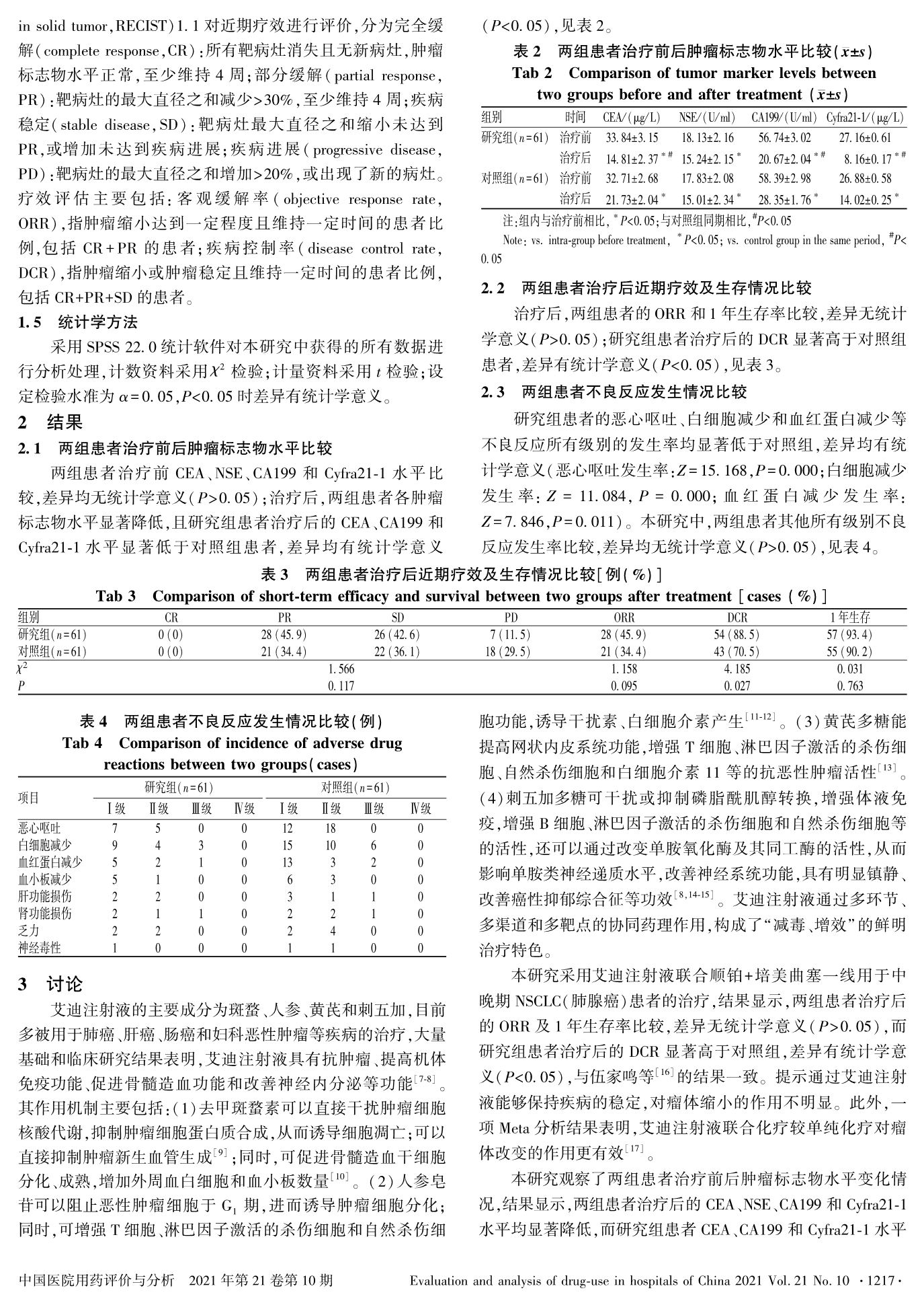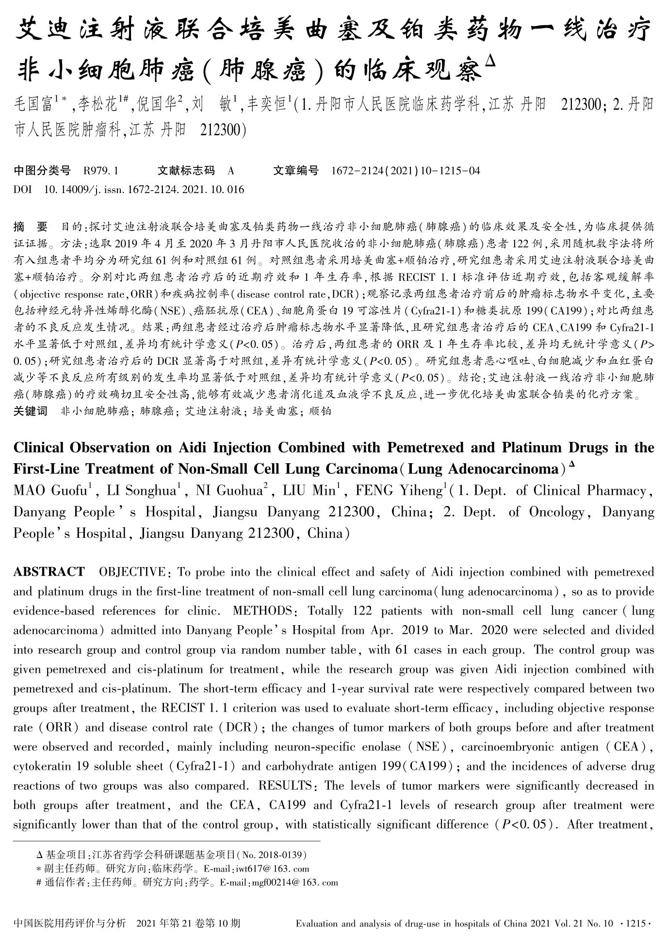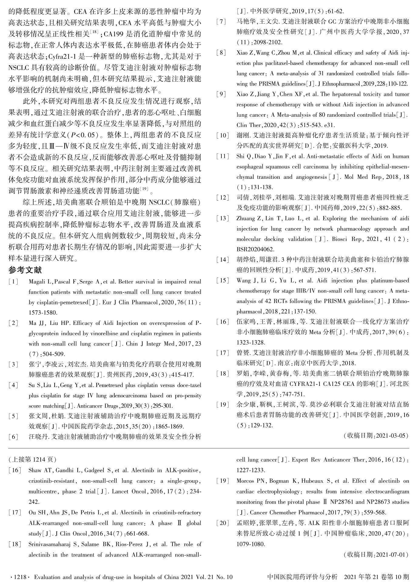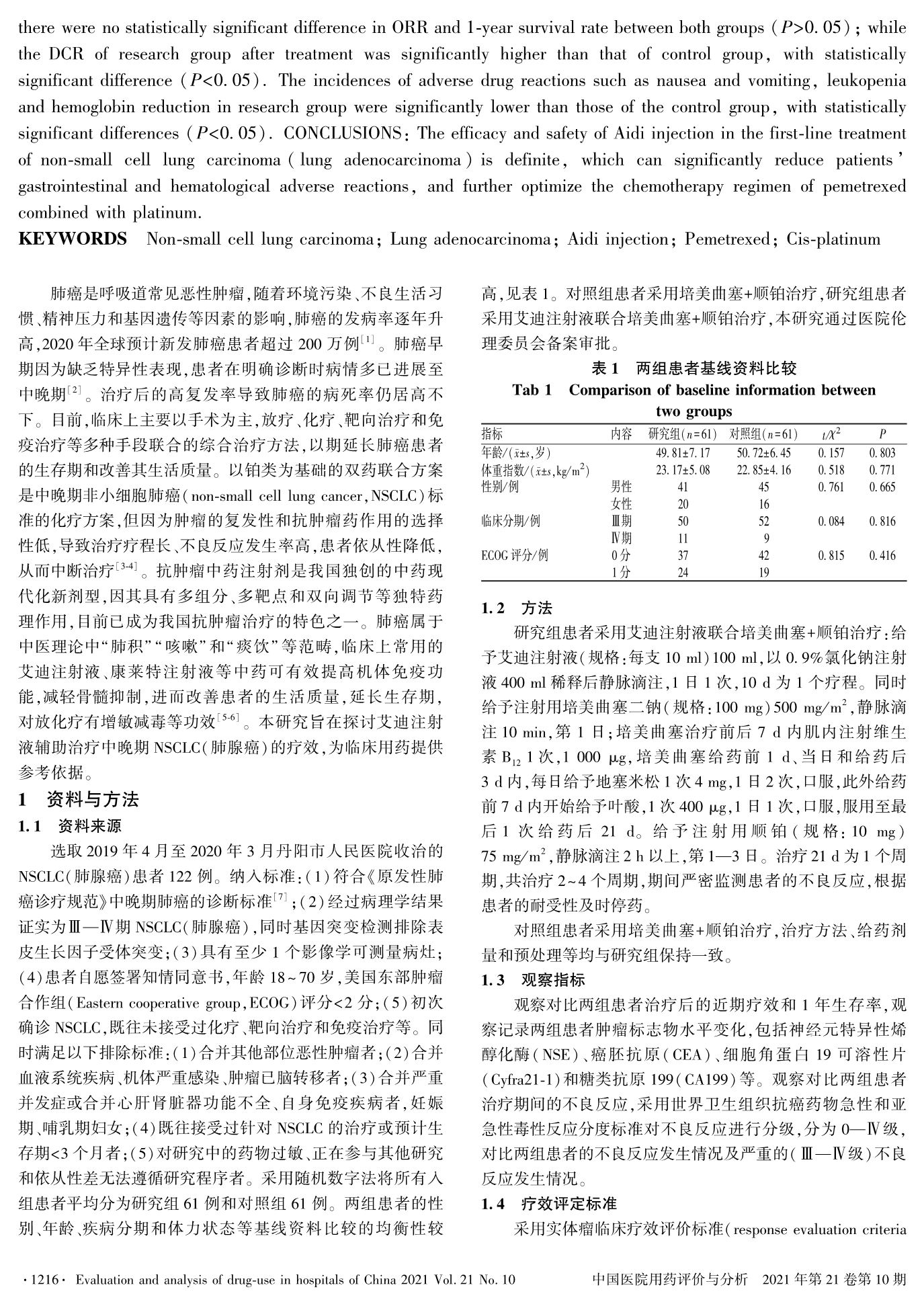 艾迪注射液联合培美曲塞及铂类药物一线治疗非小细胞肺癌(肺腺癌)的临床观察