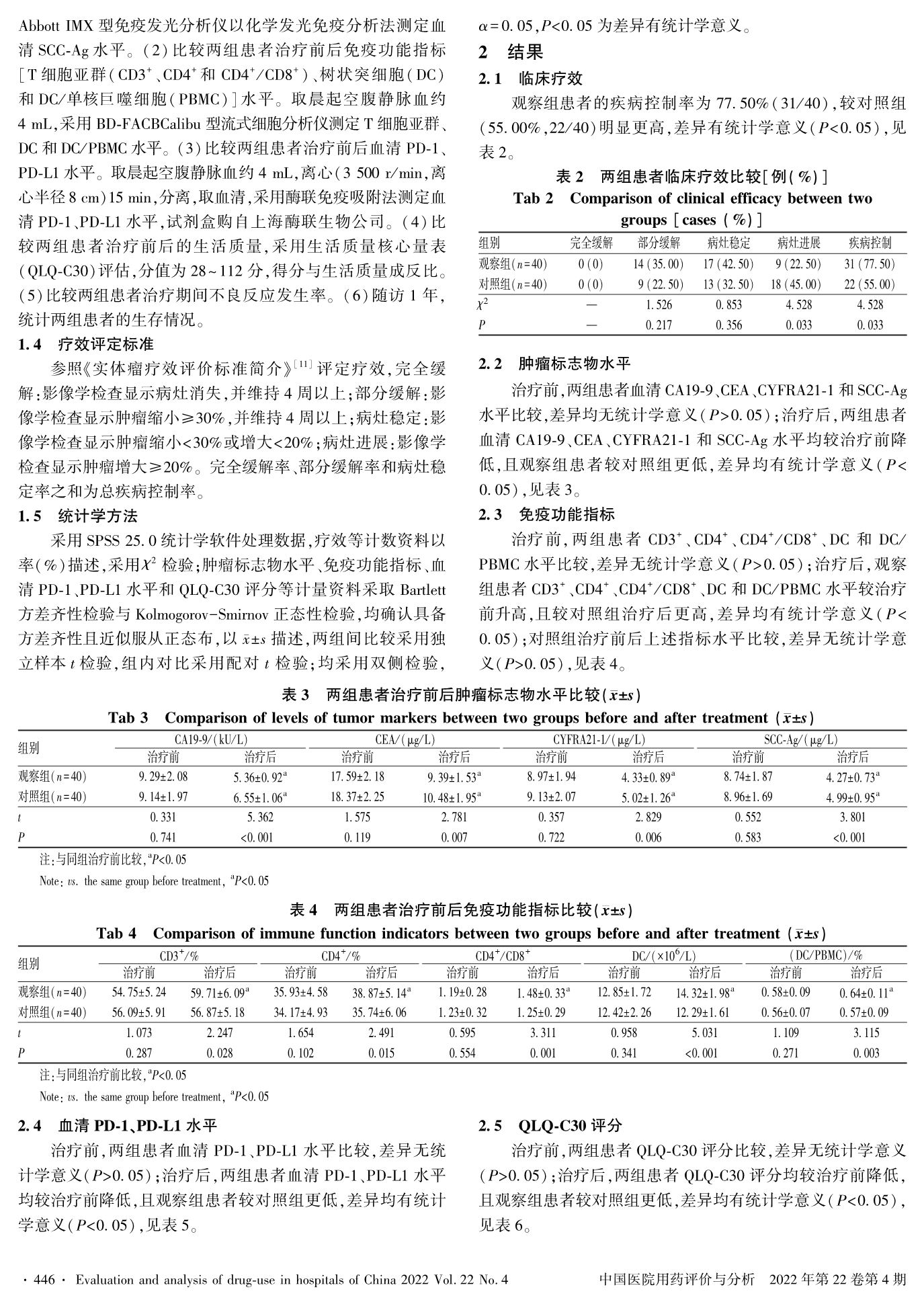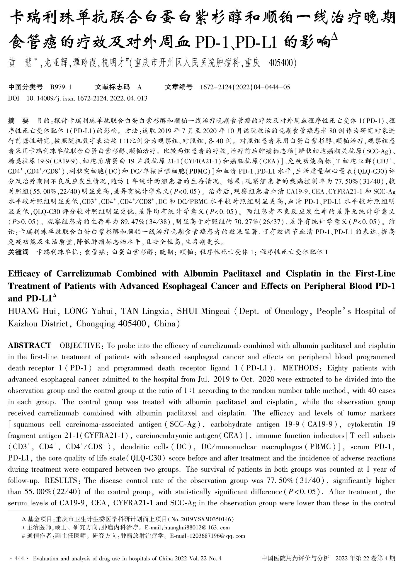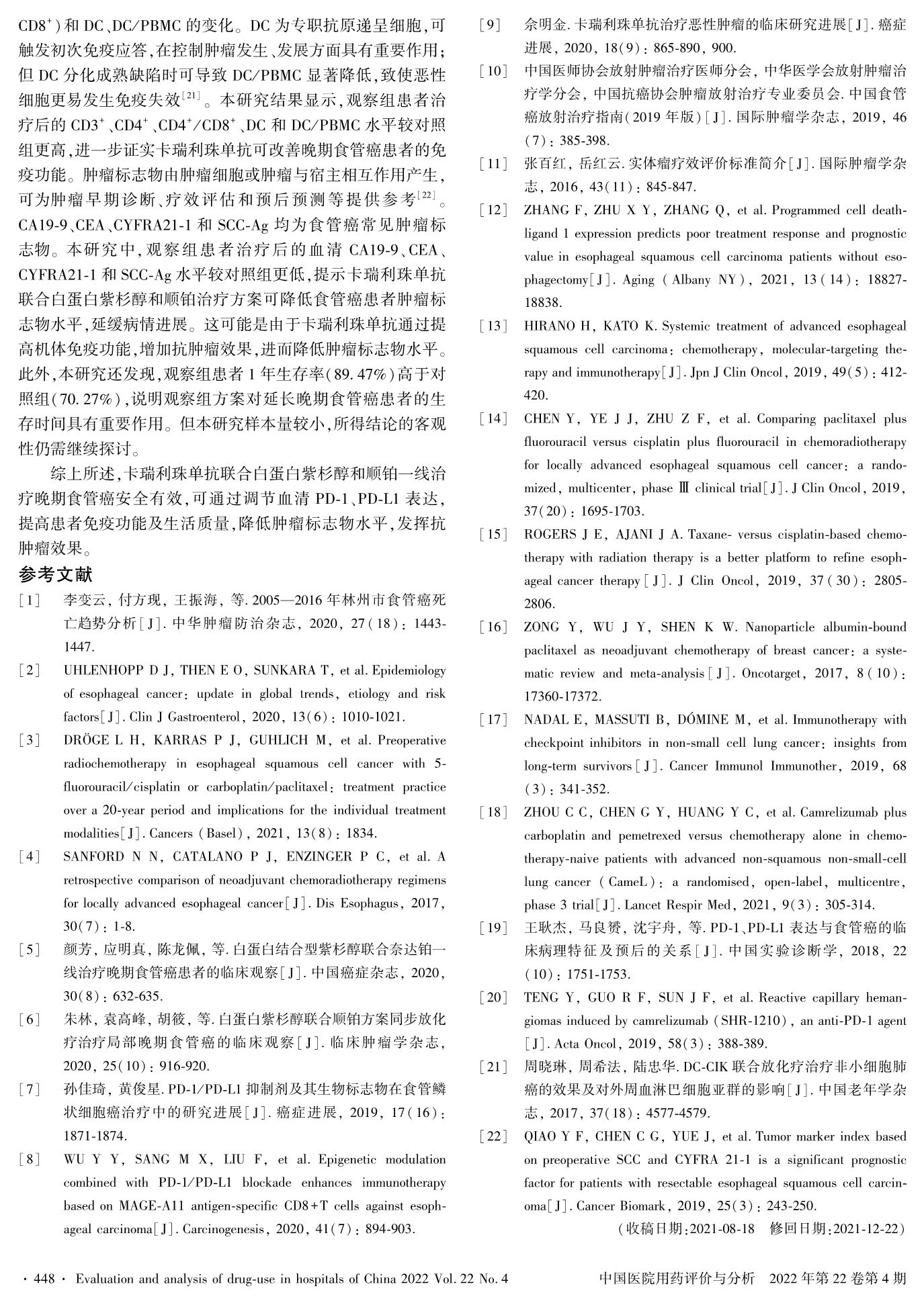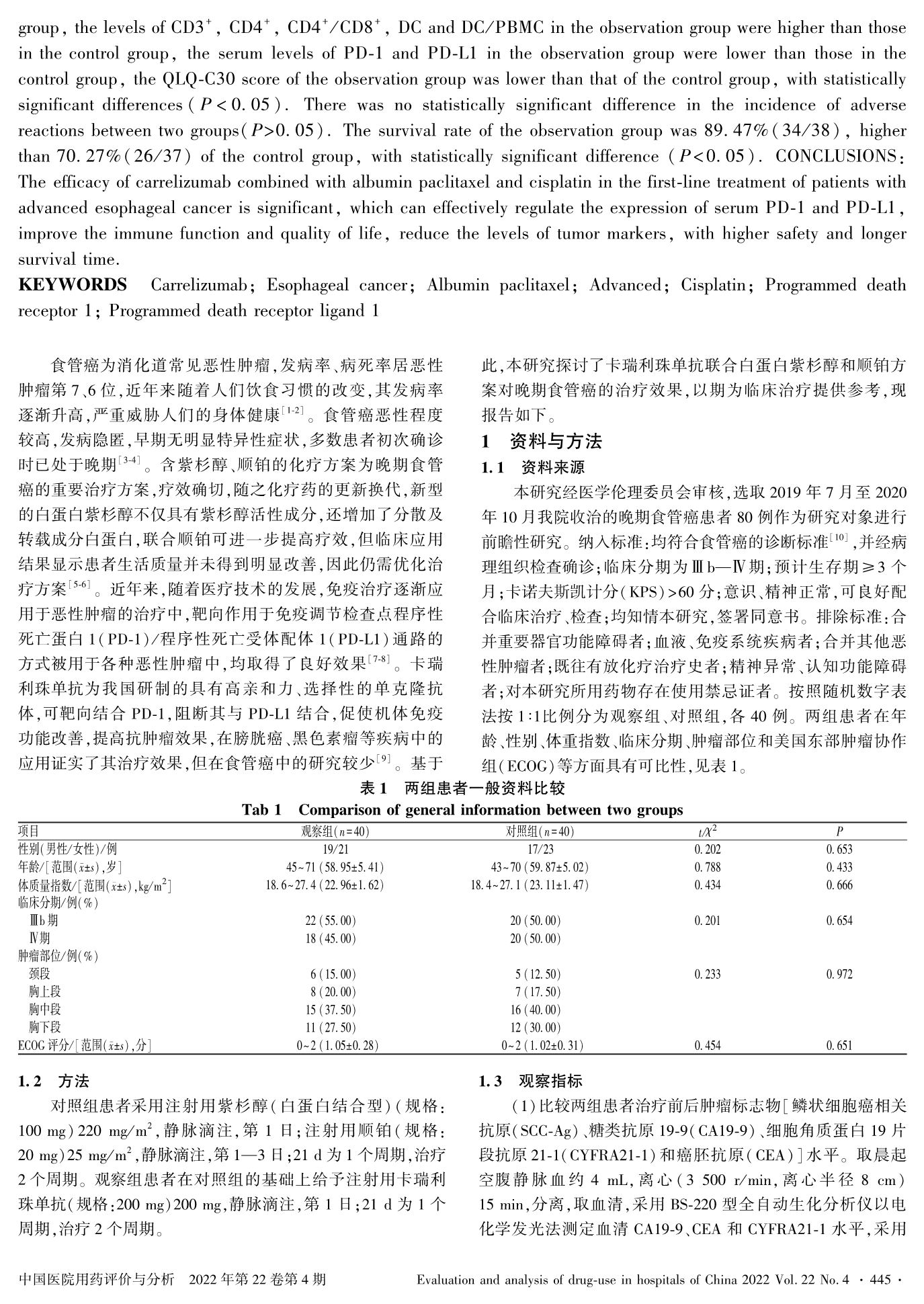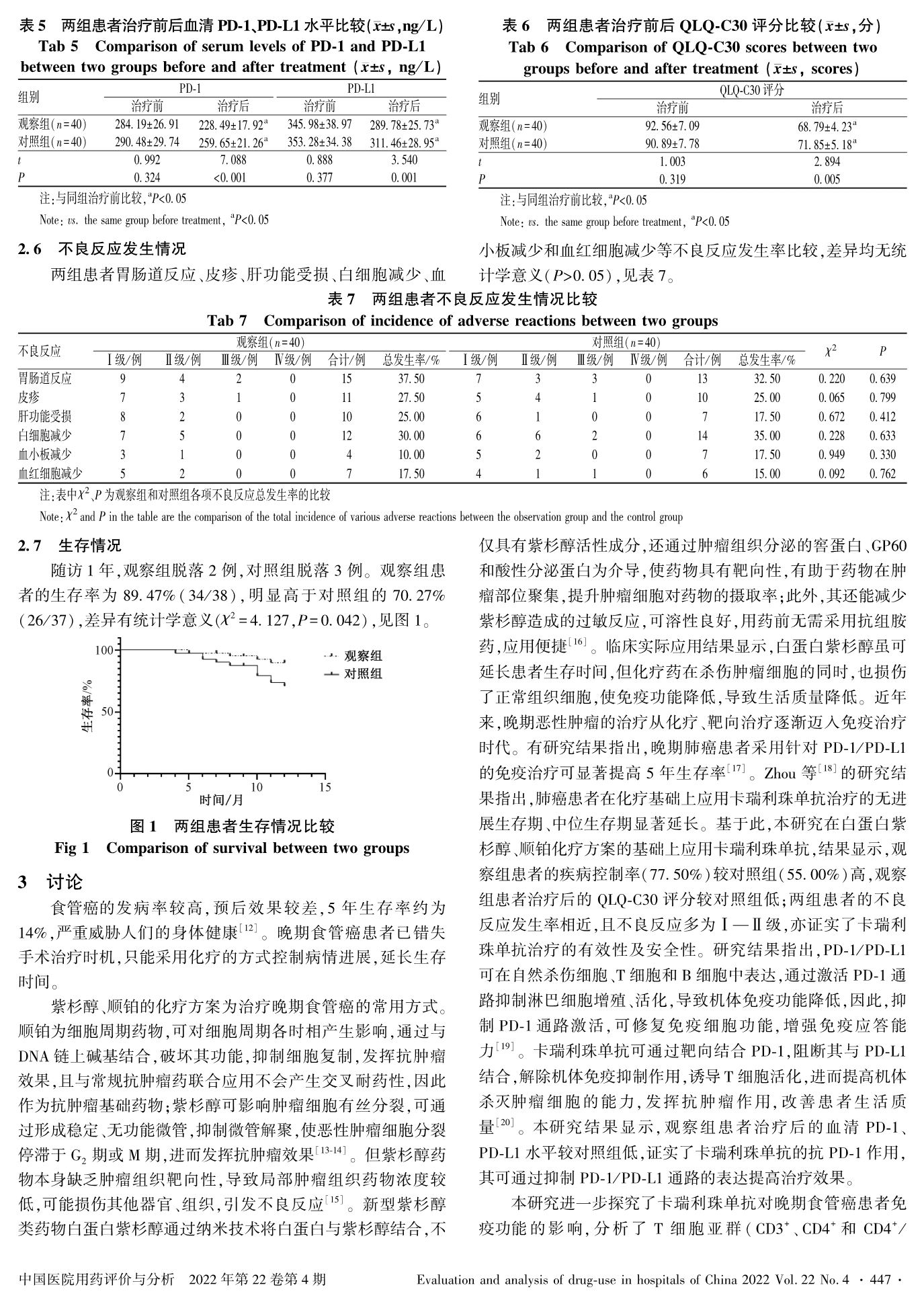 卡瑞利珠单抗联合白蛋白紫杉醇和顺铂一线治疗晚期食管癌的疗效及对外周血PD-1、PD-L1的影响