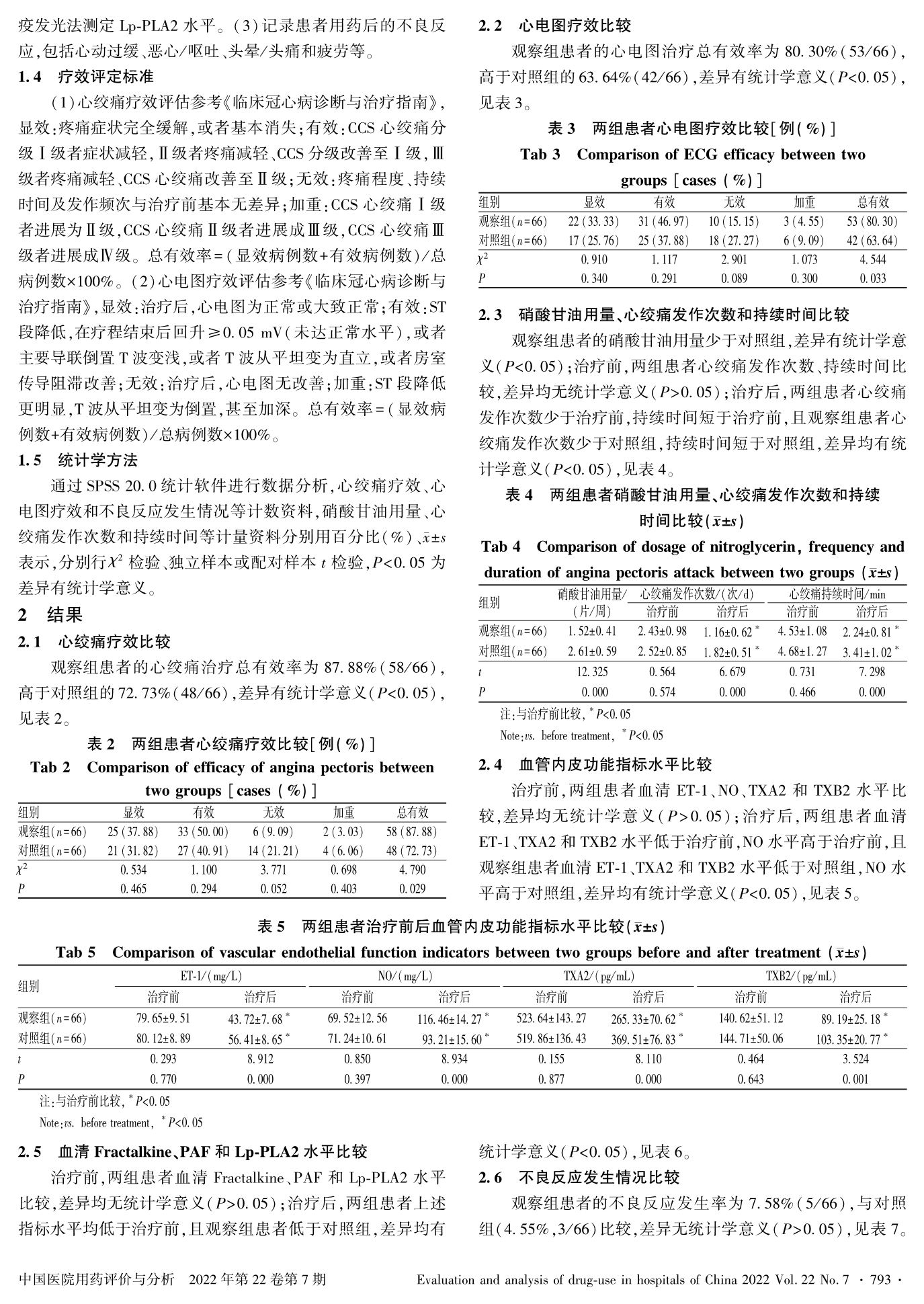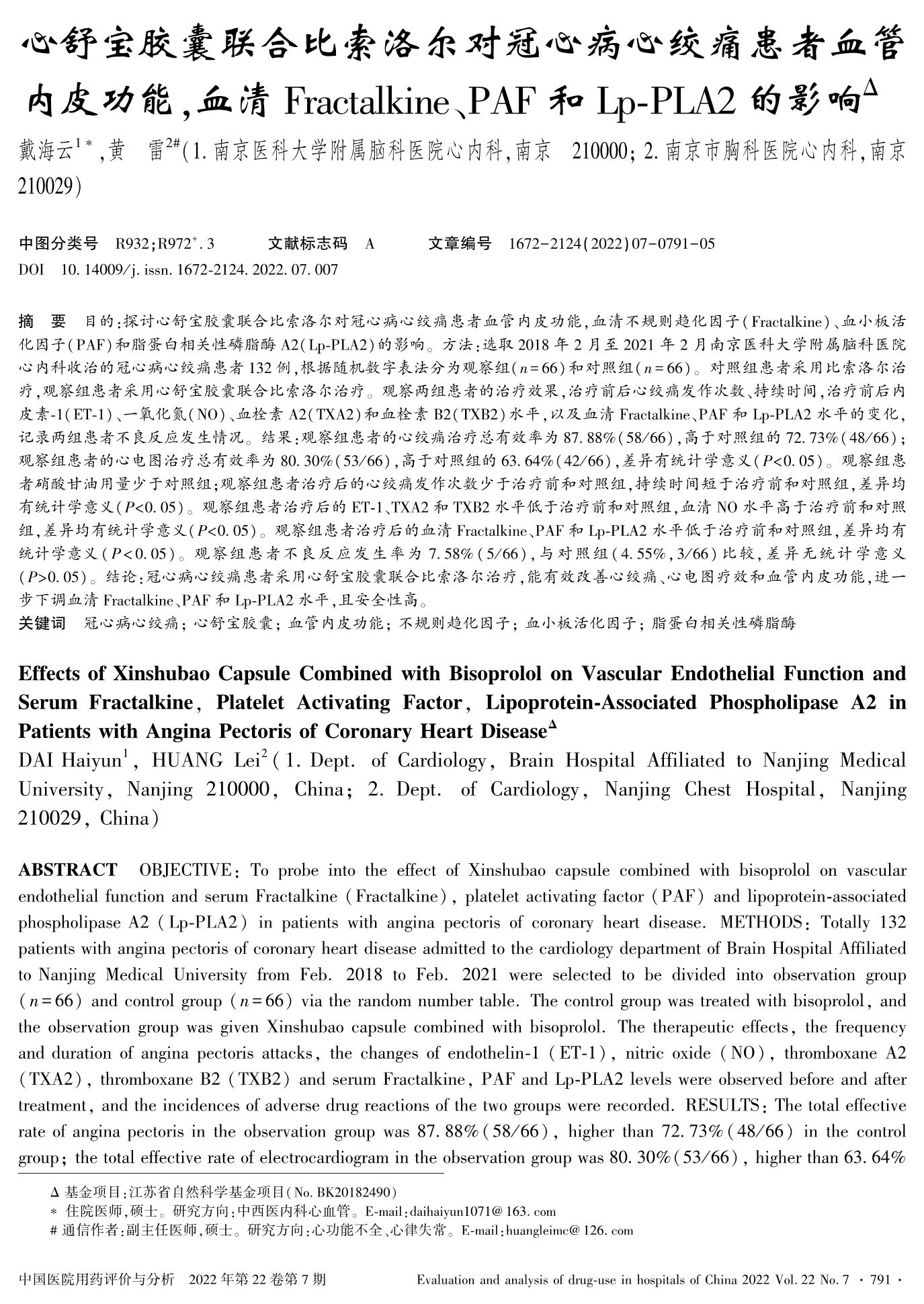 心舒宝胶囊联合比索洛尔对冠心病心绞痛患者血管内皮功能,血清Fractalkine、PAF和Lp-PLA2的影响