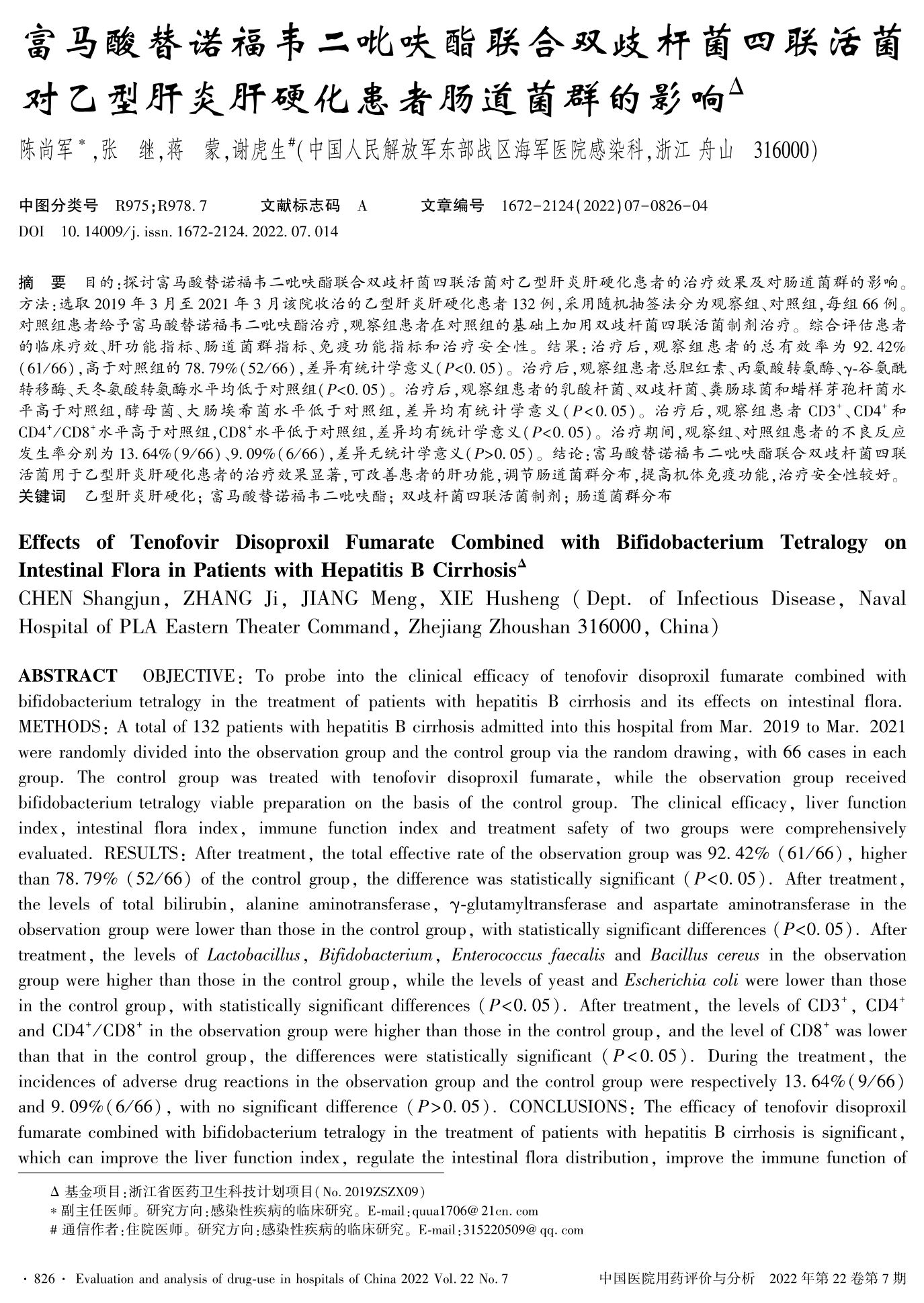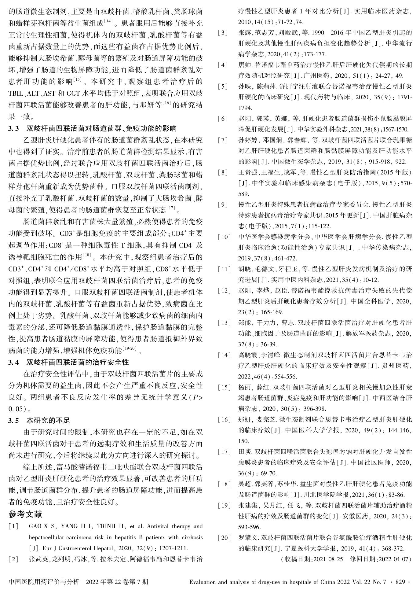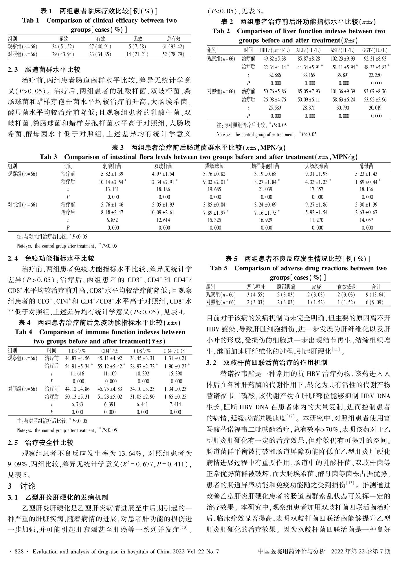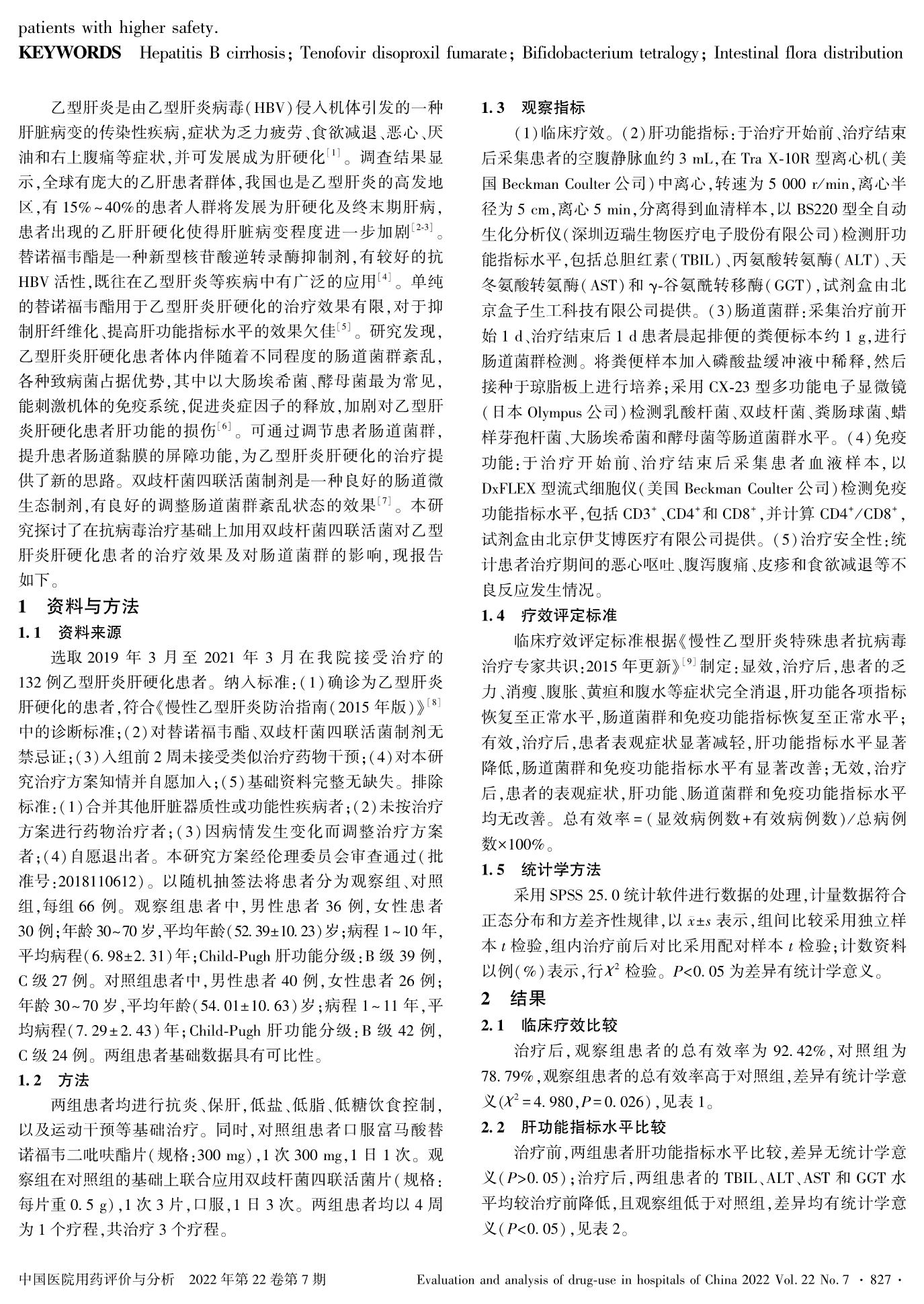 富马酸替诺福韦二吡呋酯联合双歧杆菌四联活菌对乙型肝炎肝硬化患者肠道菌群的影响