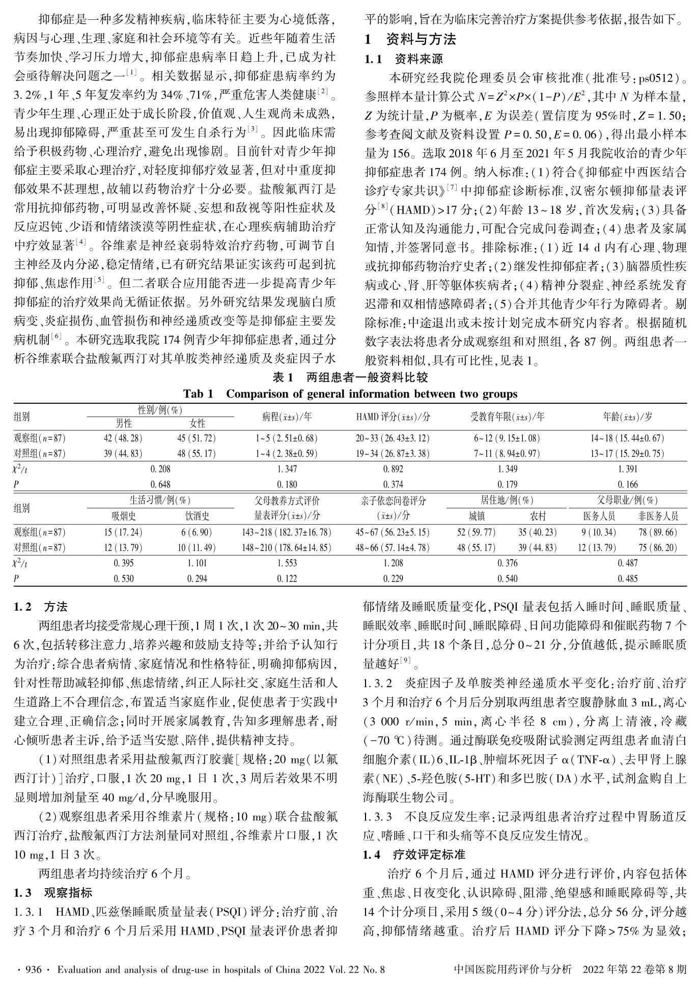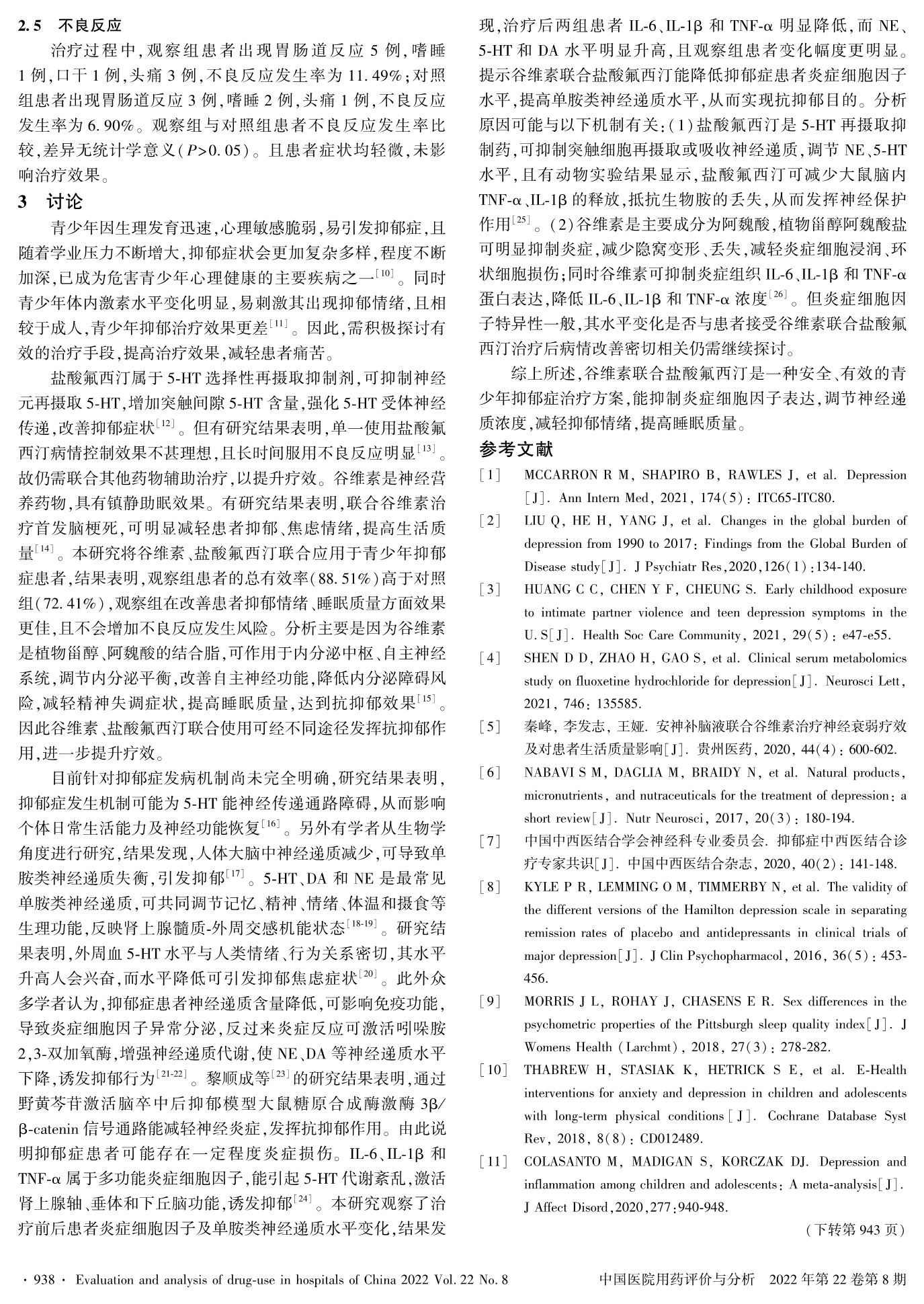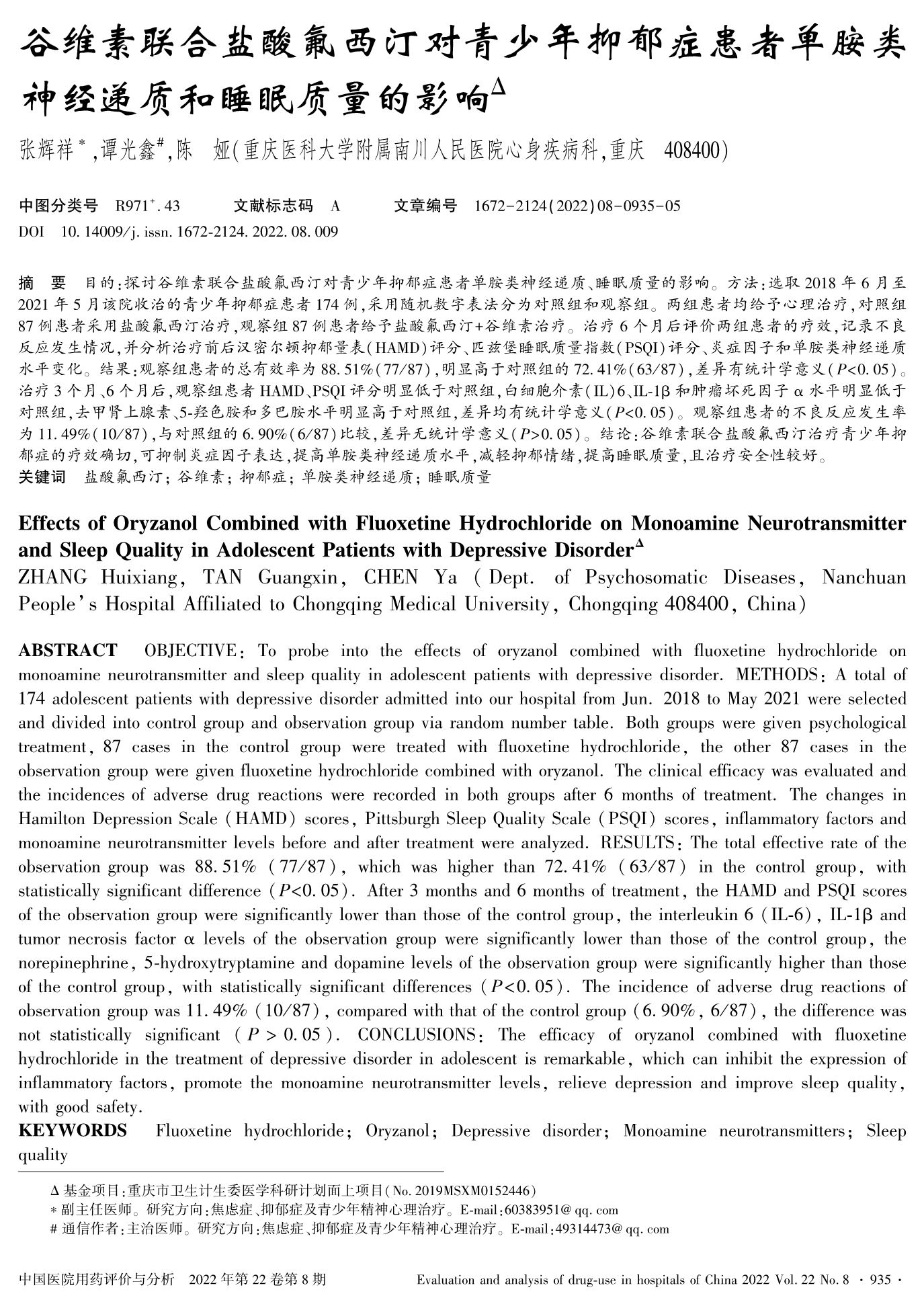 谷维素联合盐酸氟西汀对青少年抑郁症患者单胺类神经递质和睡眠质量的影响
