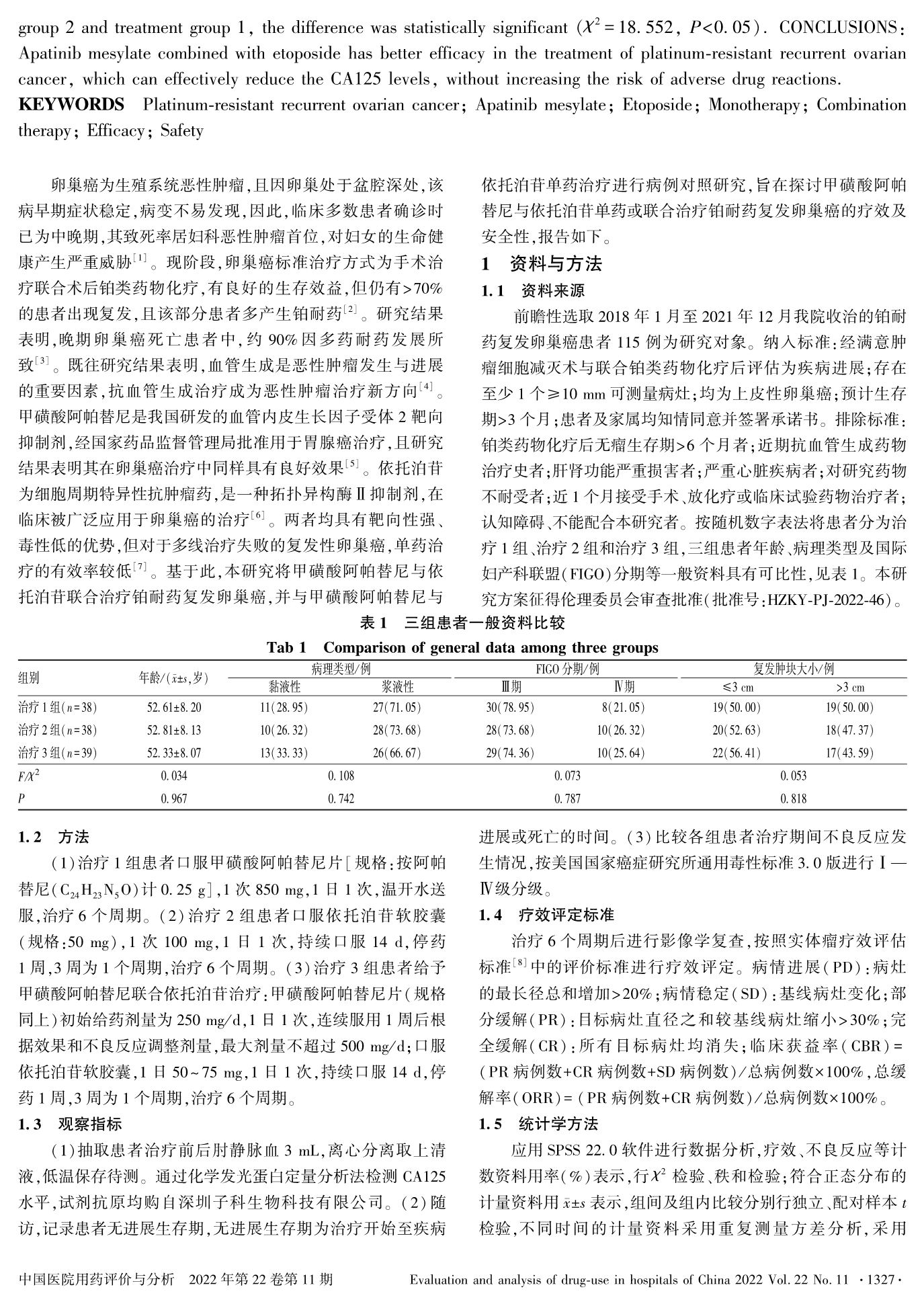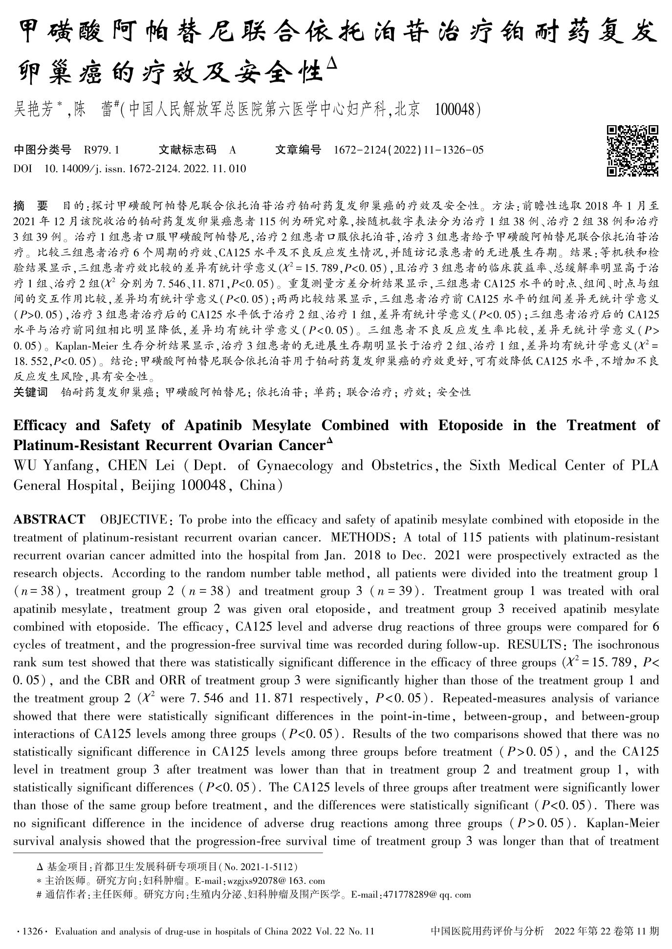 甲磺酸阿帕替尼联合依托泊苷治疗铂耐药复发卵巢癌的疗效及安全性