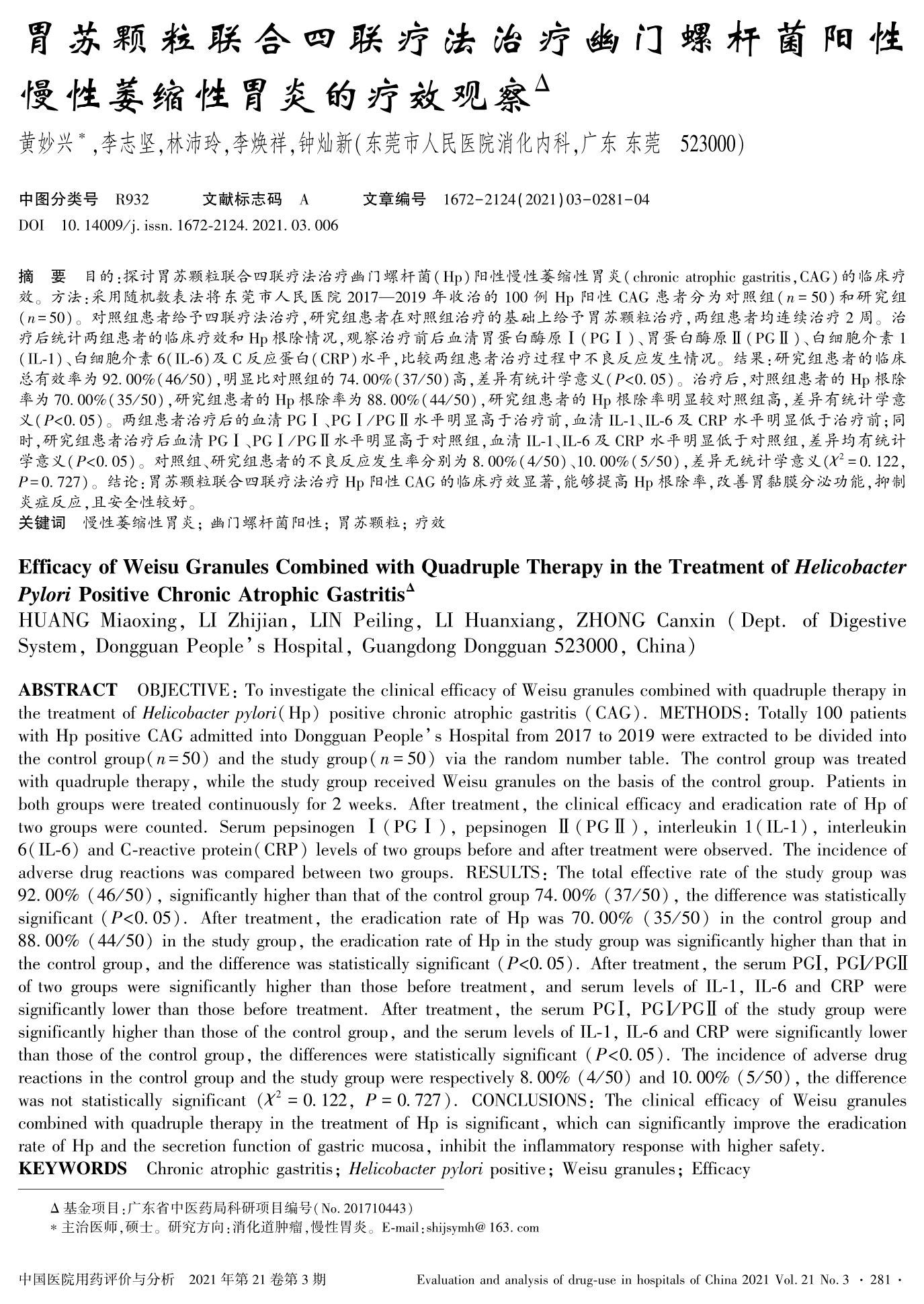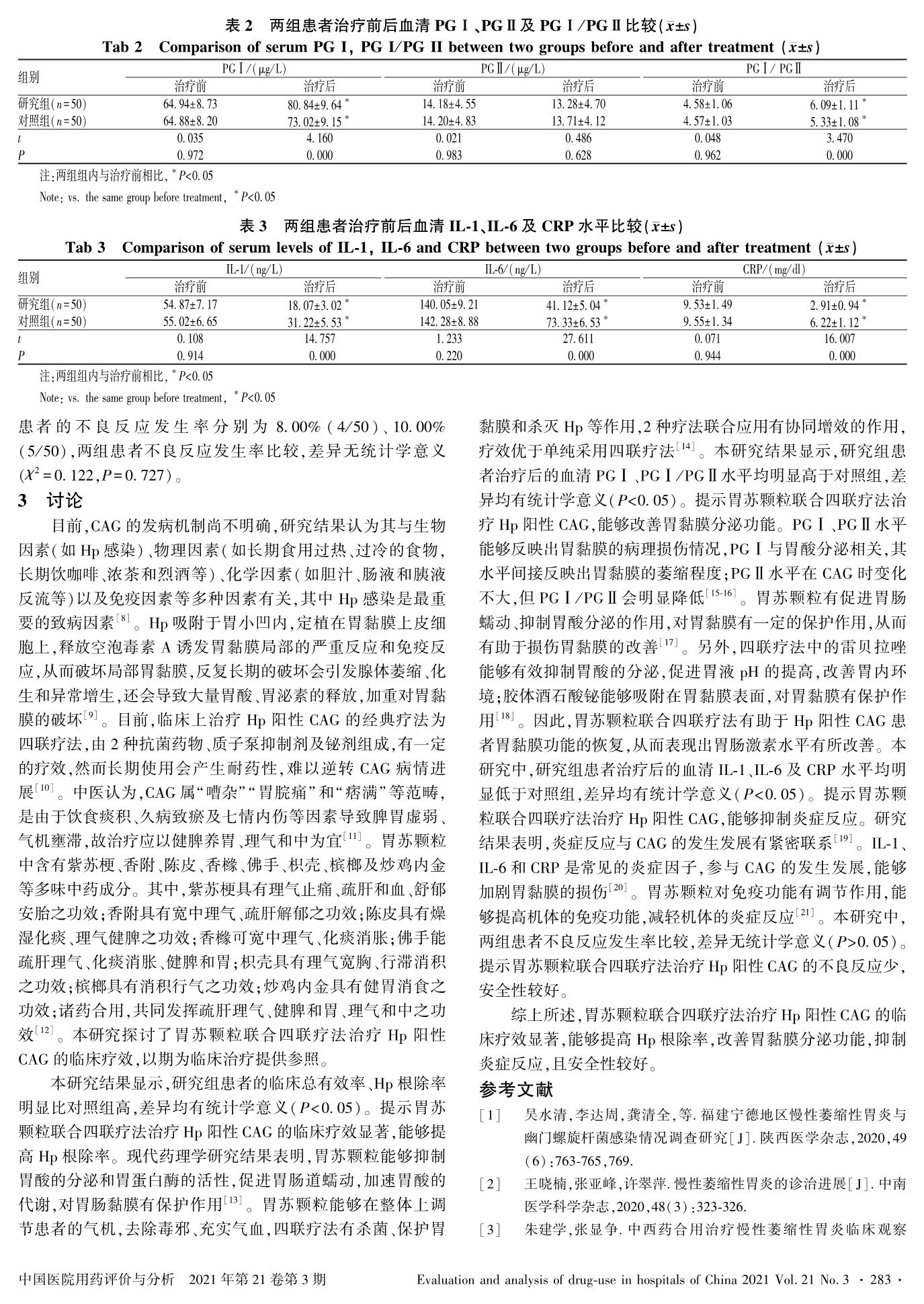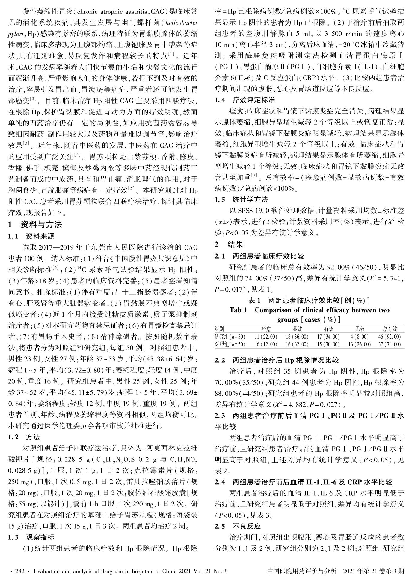 胃苏颗粒联合四联疗法治疗幽门螺杆菌阳性慢性萎缩性胃炎的疗效观察