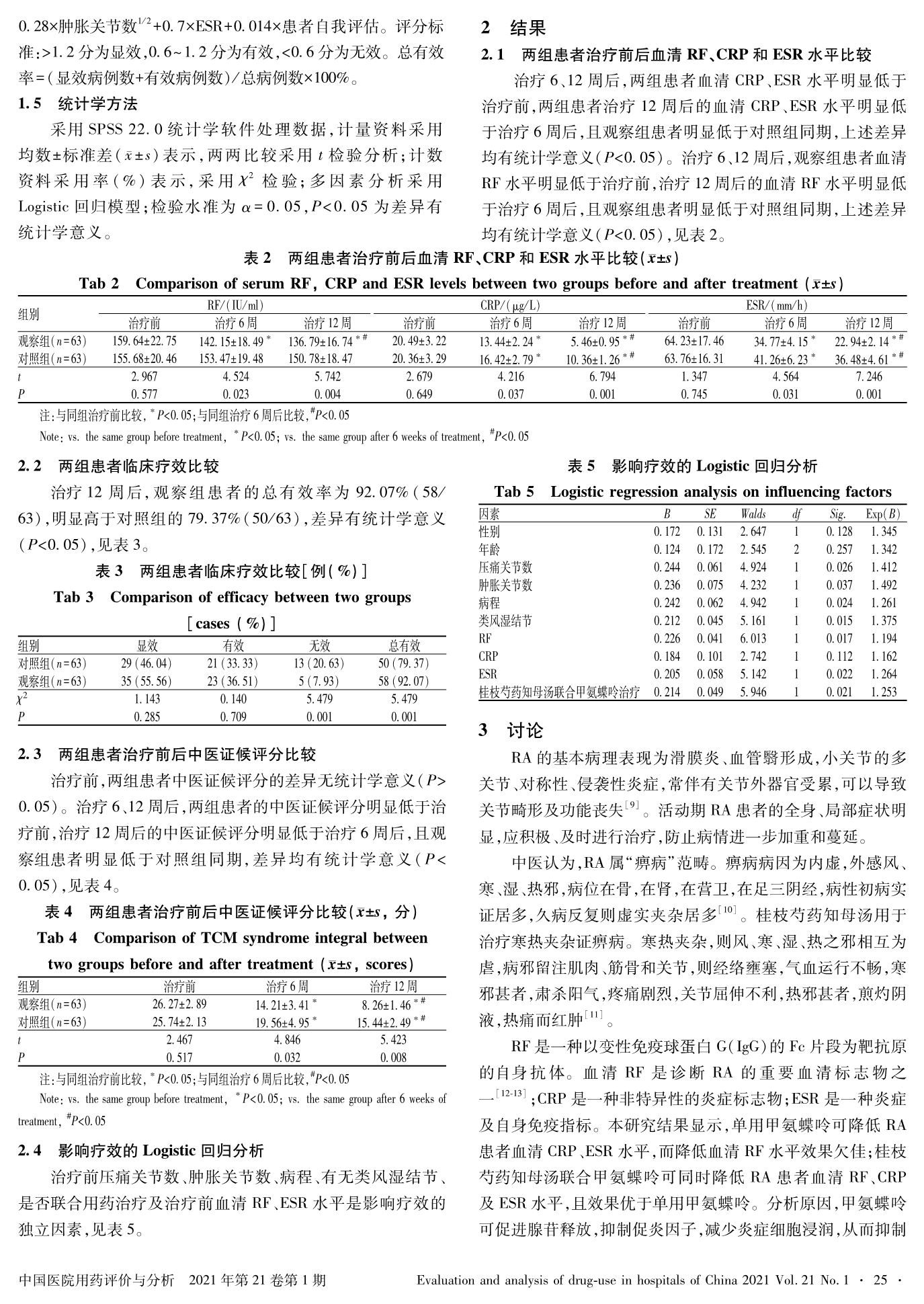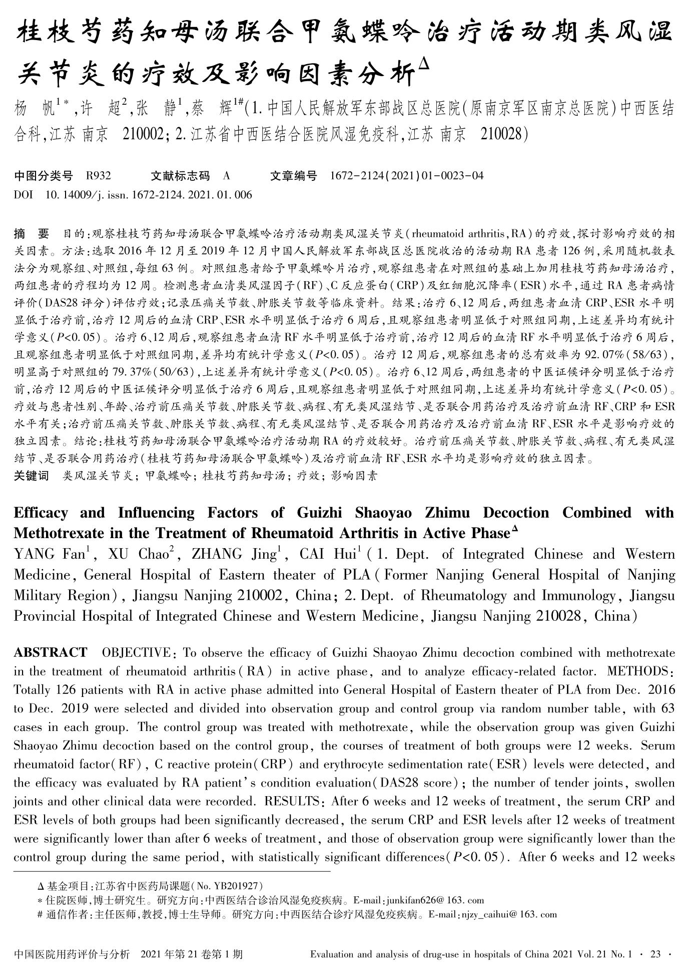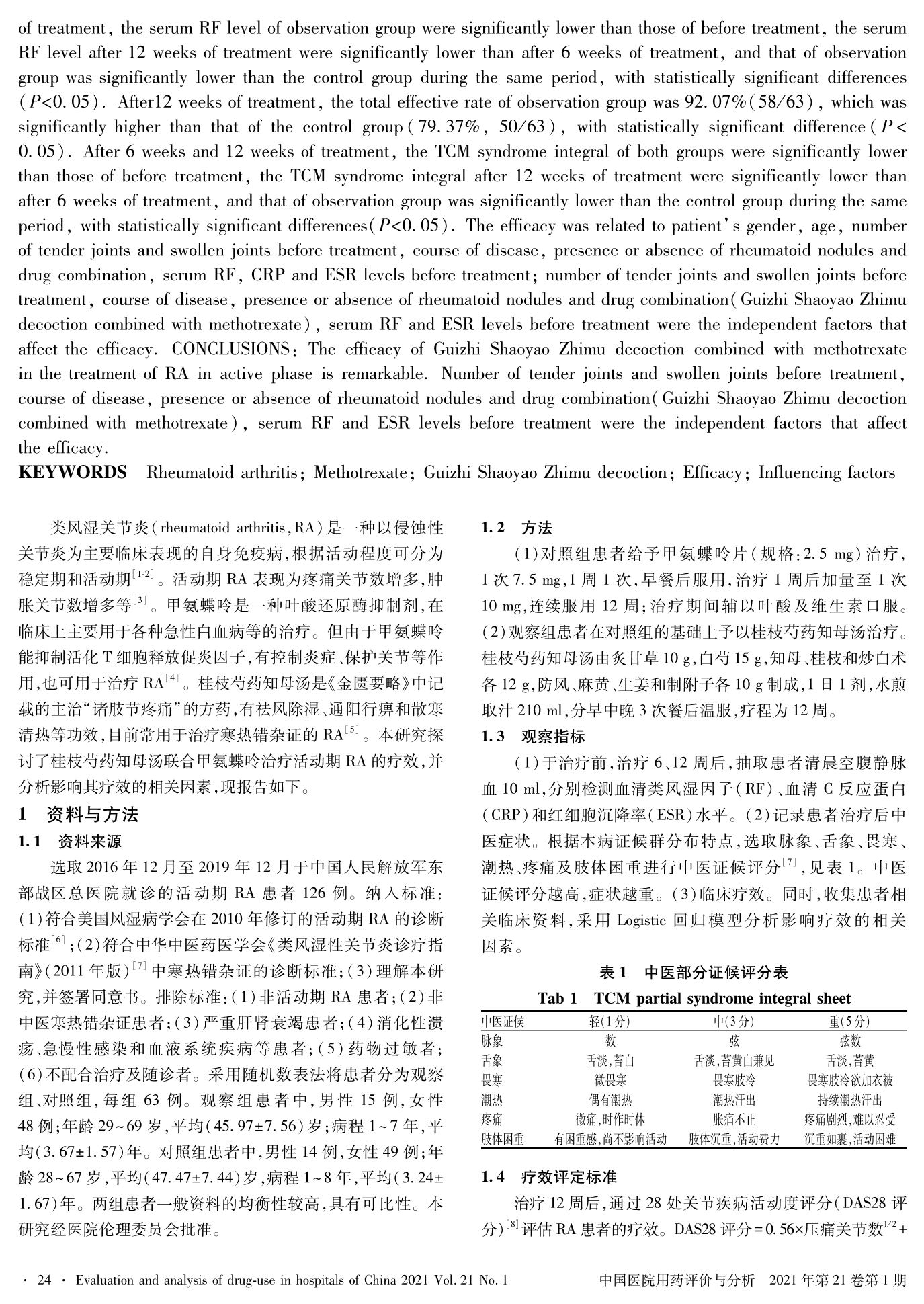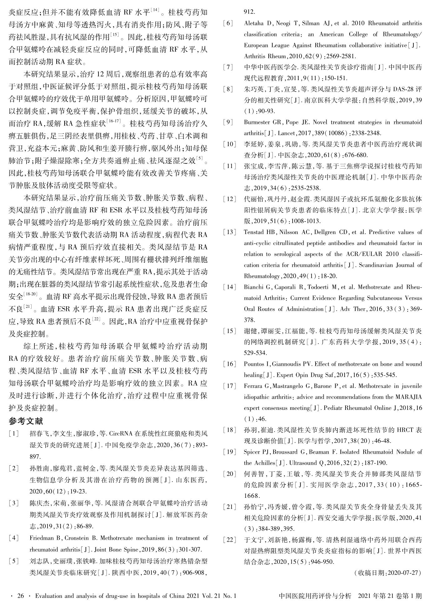 桂枝芍药知母汤联合甲氨蝶呤治疗活动期类风湿关节炎的疗效及影响因素分析
