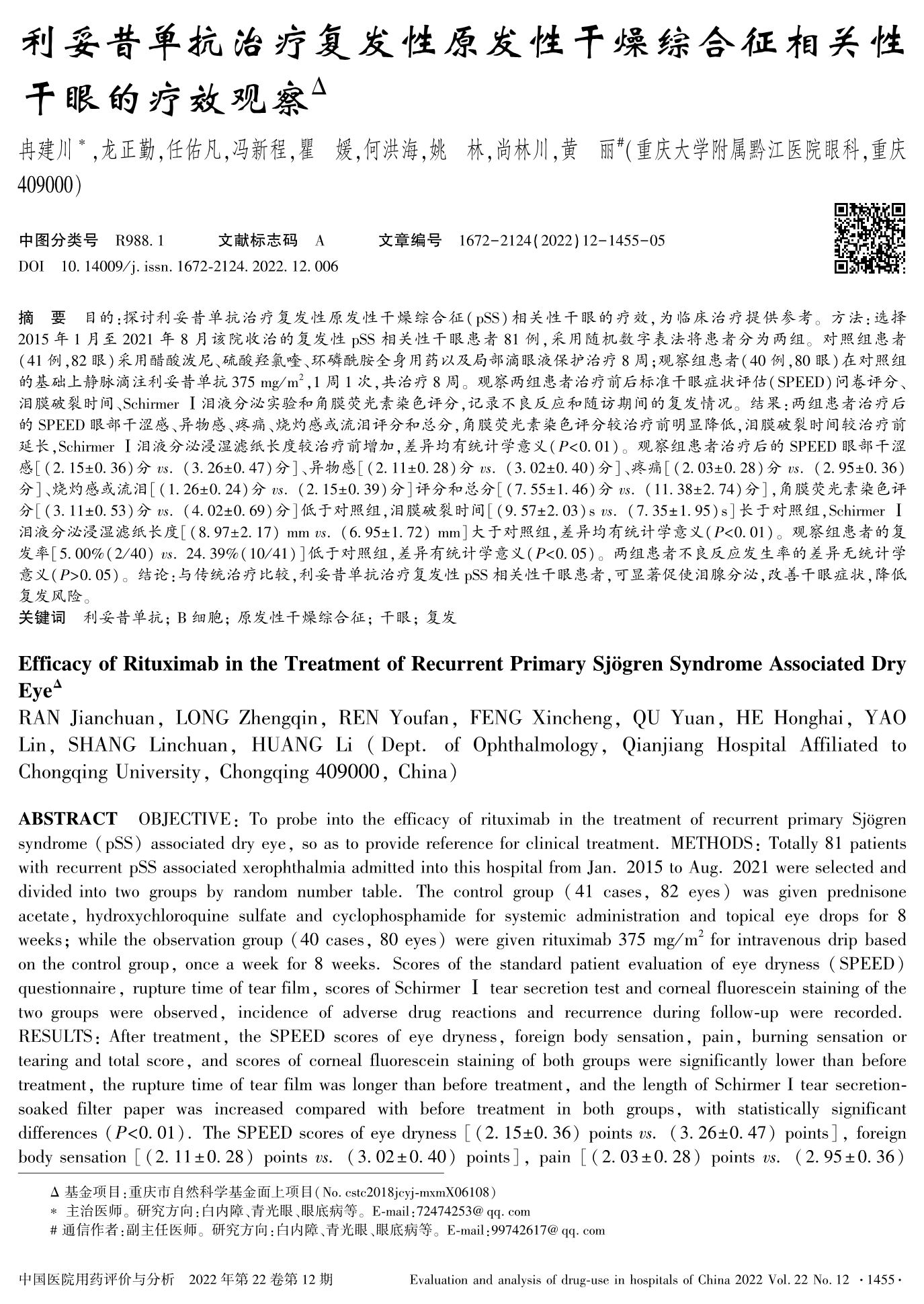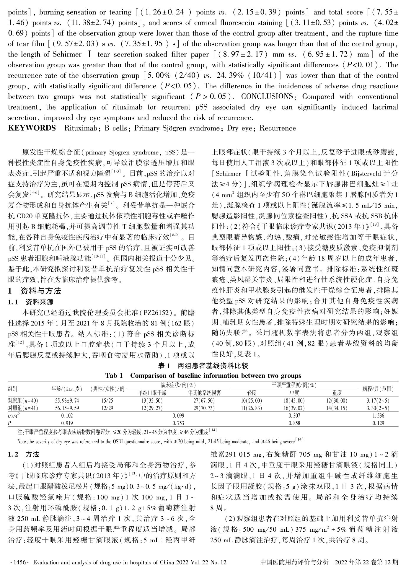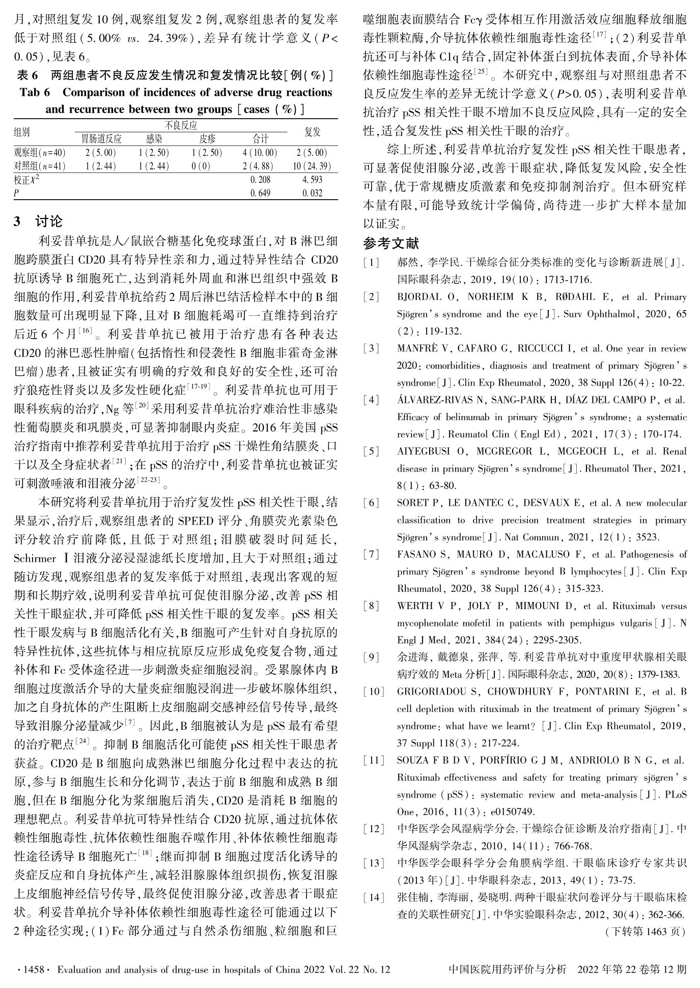 利妥昔单抗治疗复发性原发性干燥综合征相关性干眼的疗效观察