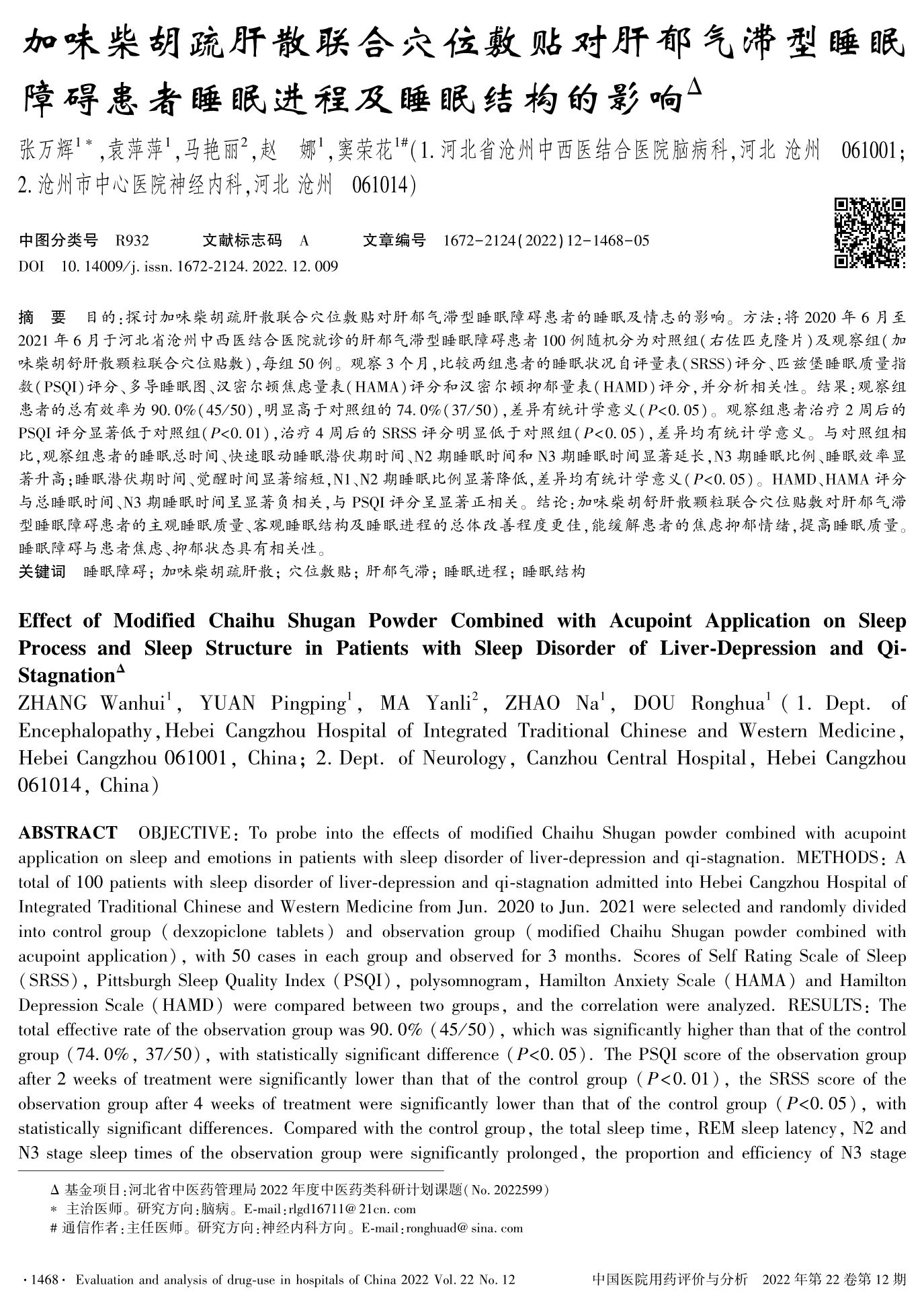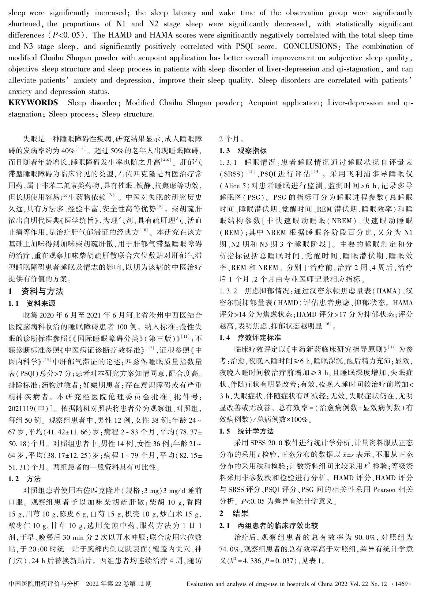 加味柴胡疏肝散联合穴位敷贴对肝郁气滞型睡眠障碍患者睡眠进程及睡眠结构的影响