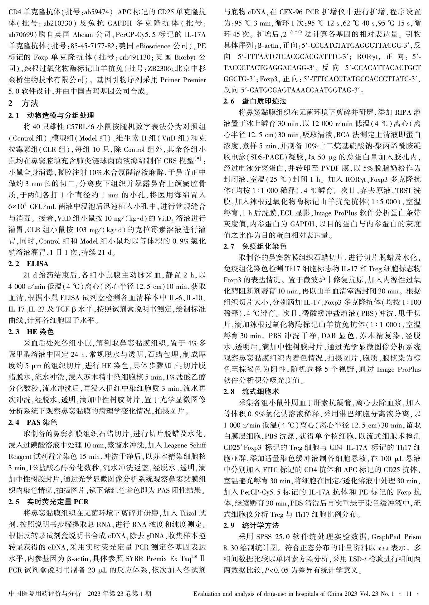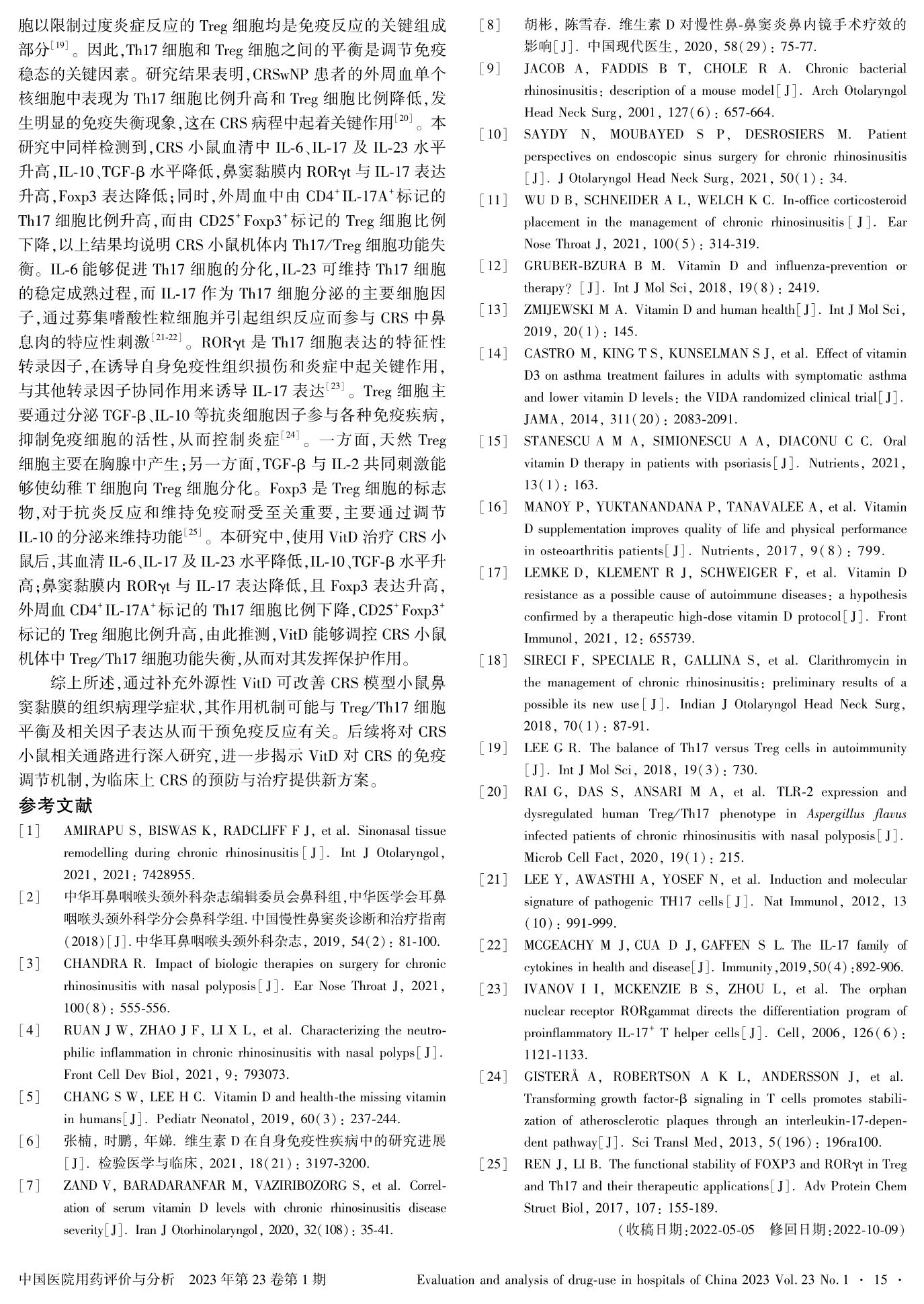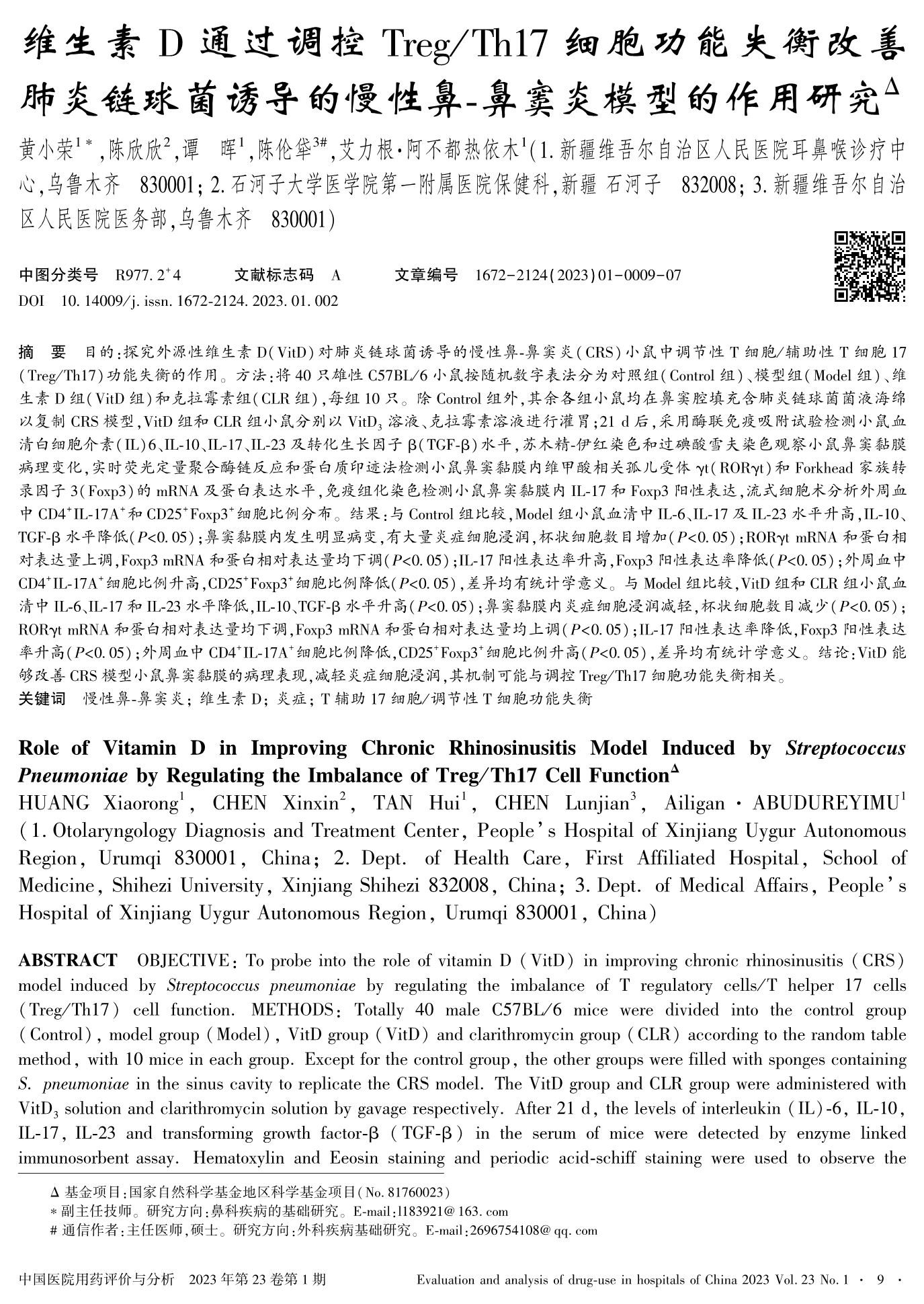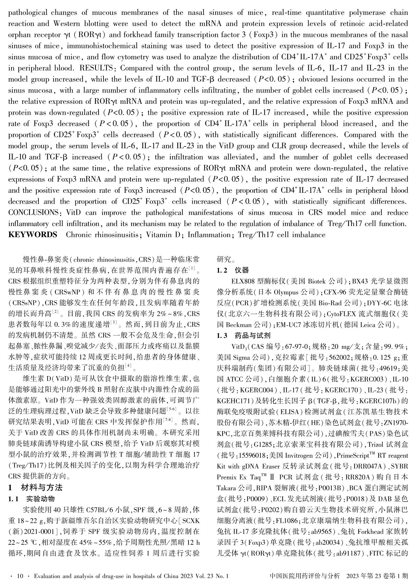 维生素D通过调控Treg/Th17细胞功能失衡改善肺炎链球菌诱导的慢性鼻-鼻窦炎模型的作用研究