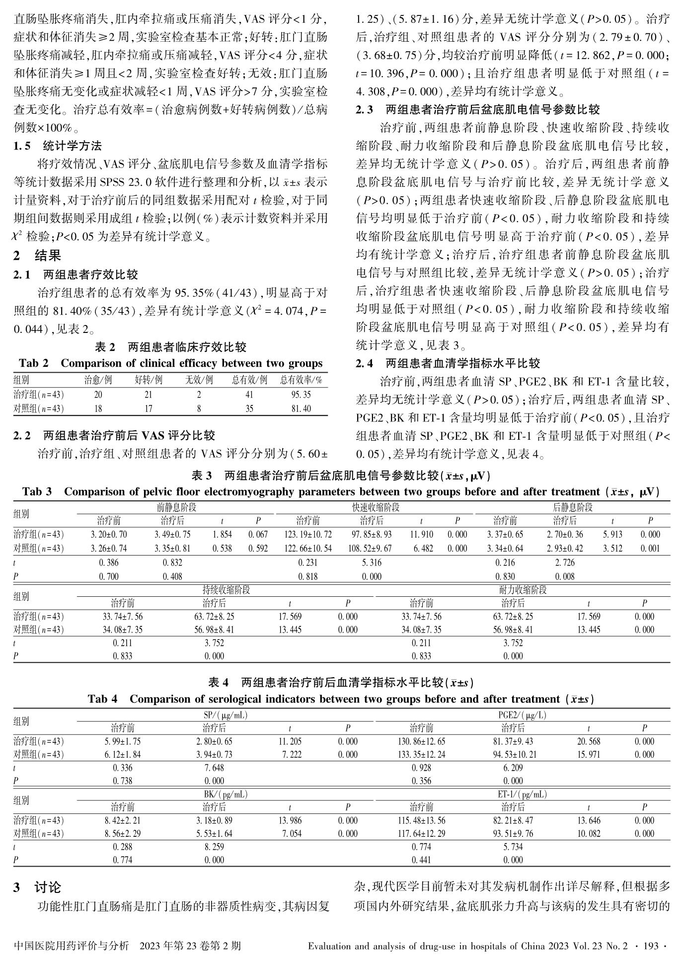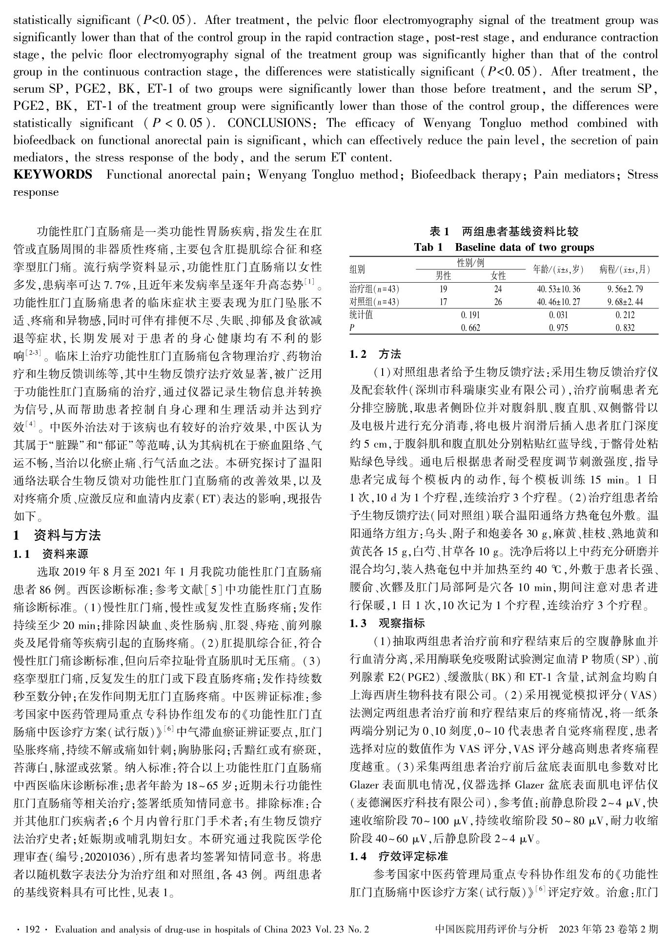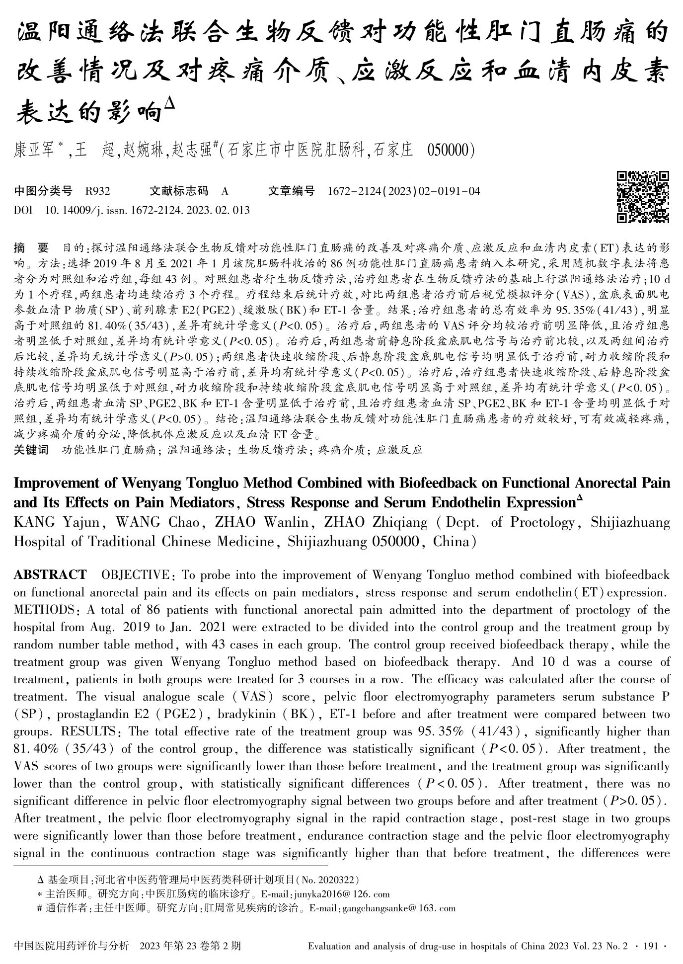 温阳通络法联合生物反馈对功能性肛门直肠痛的改善情况及对疼痛介质、应激反应和血清内皮素表达的影响
