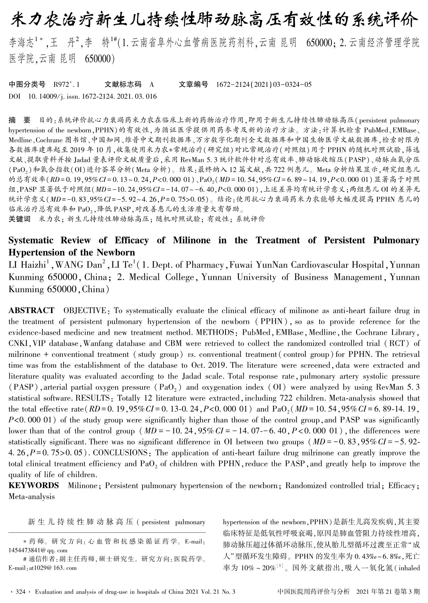 米力农治疗新生儿持续性肺动脉高压有效性的系统评价