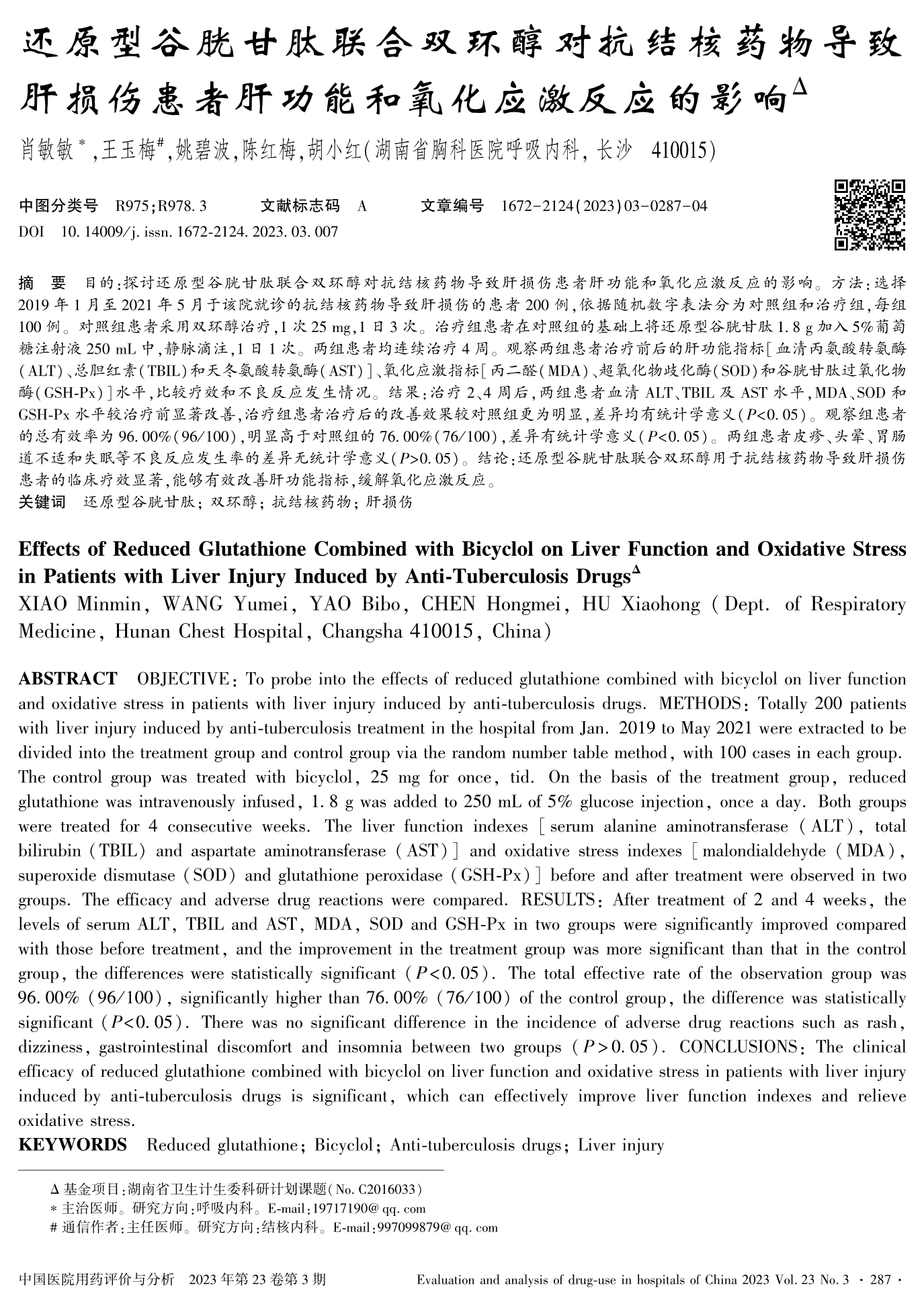 还原型谷胱甘肽联合双环醇对抗结核药物导致肝损伤患者肝功能和氧化应激反应的影响