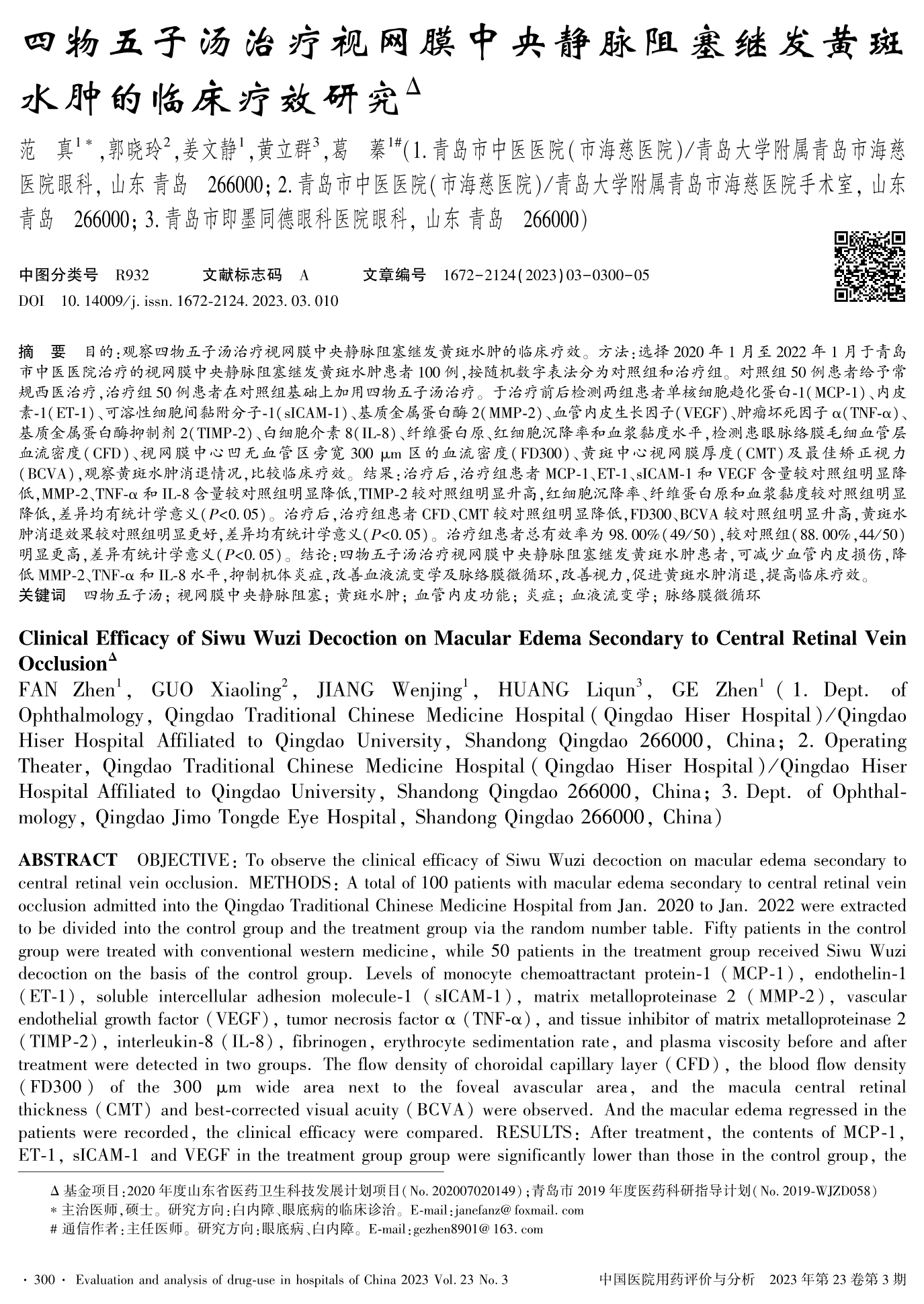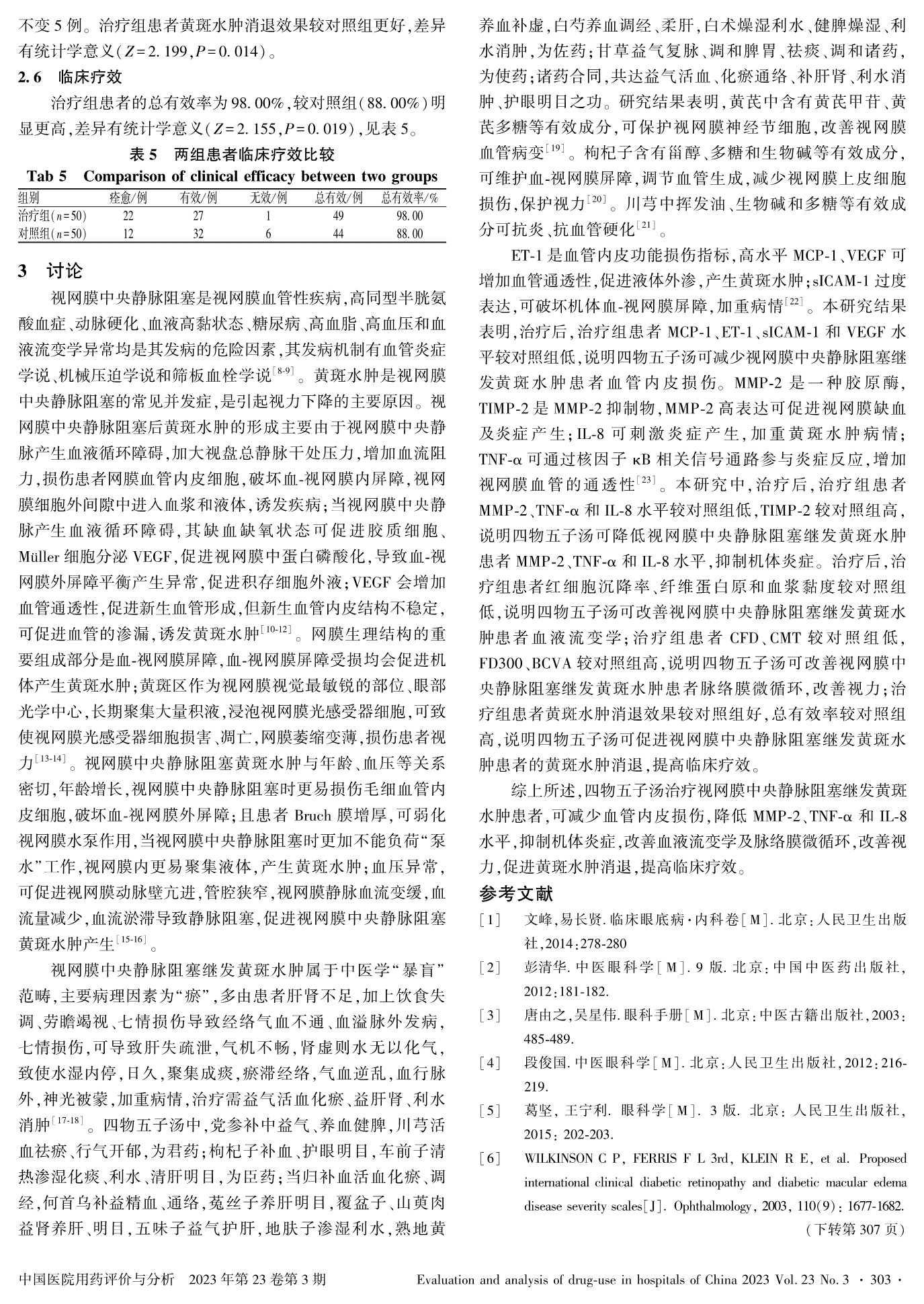 四物五子汤治疗视网膜中央静脉阻塞继发黄斑水肿的临床疗效研究