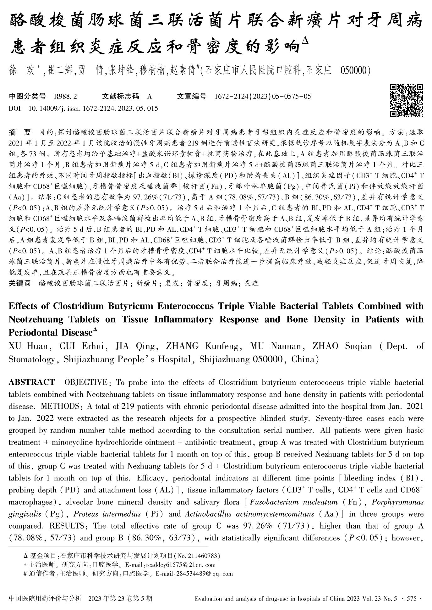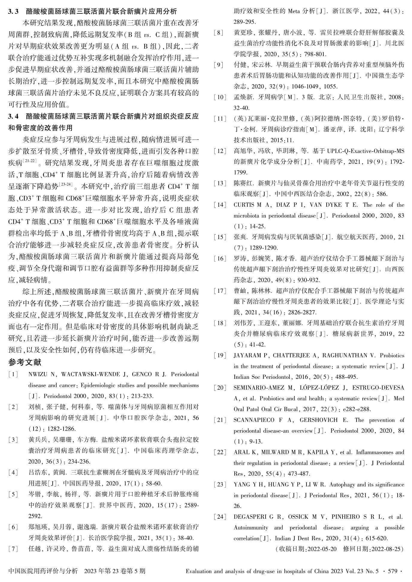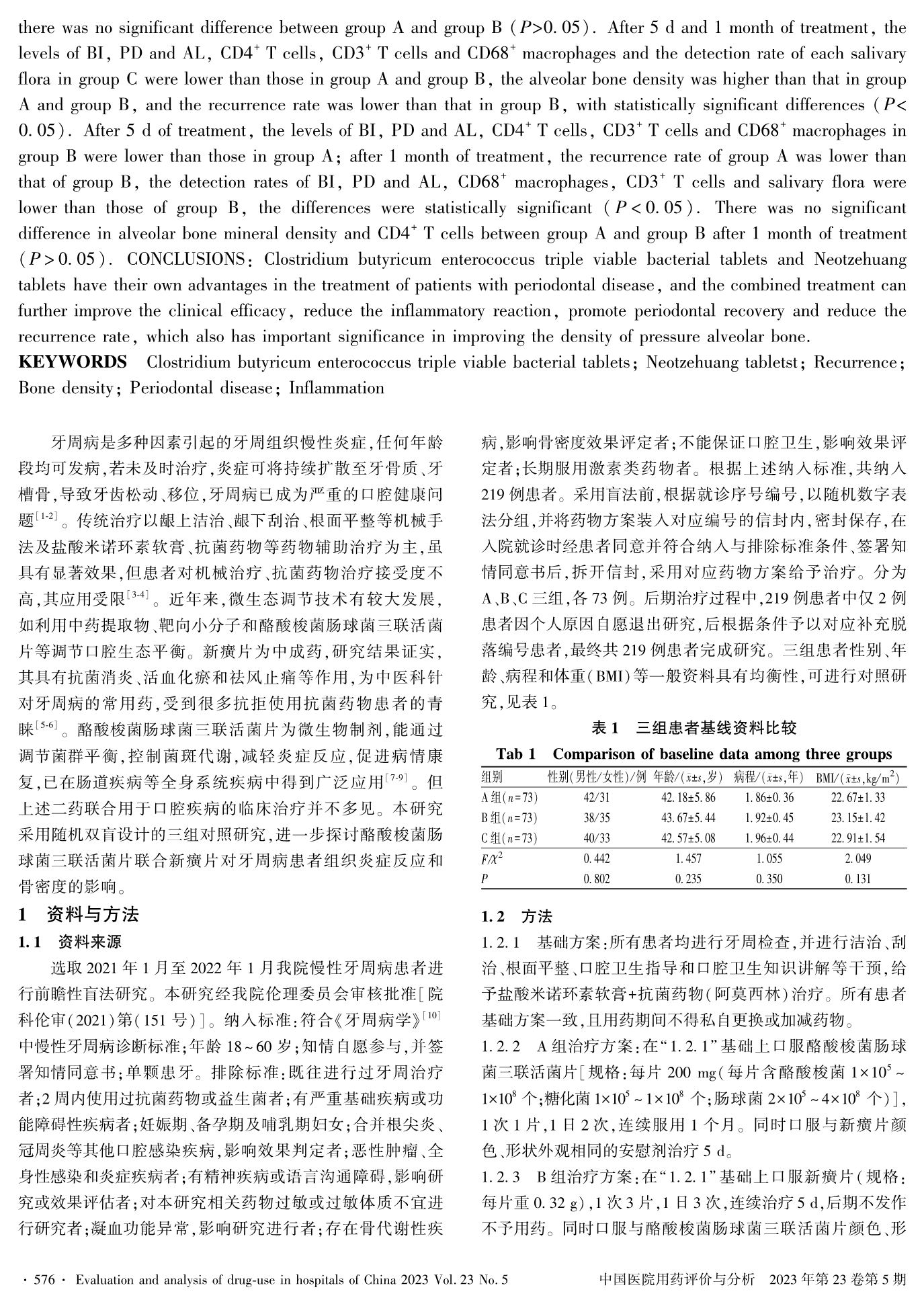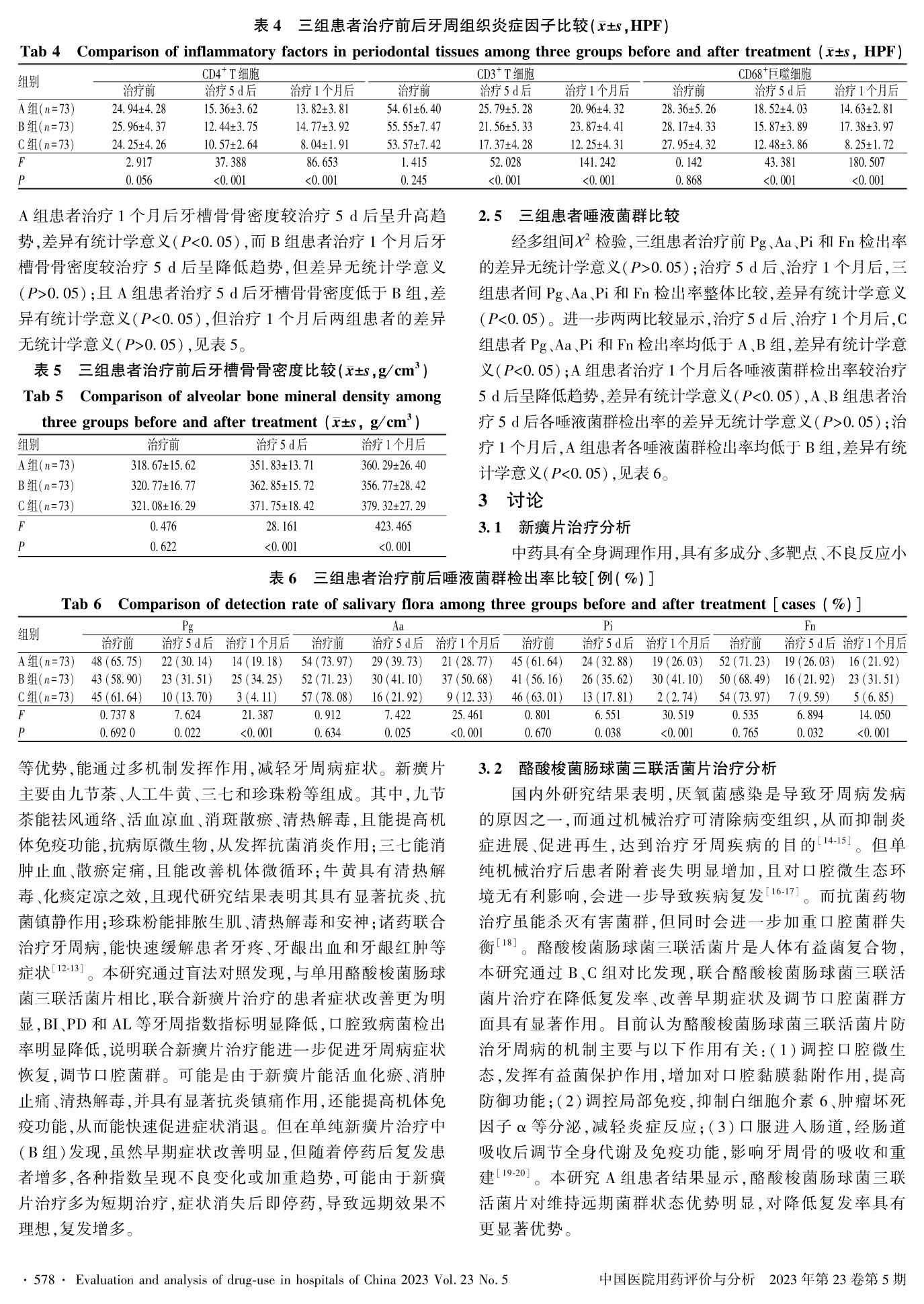 酪酸梭菌肠球菌三联活菌片联合新癀片对牙周病患者组织炎症反应和骨密度的影响