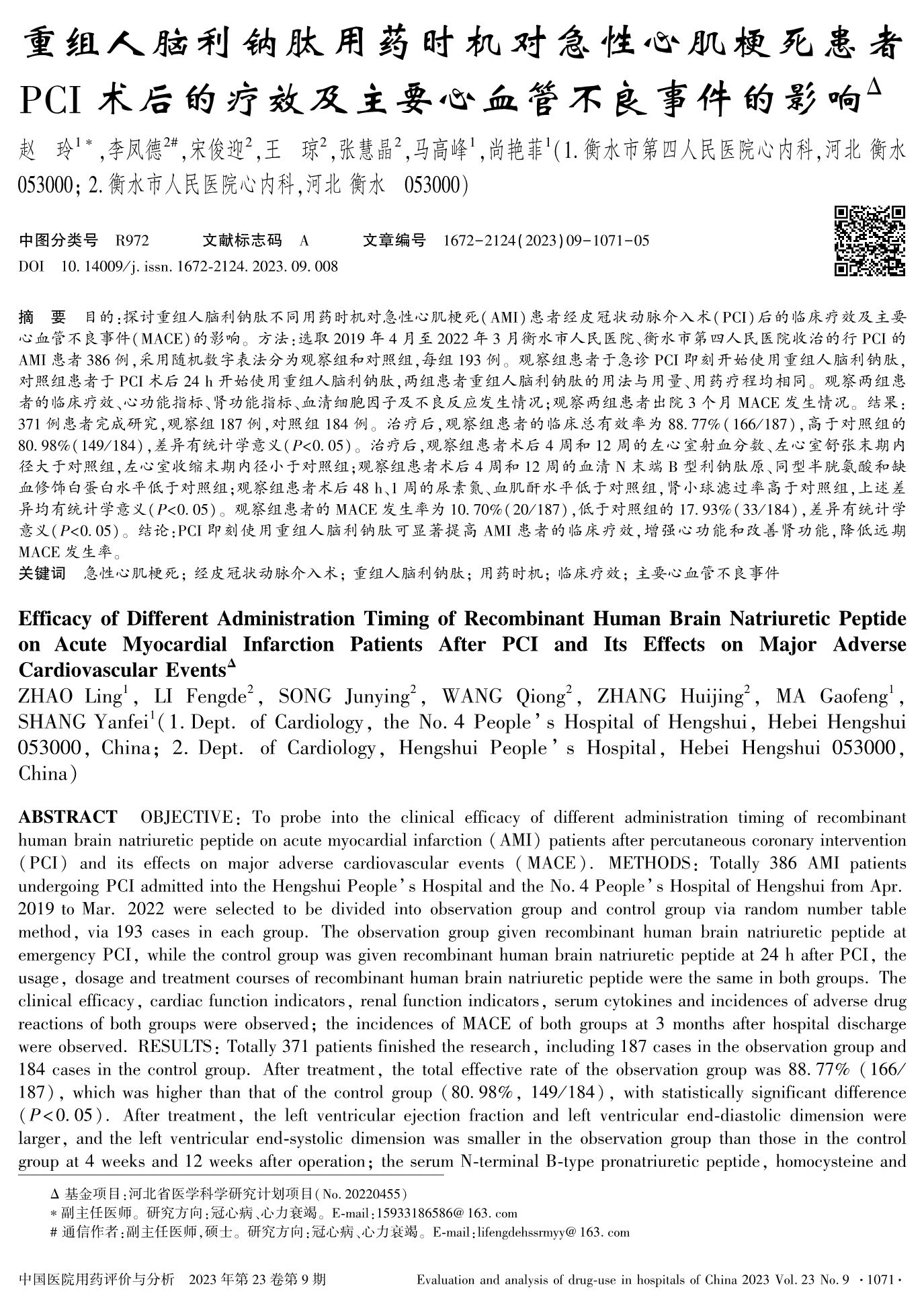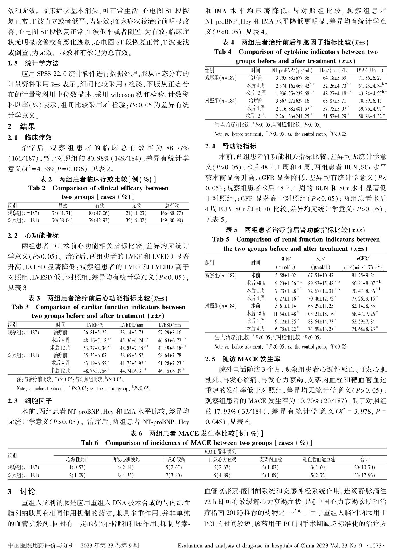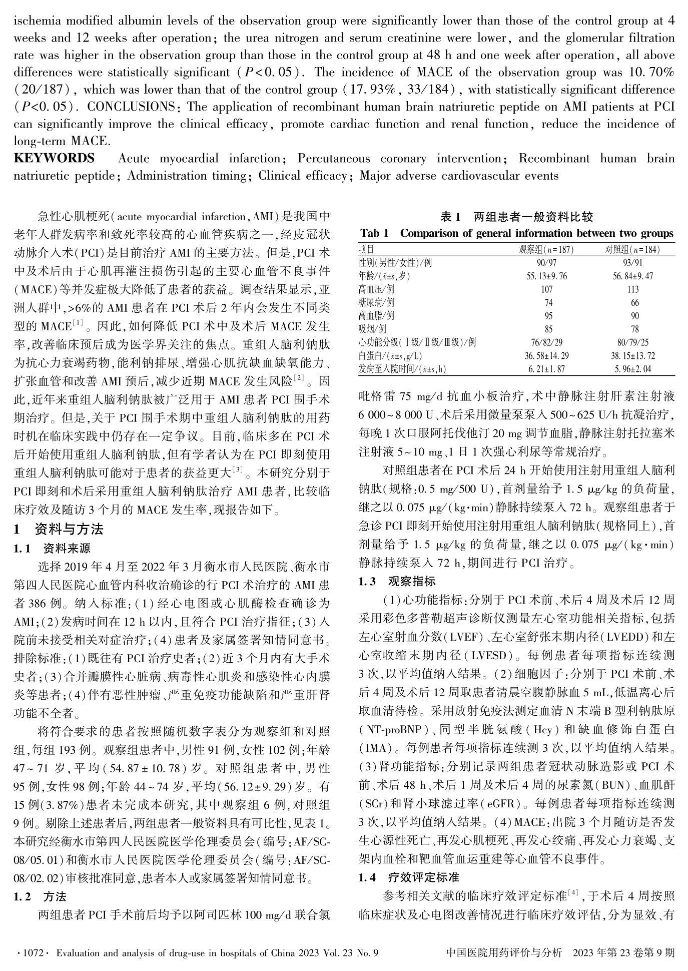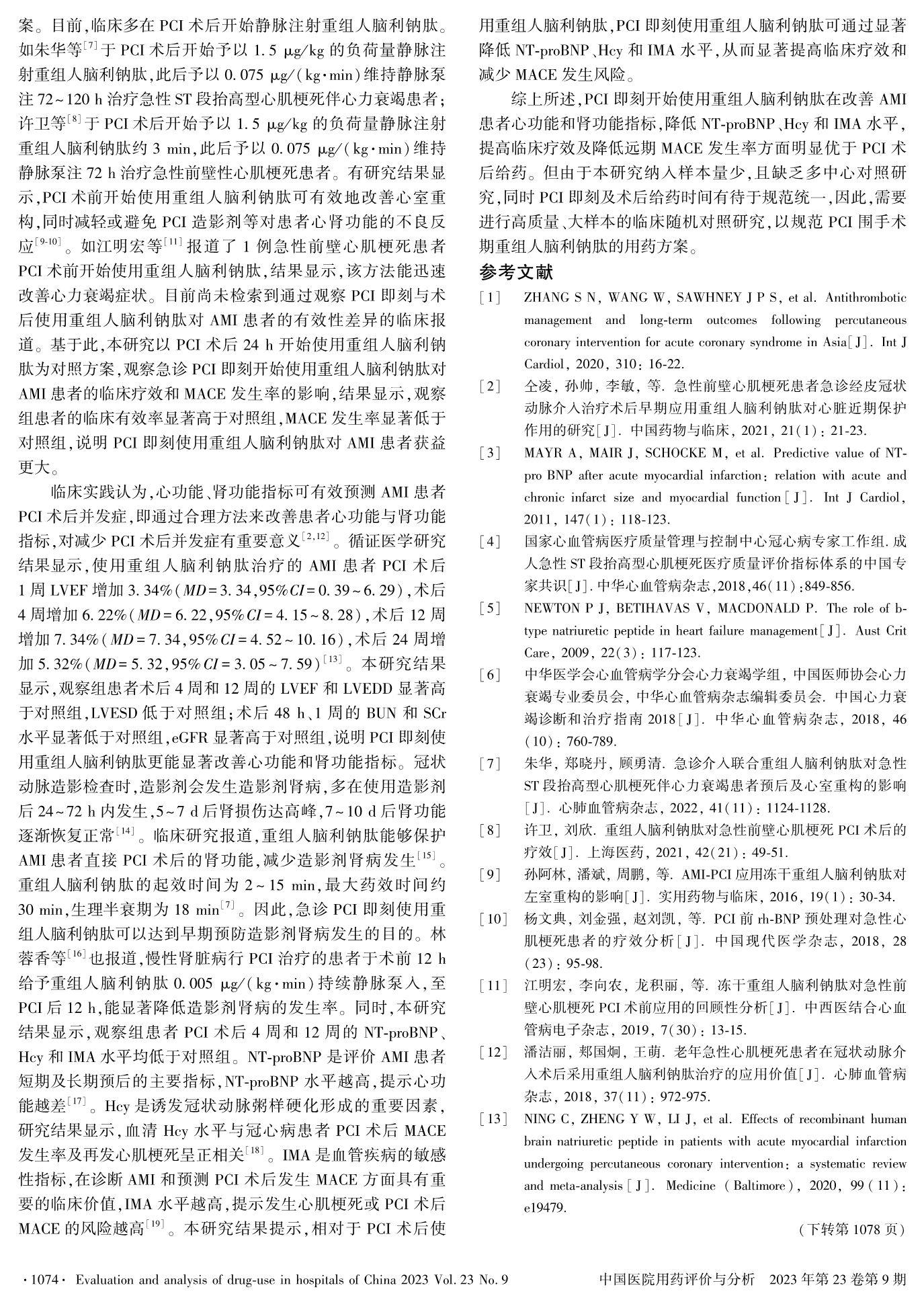 重组人脑利钠肽用药时机对急性心肌梗死患者PCI术后的疗效及主要心血管不良事件的影响